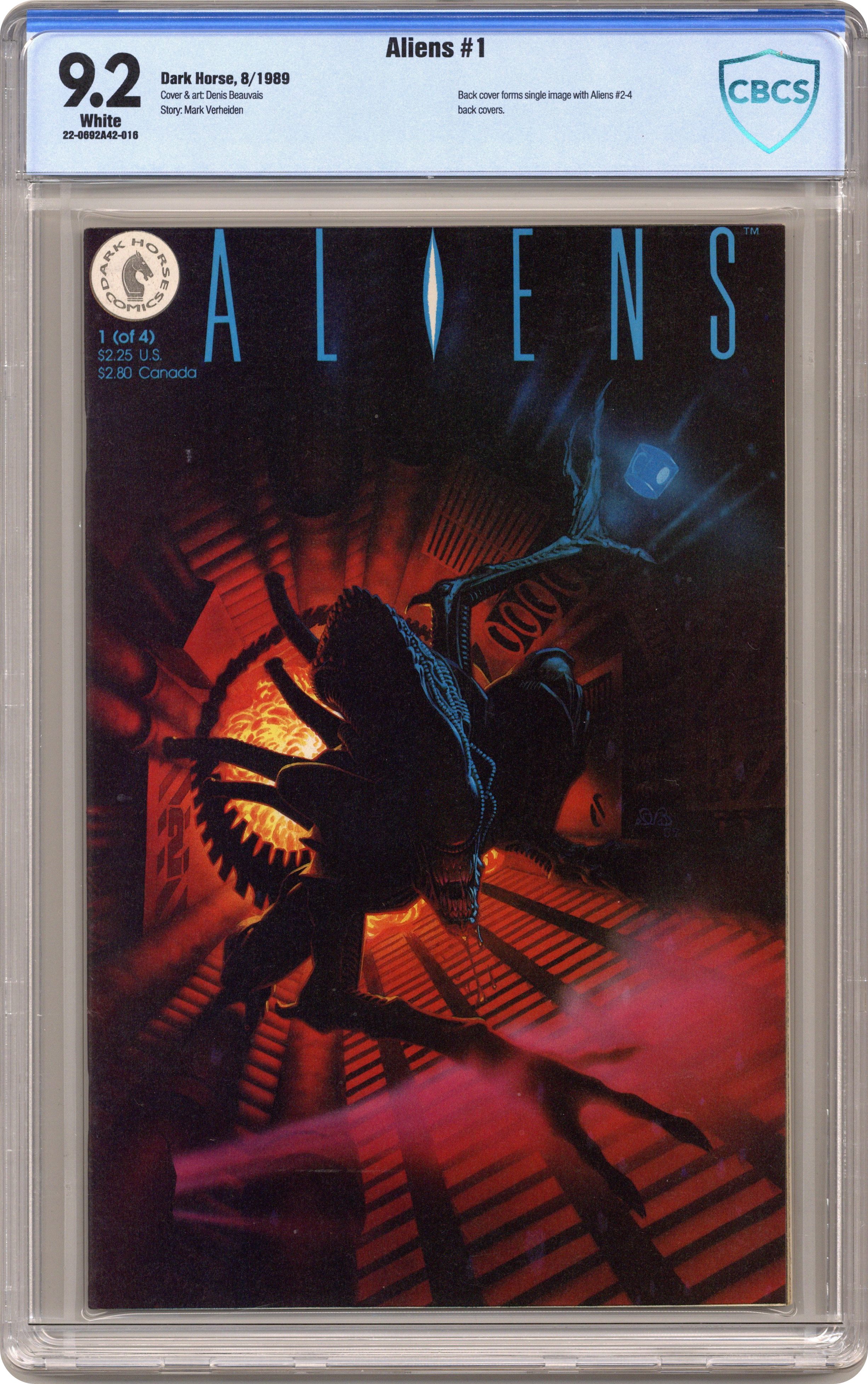 Written by Mark Verheiden. Art and cover by Denis Beauvais. The world goes mad for Hicks and Newt. In their desperate attempt to escape an Earth overrun with Aliens, their ship lands at a top secret Marine Base where a crazed General is attempting to train Aliens for use in battle! FC Cover price $2.25.