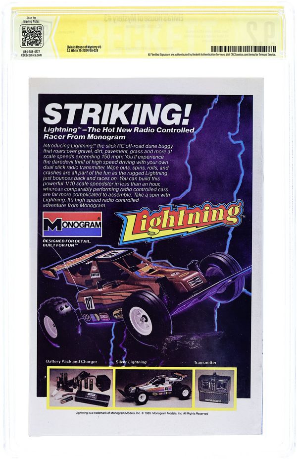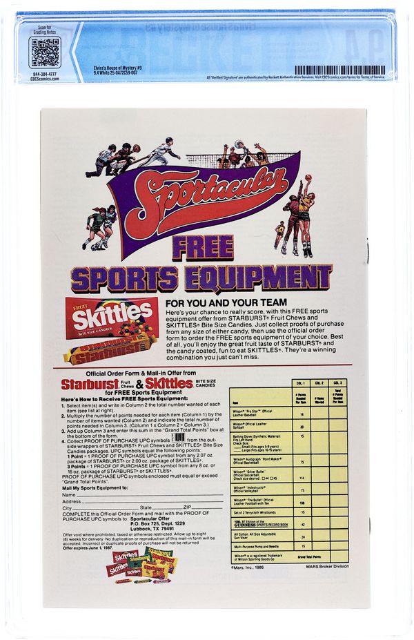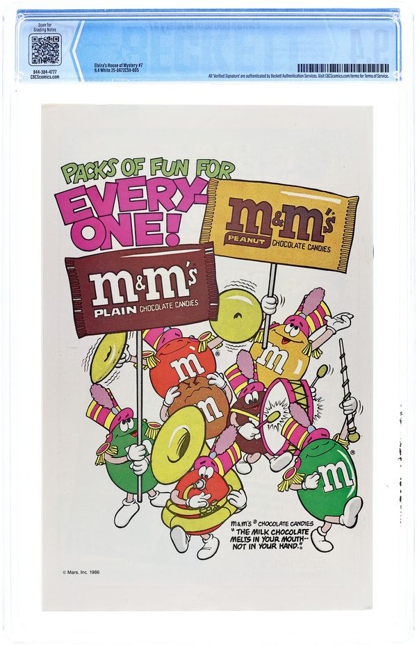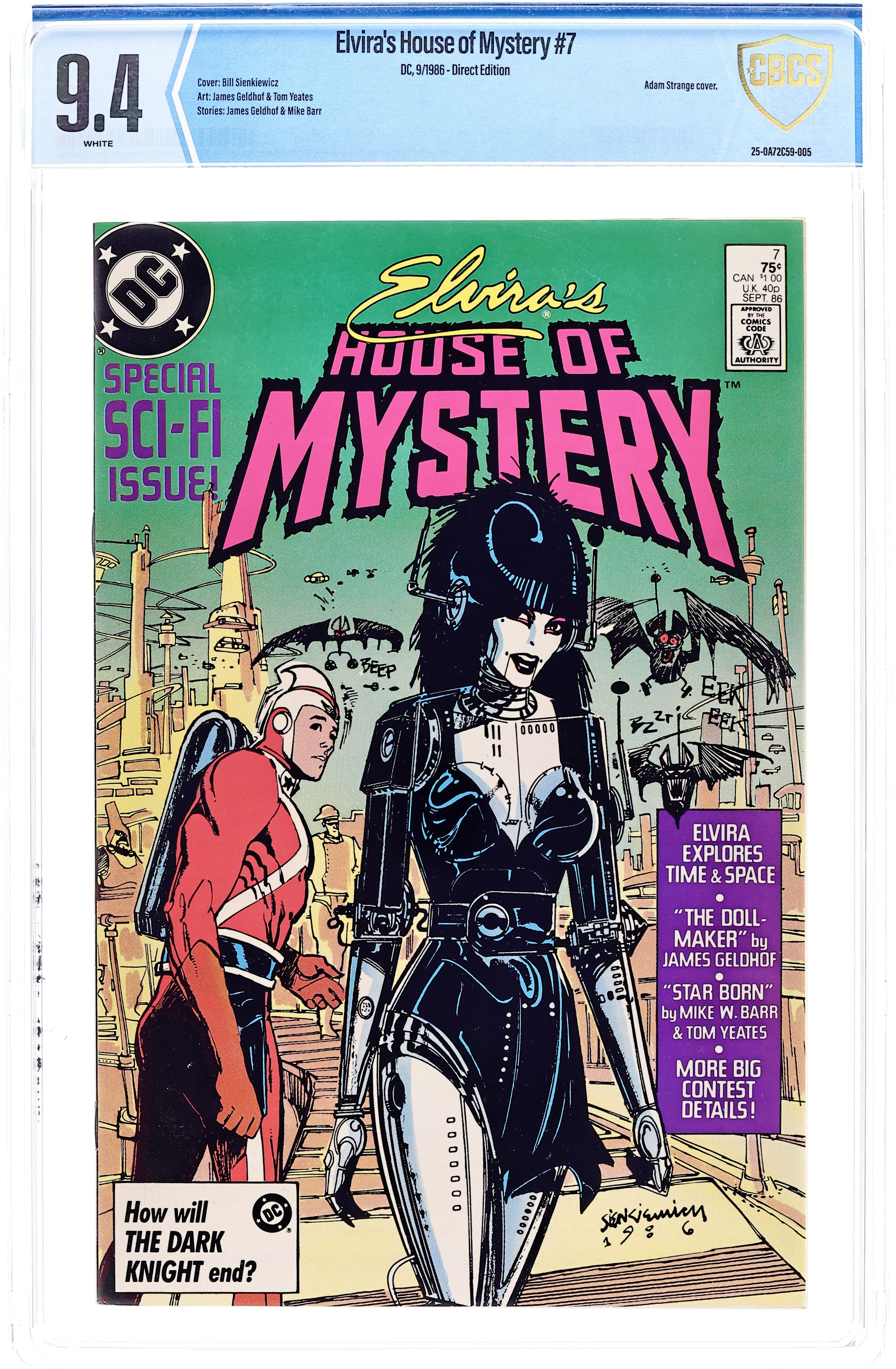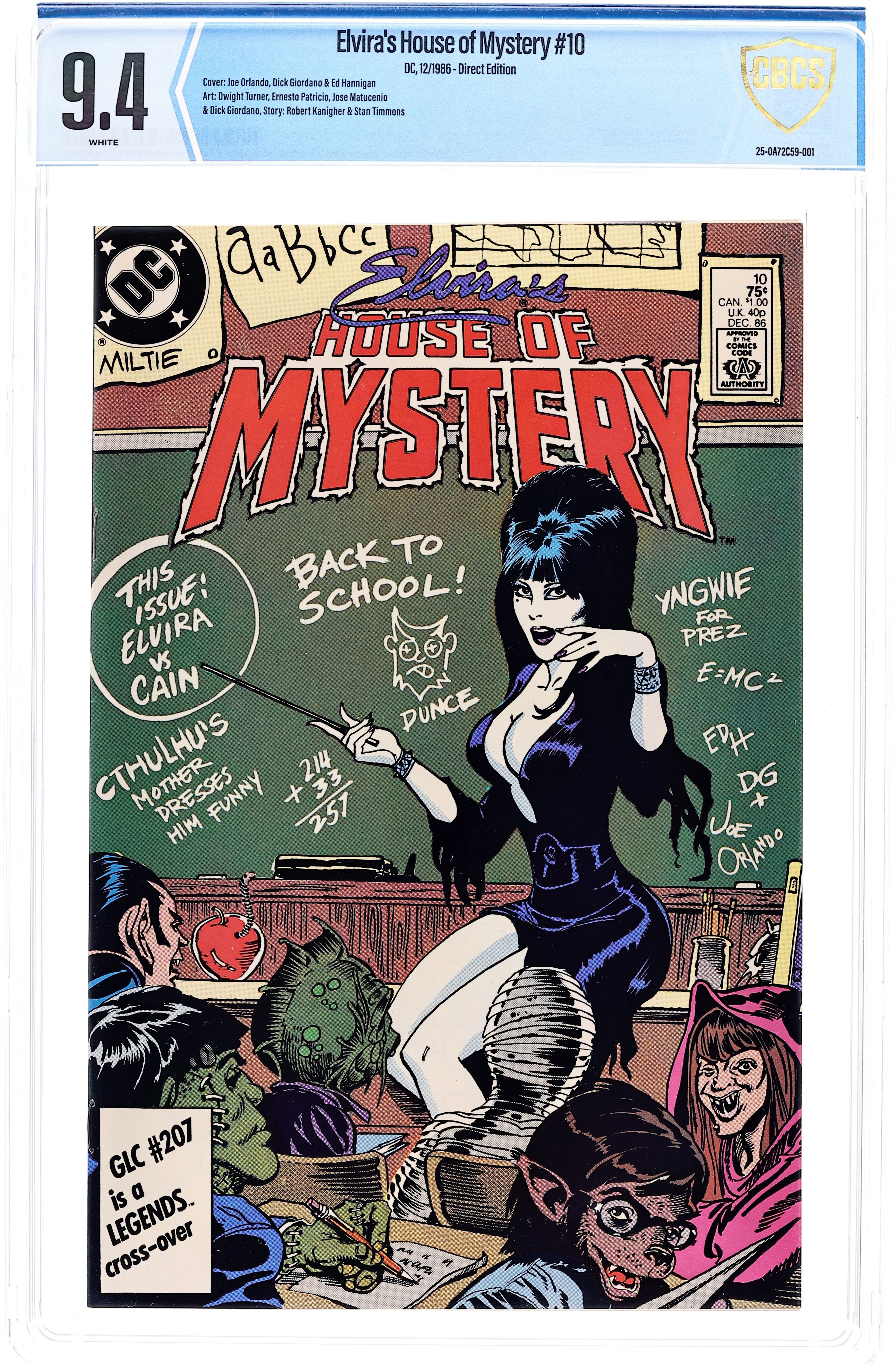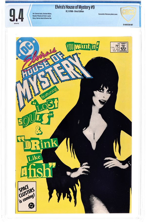 Direct Edition. 64-page Halloween Special. Cover art by Brian Bolland. Elvira inside front cover illustration by David Goldner. "Elvira's Quest," script by Joey Cavalieri, pencils by Ron Wagner, inks by Bob Oksner; The House of Mystery sends Elvira on a quest to find Cain. "The Realm," script by Philip Clarke, Jr., pencils by Tom Grindberg, inks by Irwin Hasen. "Death Likes a Lullaby," script by Robert Kanigher, art by Arthur Geroche. "Once Upon a Time," script by Dennis Yee, pencils by Dennis Yee, inks by Jim Fern, Dan Adkins, and Tex Blaisdell. "Vengeance in the Creature Feature!", script by Jack C. Harris, art by Dan Spiegle. "The Witch's Cauldron," script and art by Ma's Fay; A witch conjures up demons and a little boy conjures up Superman and Batman. Back cover and inside back cover photographs of Elvira. 68 pgs., full color. Cover price $1.50.