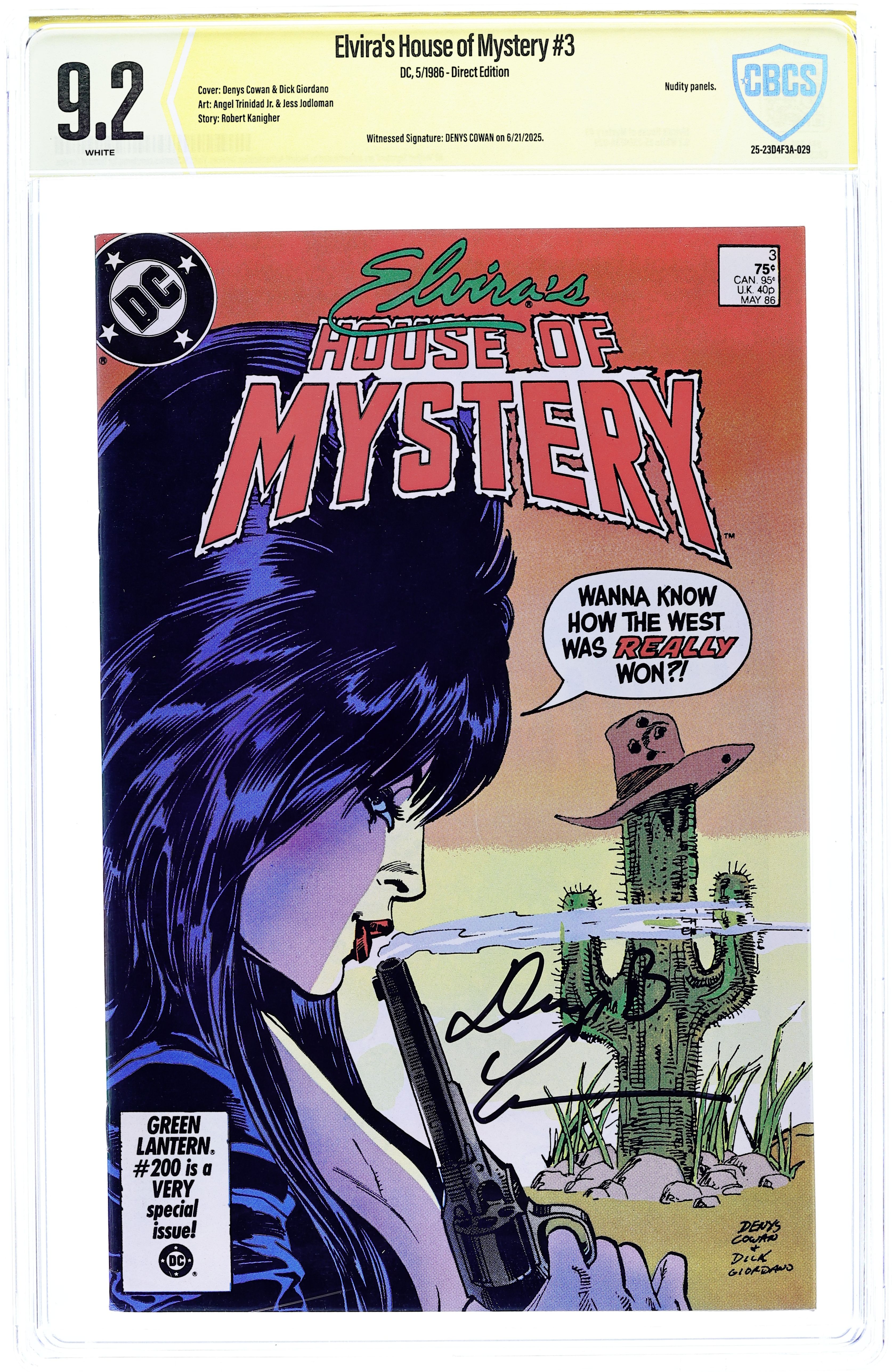 Direct Edition. Cover by Denys Cowan and Dick Giordano. Written by Robert Kanigher and Joey Cavalieri. Art by Angel Trinidad, Jr., Jess Jodloman, Stan Woch and Dick Giordano. Featuring "Ballad of Hanging Rock" by Robert Kanigher and Angel Trinidad, Jr., and "One Way Passage" by Kanigher and Jess Jodloman. Plus: Elvira goes to hell and back in "Retribution," a framing sequence by Joey Cavalieri, Stan Woch and Dick Giordano. 32 pages, full color. Note: This issue was not approved by the Comics Code Authority. Cover price $0.75.