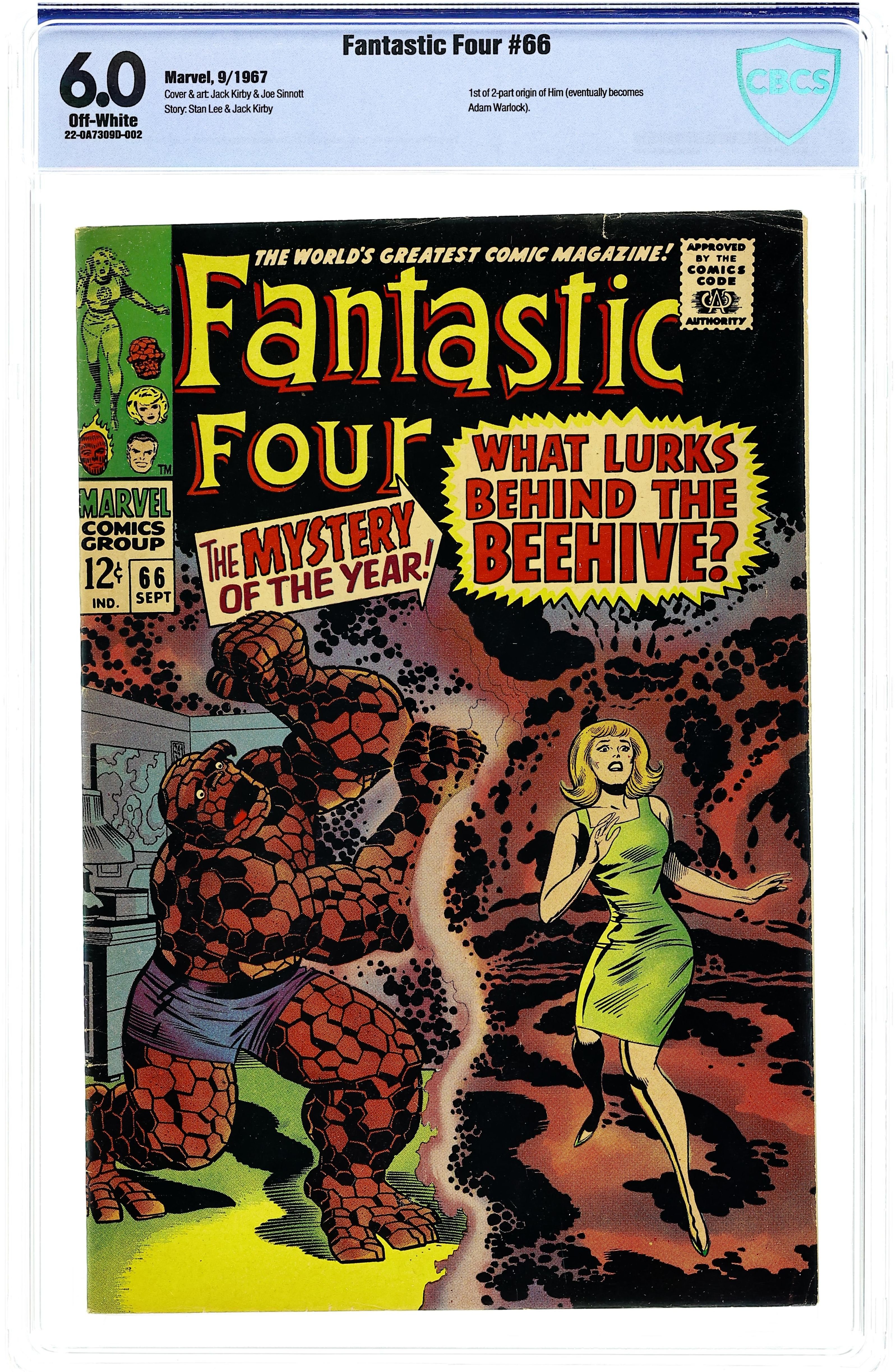 1st printing. Cover pencils by Jack Kirby, inks by Joe Sinnott. The origin of Him (Warlock), part 1 (though he does not appear in this issue) in "What Lurks Behind the Beehive?", script by Stan Lee and Jack Kirby (co-plot), pencils by Jack Kirby, inks by Joe Sinnott; The scientists of the Beehive have kidnapped Alicia Masters and the FF search for her. 36 pgs. $0.12. NOTE: 1994 JC Penney reprint exists. Can be identified by having a Stridex ad on the back cover. Cover price $0.12.