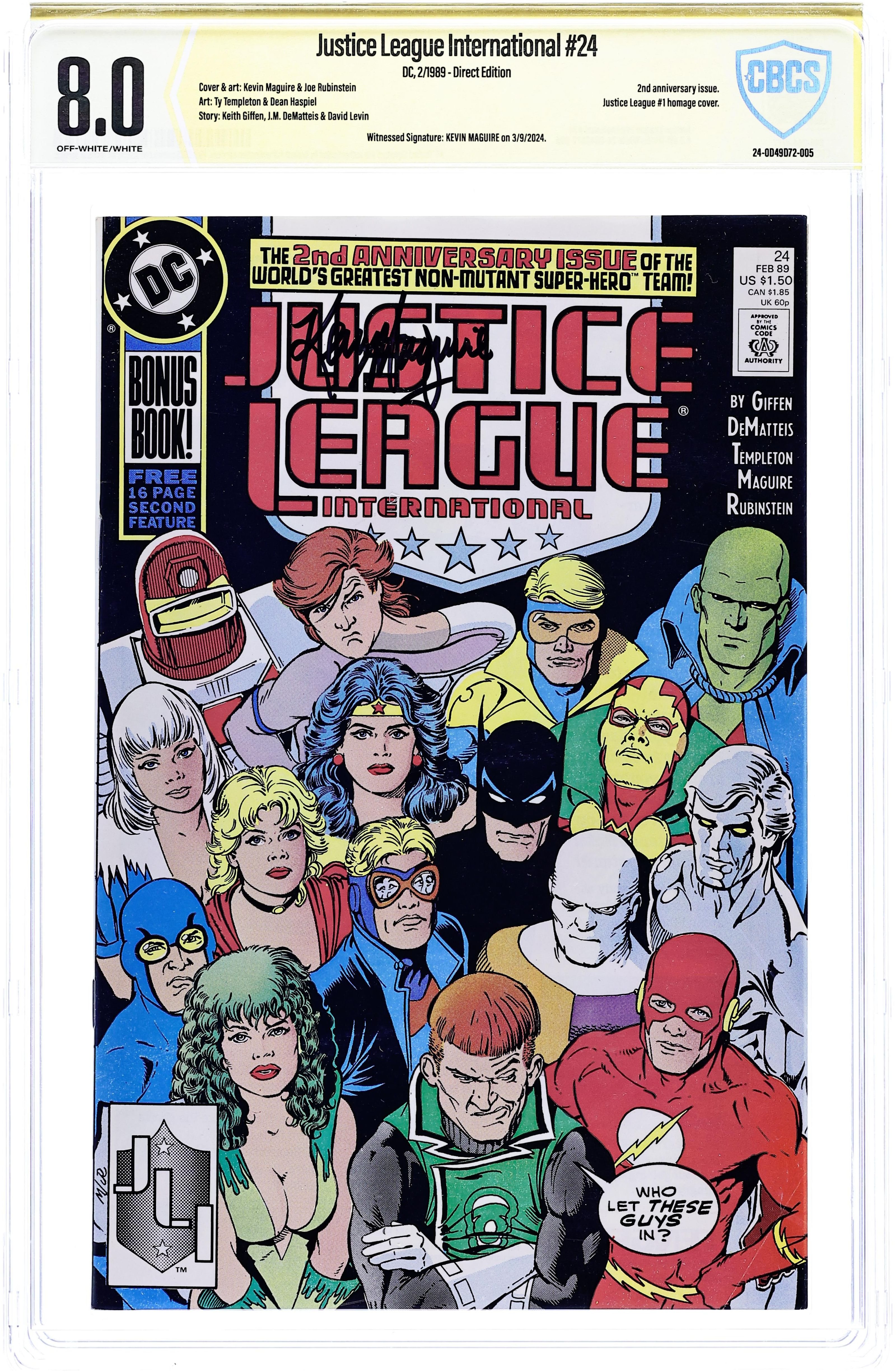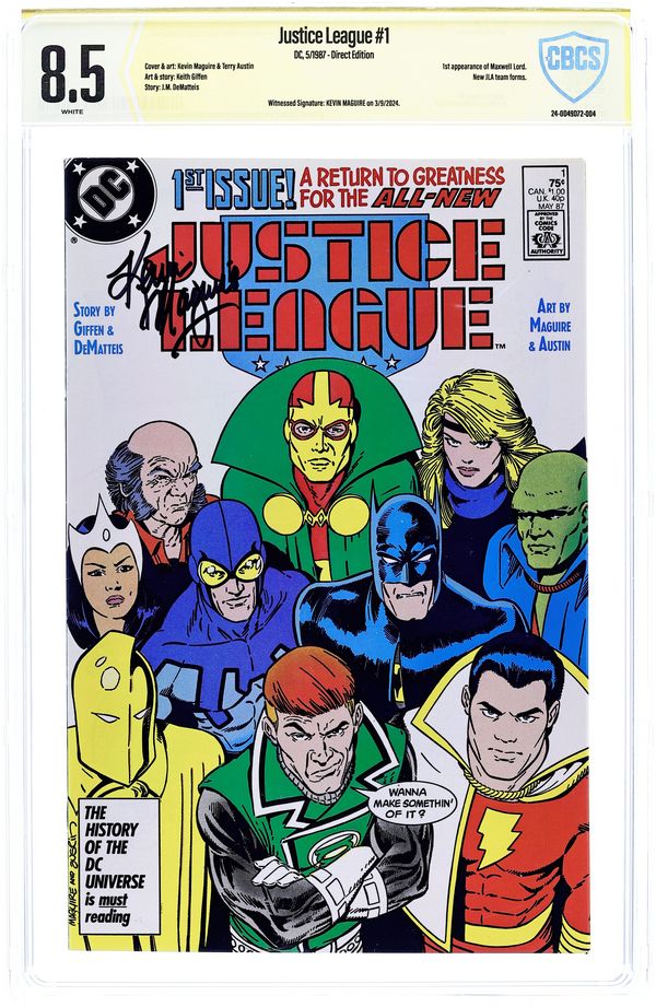 Direct Edition. When terrorists take the U.N. General Assembly hostage, Doctor Light (Kimiyo Hoshi) calls on the newly formed Justice League for help in "Born Again". Plot and breakdowns by Keith Giffen, script by Giffen and J.M. DeMatteis, pencils by Kevin Maguire, inks by Terry Austin. Batman, Guy Gardner, Black Canary, Mr. Miracle, Oberon, Captain Marvel, Martian Manhunter, Blue Beetle, Dr. Fate, Maxwell Lord. Maguire/Austin cover. Cover price $0.75.
