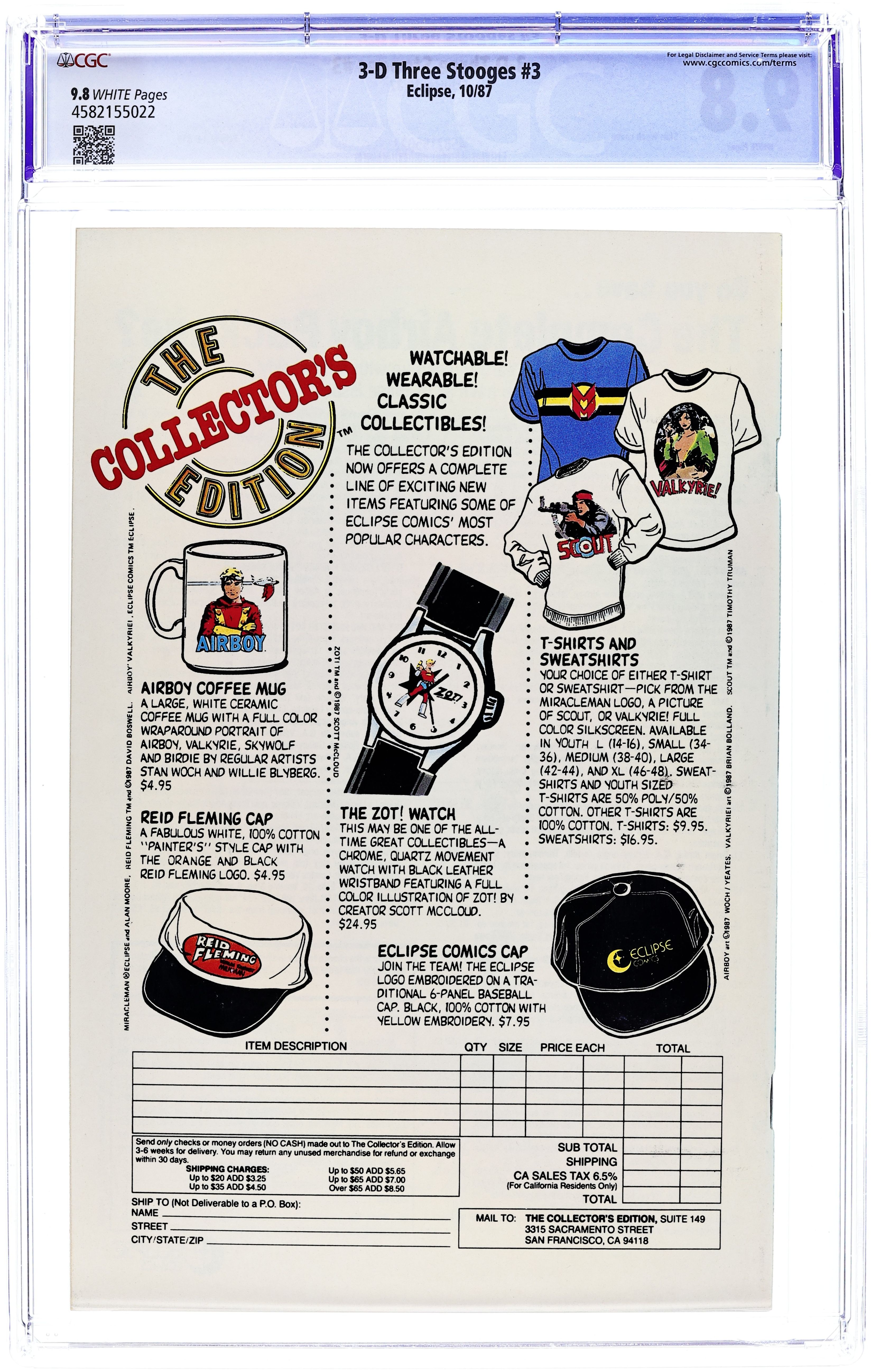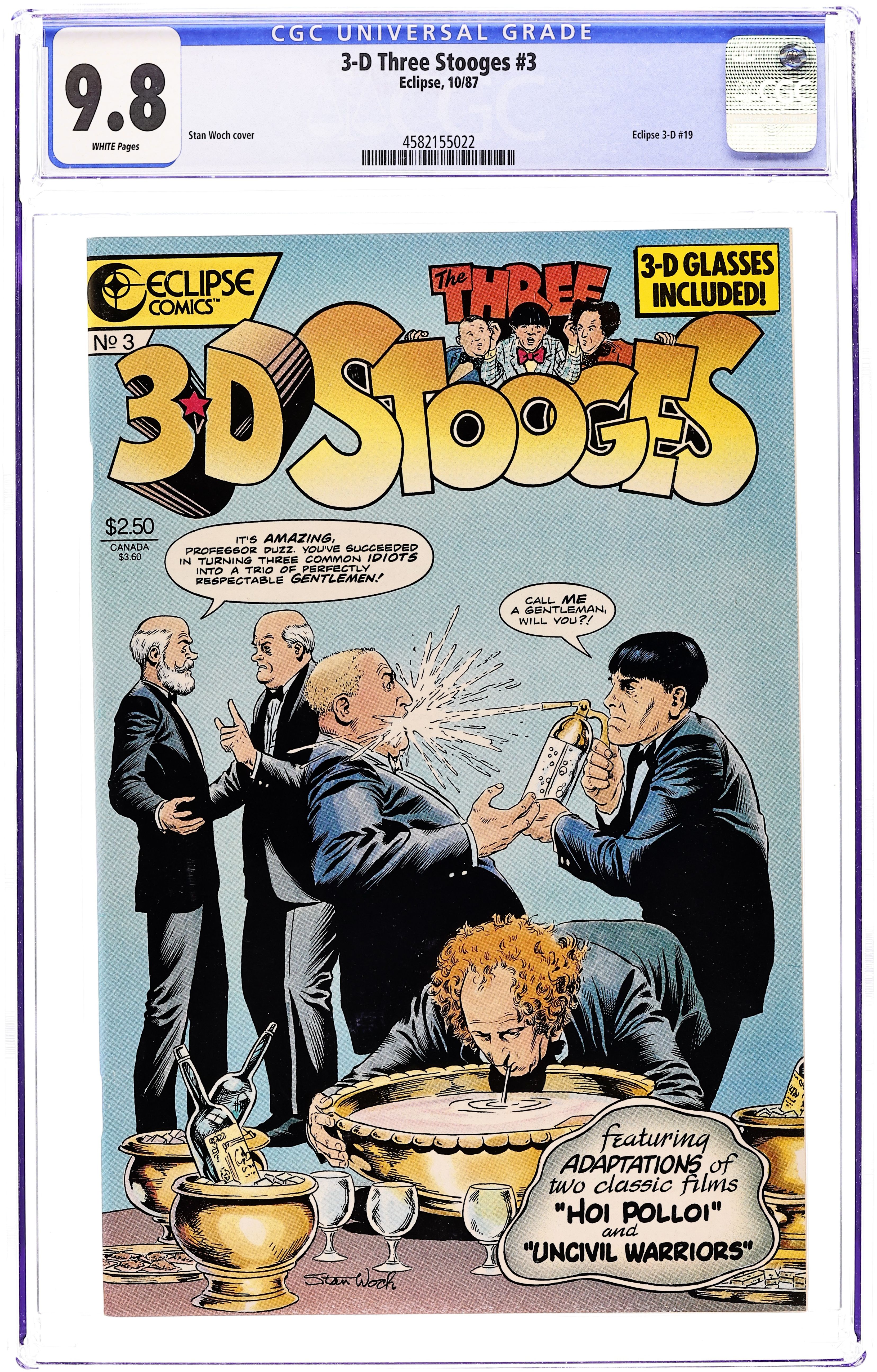 Eclipse 3-D Special #19. 3-D glasses included. Eclipse 3-D Special #19. Cover by Stan Woch. Written by Norman Maurer and unknown. Art by Norman Maurer and unknown. 3-D effects by Ray Zone. Featuring adaptations of two classic films, reprinted from Three Stooges (1949 Jubilee) #1. In the first story, the Stooges (Moe Howard, Larry Fine, Curly Howard) are unconvincing Confederate spies in "Uncivil Warriors"! And in the second tale, the Stooges are transformed into gentlemen and mingle with the upper-crusters in "Hoi Polloi"! Plus: Keyhole Kasey (a spoof of Dick Tracy) in "Dead As a Doornail"! And: "The 3-D-T's"! 32 pages, 3-D effects. Cover price $2.50.