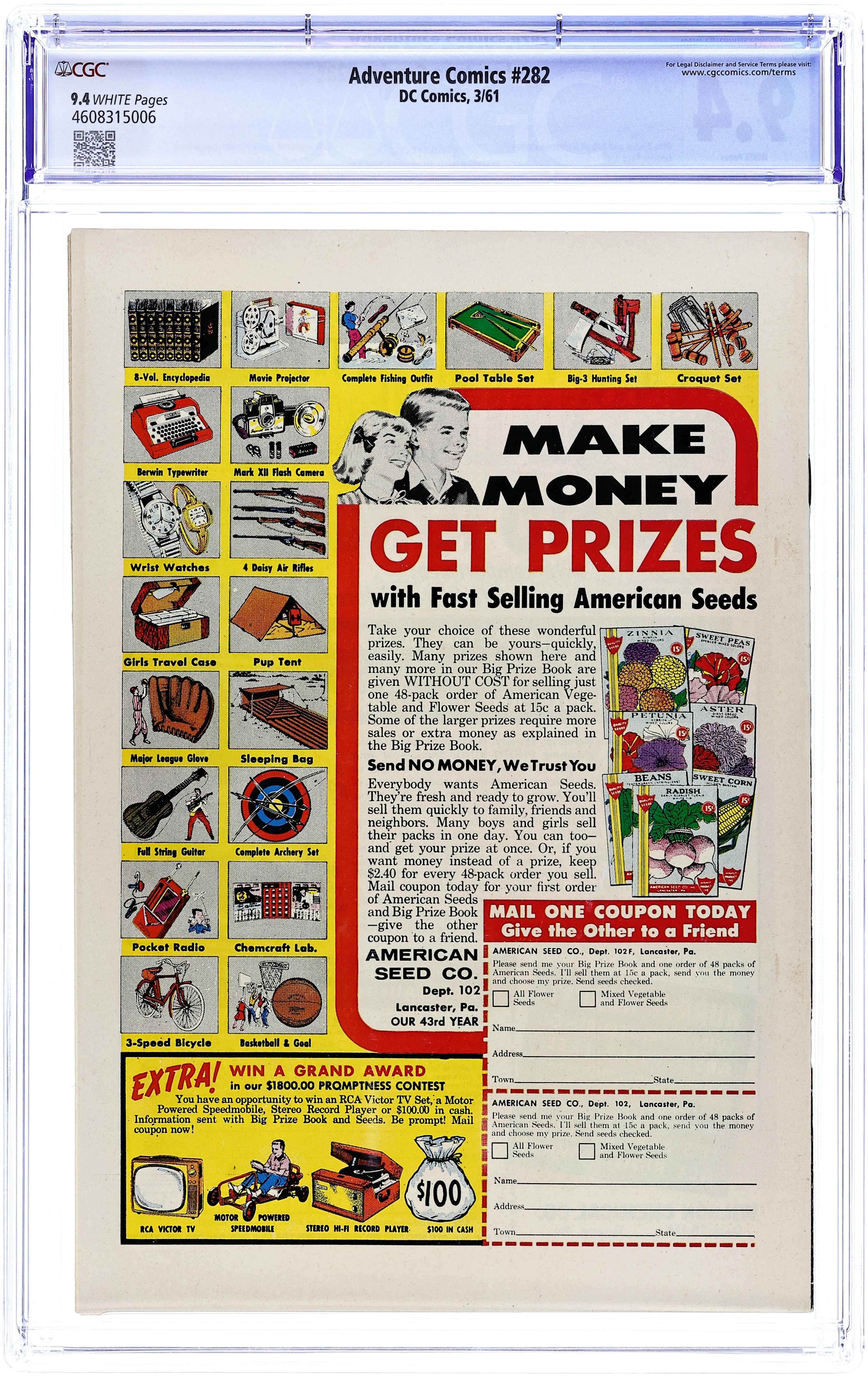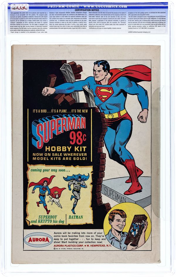 Cover pencils by Curt Swan, inks by Stan Kaye. 1st appearance of the Phantom Zone in The Phantom Superboy, script by Robert Bernstein, art by George Papp; After Professor Lang finds a box of Kryptonian weapons, Superboy is accidentally projected into the Phantom Zone, the place where Kryptonian criminals were exiled. A Salute to Our American Indians public service announcement, script by Jack Schiff, art by Bernard Baily. The Lion with the Double Identity starring Congorilla, script by Robert Bernstein, art by Howard Sherman. Little Pete humor page by Henry Boltinoff. 36 pages, Full Color. Cover price $0.10.