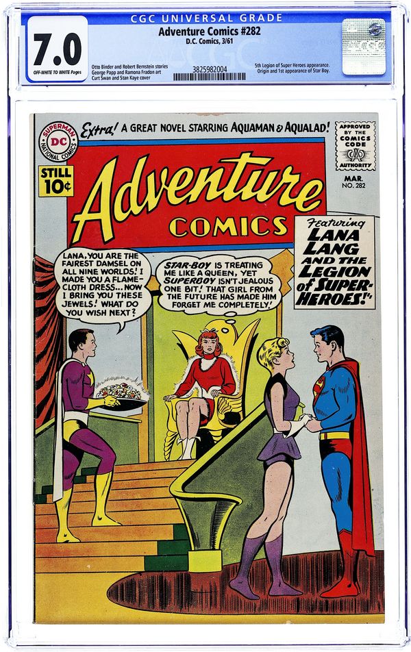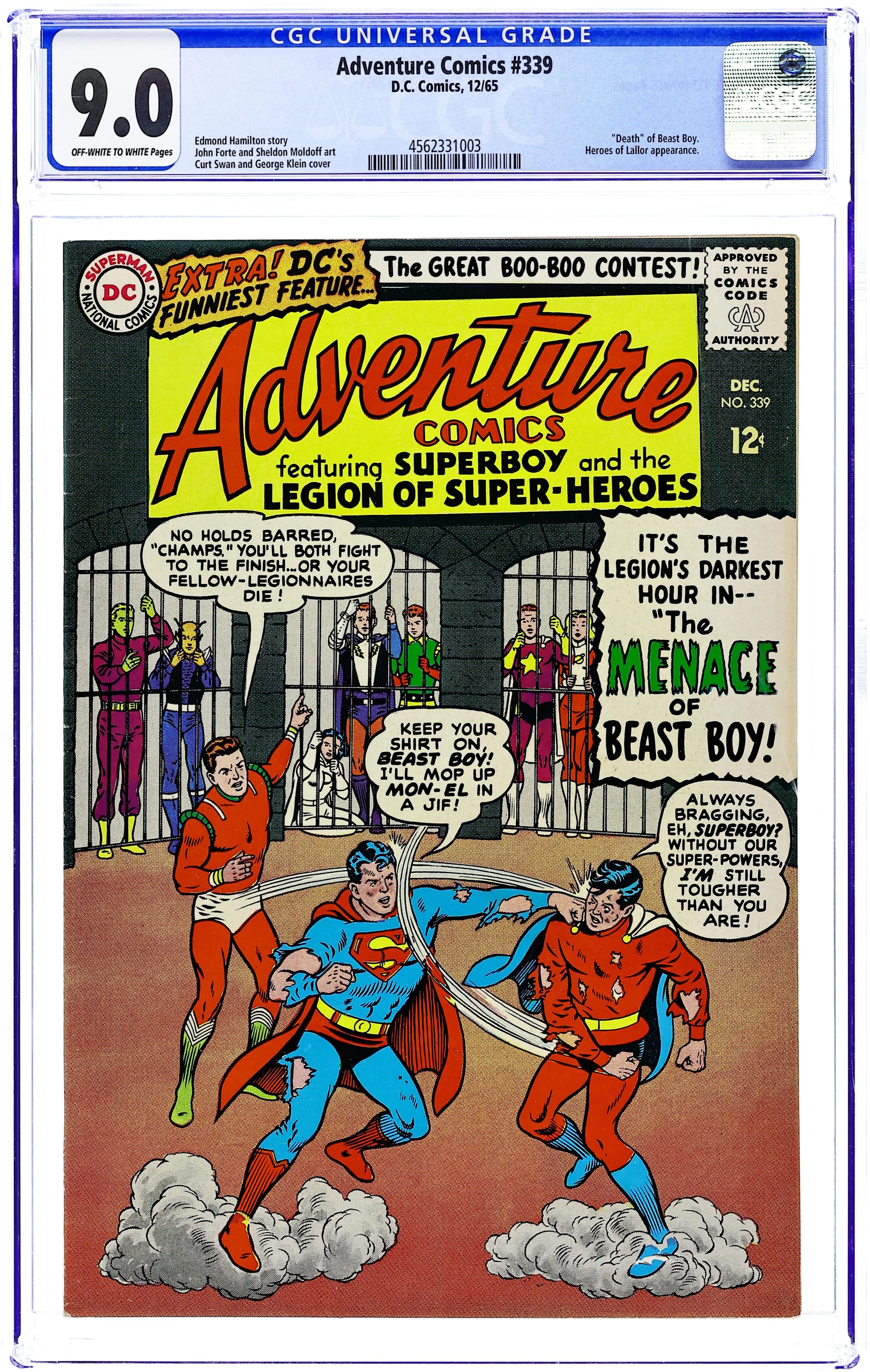 Cover pencils by Curt Swan, inks by George Klein. Part I: The Menace of Dream Girl!--Tales of the Legion of Super-Heroes, script by Edmond Hamilton, art by John Forte; Dream Girl joins the Legion and insists Lightning Lass be expelled when she loses her powers and demands Triplicate Girl be court-martialed for accusing her of causing Lightning Lass to lose her power. Super-Turtle humor page by Henry Boltinoff. Part II: The Doom of the Legion!--Tales of the Legion of Super-Heroes, script by Edmond Hamilton, art by John Forte; Even more Legionnaires are expelled before Dream Girl reveals to Star Boy that it was all a plot to prevent their deaths. In this two-parter, Lightning Lass becomes Light Lass, and the Hall of Fame series begins.The Shrinking of Superboy, art by John Sikela. 36 pages, Full Color. Cover price $0.12.