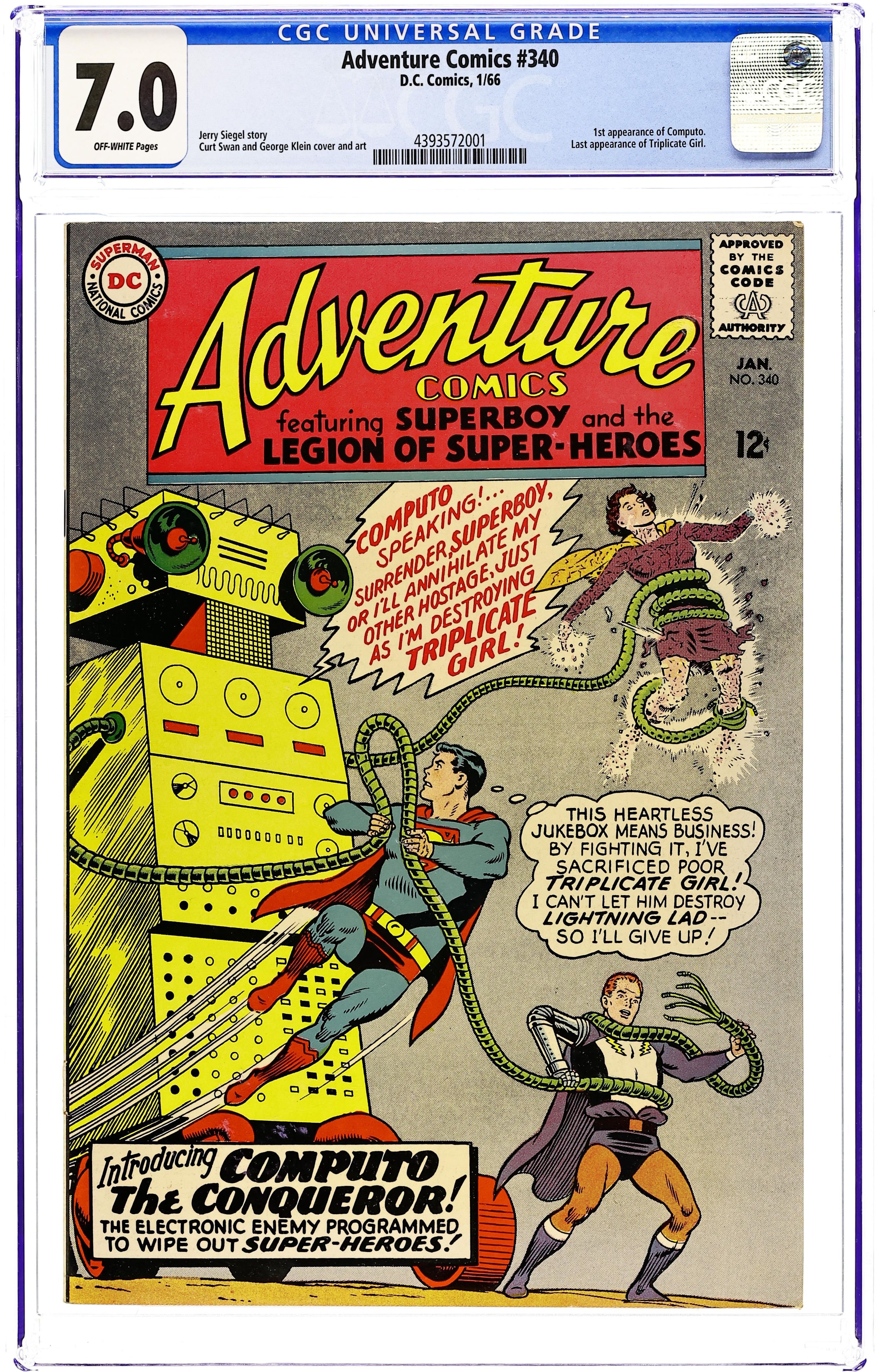 Cover pencils by Curt Swan, inks by George Klein. Intro of Computo in Computo the Conqueror!--Tales of the Legion of Super-Heroes, script by Jerry Siegel, pencils by Curt Swan, inks by George Klein; Brainiac 5's latest creation turns on its master and the rest of the Legion. Mystery of the Space Trophies starring Superboy, script by Otto Binder, pencils by John Sikela, inks by John Sikela. Rocky and Bullwinkle star in a one-page Cheerios ad. 36 Pages, Full Color. Cover price $0.12.