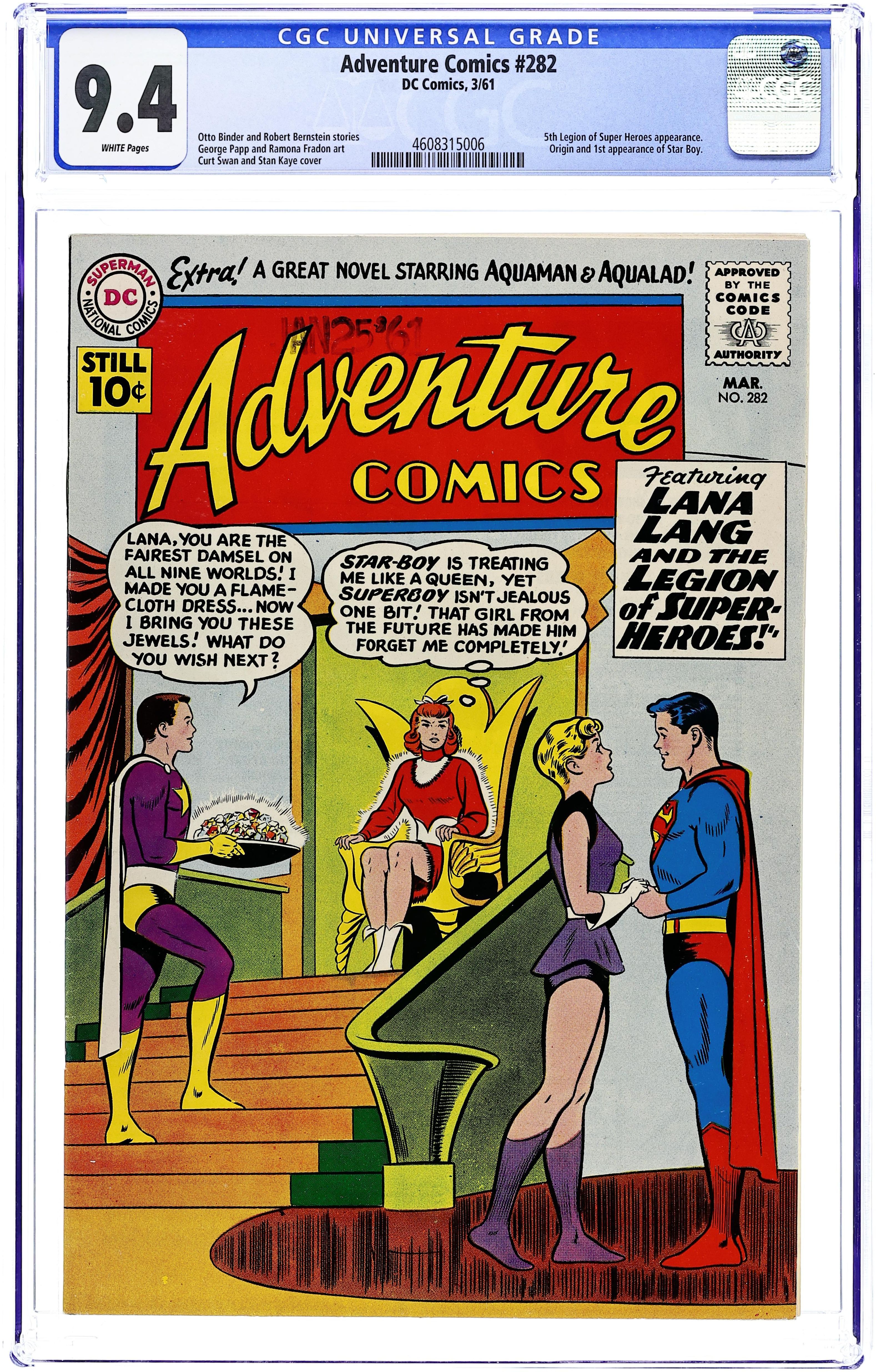 Cover pencils by Curt Swan, inks by George Klein. The Super-Planet of Clark Kent and Lana Lang, art by George Papp; Lana and Clark are accidentally transported to a strange world where Clark must make her think they both have superpowers in order to prevent her from guessing he's Superboy. House ad for Superman Annual #5. Tales of the Legion of Super-Heroes series begins in The Face Behind the Lead Mask!, script by Jerry Siegel, pencils by John Forte, Al Plastino (page 4 and some Superboy and Luthor heads only), inks by John Forte and Al Plastino; At a regular meeting of the Legion of Super-Heroes, the Legionnaires lose control of their powers; Mon-el joins the Legion. 36 pages, Full Color. Cover price $0.12.