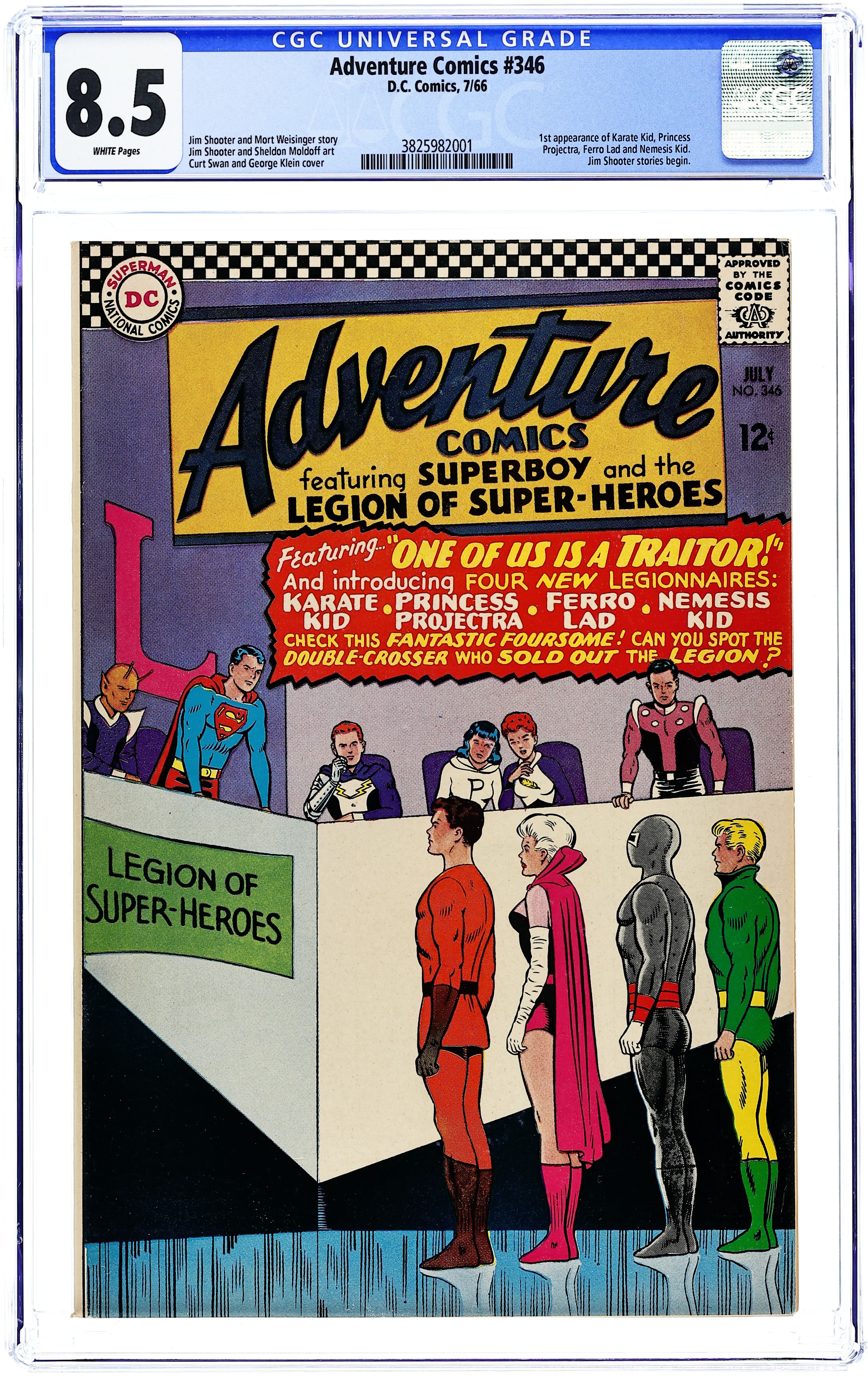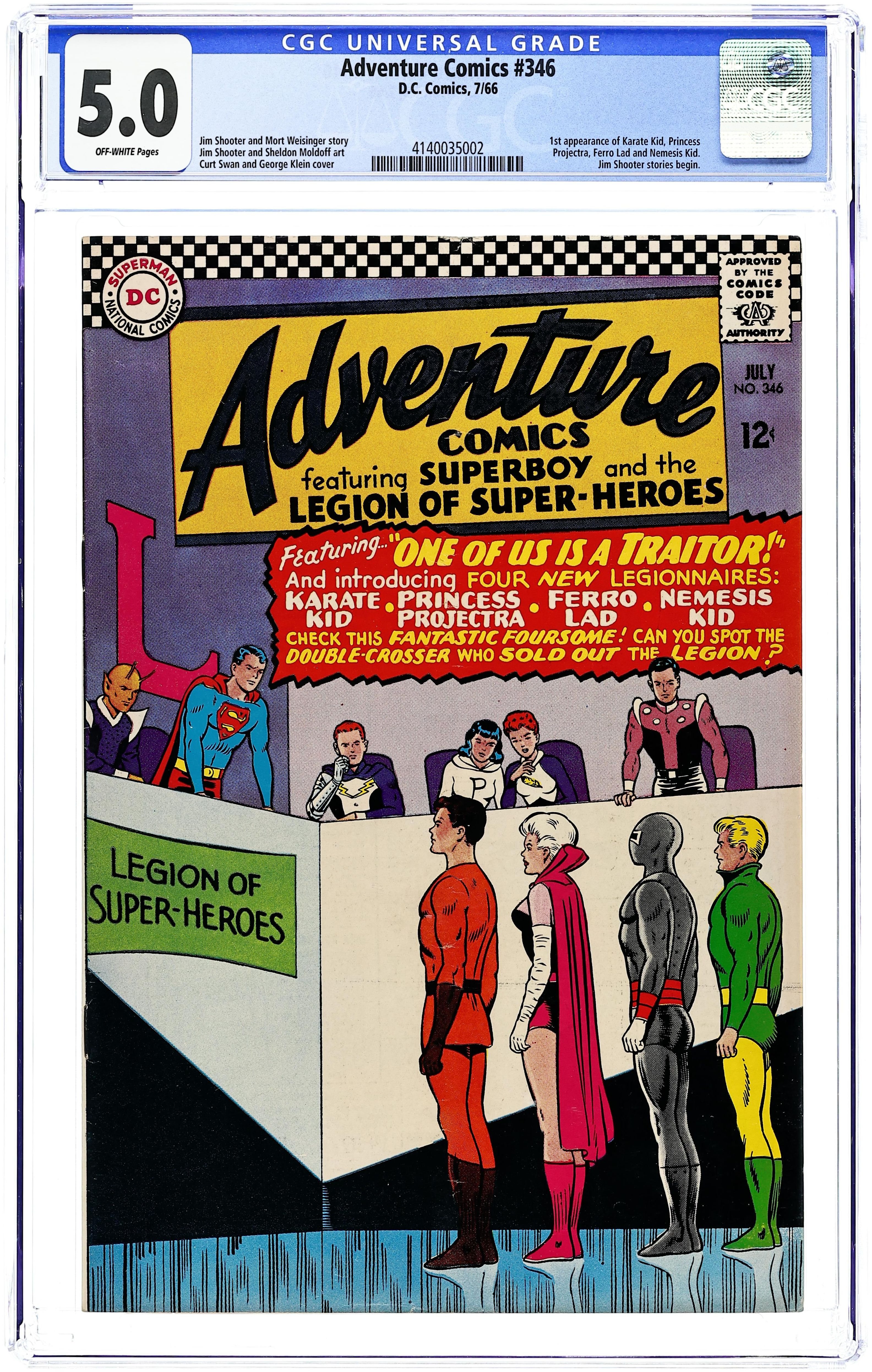 Full-length Legion stories begin. Cover pencils by Curt Swan, inks by George Klein. First appearance of Karate Kid, Princess Projectra, Ferro Lad, and Nemesis Kid in One of Us Is a Traitor!--Tales of the Legion of Super-Heroes, script by Jim Shooter, pencils by Jim Shooter (1st professional work by Jim Shooter at age 14), inks by Sheldon Moldoff; The Legion accepts 4 new members, but one appears to be a Khundish spy. Cap's Hobby Hints--Protecting During Painting activity page by Henry Boltinoff. List of Legionnaires and their powers. Letter to the editor from Irene Vartanoff. Statement of ownership--average print run 757,000; average paid circulation 520,440. 36 Pages, Full Color. Cover price $0.12.