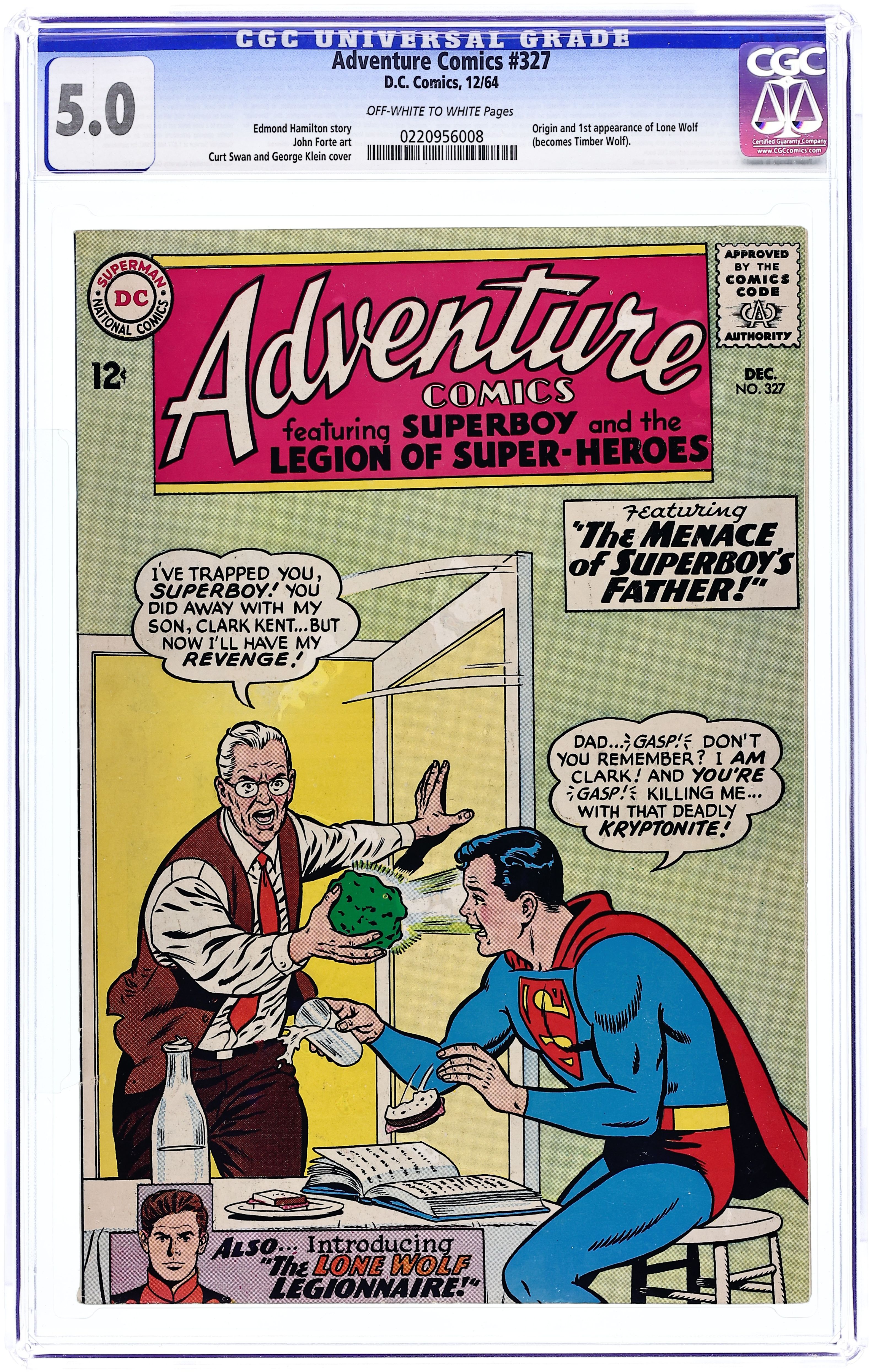 Cover pencils by Curt Swan and John Forte (inset only), inks by George Klein. The Lone Wolf Legionnaire!--Tales of the Legion of Super-Heroes, script by Edmond Hamilton, art by John Forte; While investigating robberies on Zoon, the Legionnaires extend an invitation of membership to Lone Wolf, but he refuses; first appearance of the Lone Wolf. Casey the Cop humor page by Henry Boltinoff. Varsity Vic humor page by Henry Boltinoff. The Menace of Superboy's Father!, script by Otto Binder, pencils by Curt Swan, inks by John Sikela. Rocky and Bullwinkle star in a one-page Cheerios ad. 36 Pages, Full Color. Cover price $0.12.
