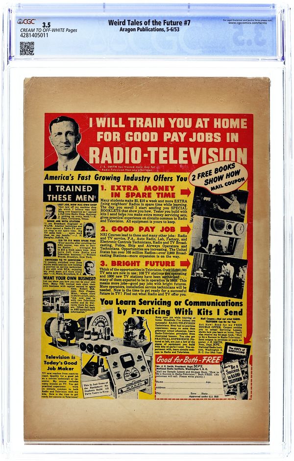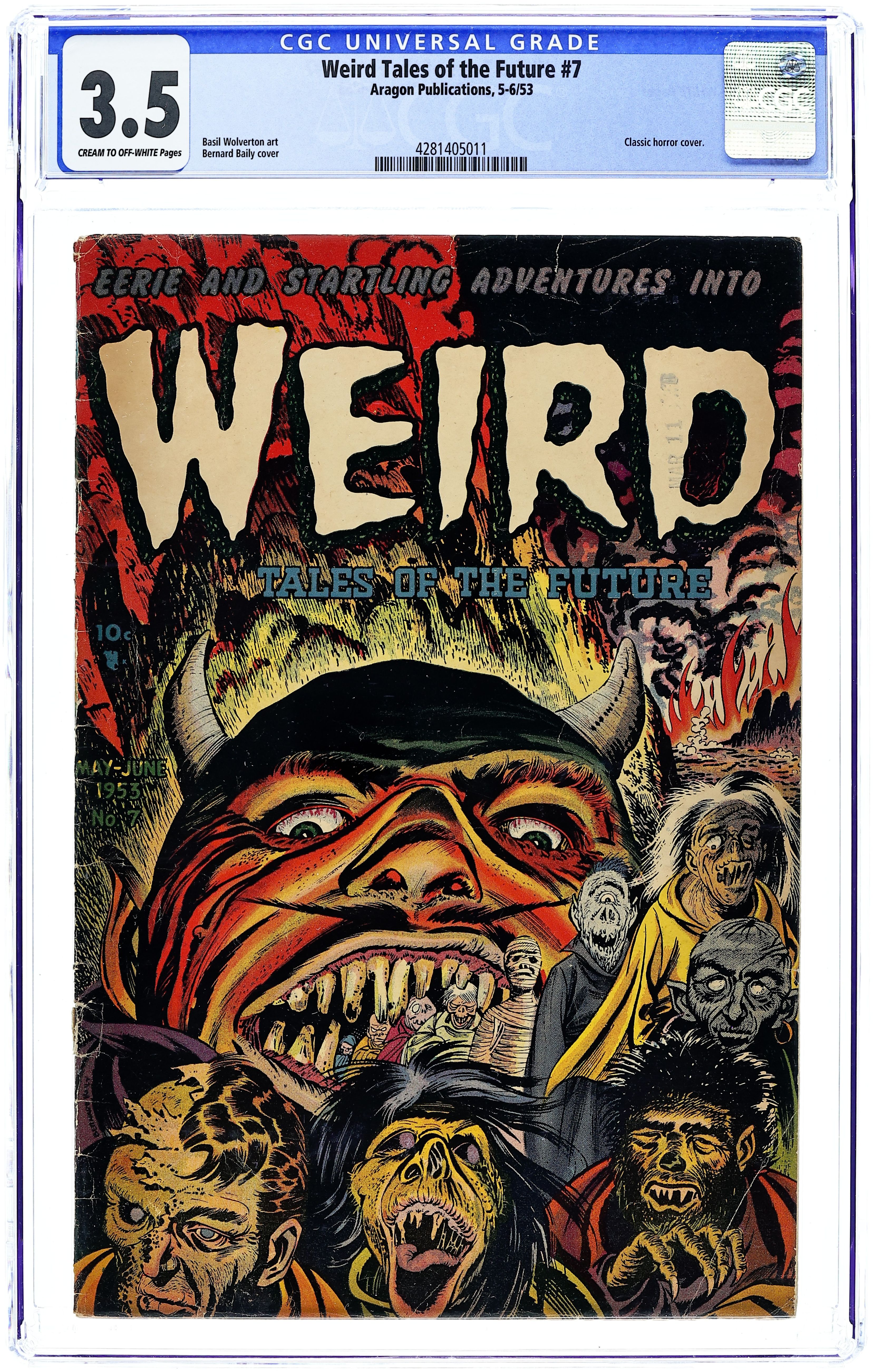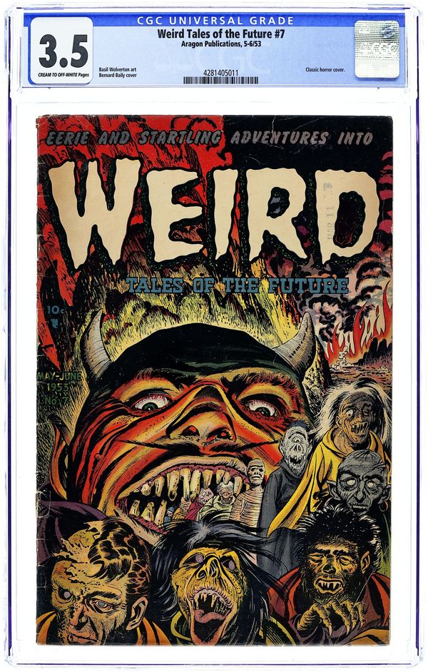 Cover by Bernard Baily. Stories and art by Basil Wolverton and others. Pre-Code tales of science fiction and horror from Stanley Morse Publications. Space aliens abduct a pair of earthlings named Adam and Evelyn for a repopulation experiment. Space station workers learn their replacements have been captured by aliens, in a story by comics legend Basil Wolverton. In the 25th century, the Earth is a paradise with all work done by robots, until.... Classic horror cover by Bernard Baily. In the Beginning; The Lost City; The Mind Movers; Rat-Trap; Serve and Obey; Jessup's Joker. 32 pages, Full Color. Cover price $0.10.