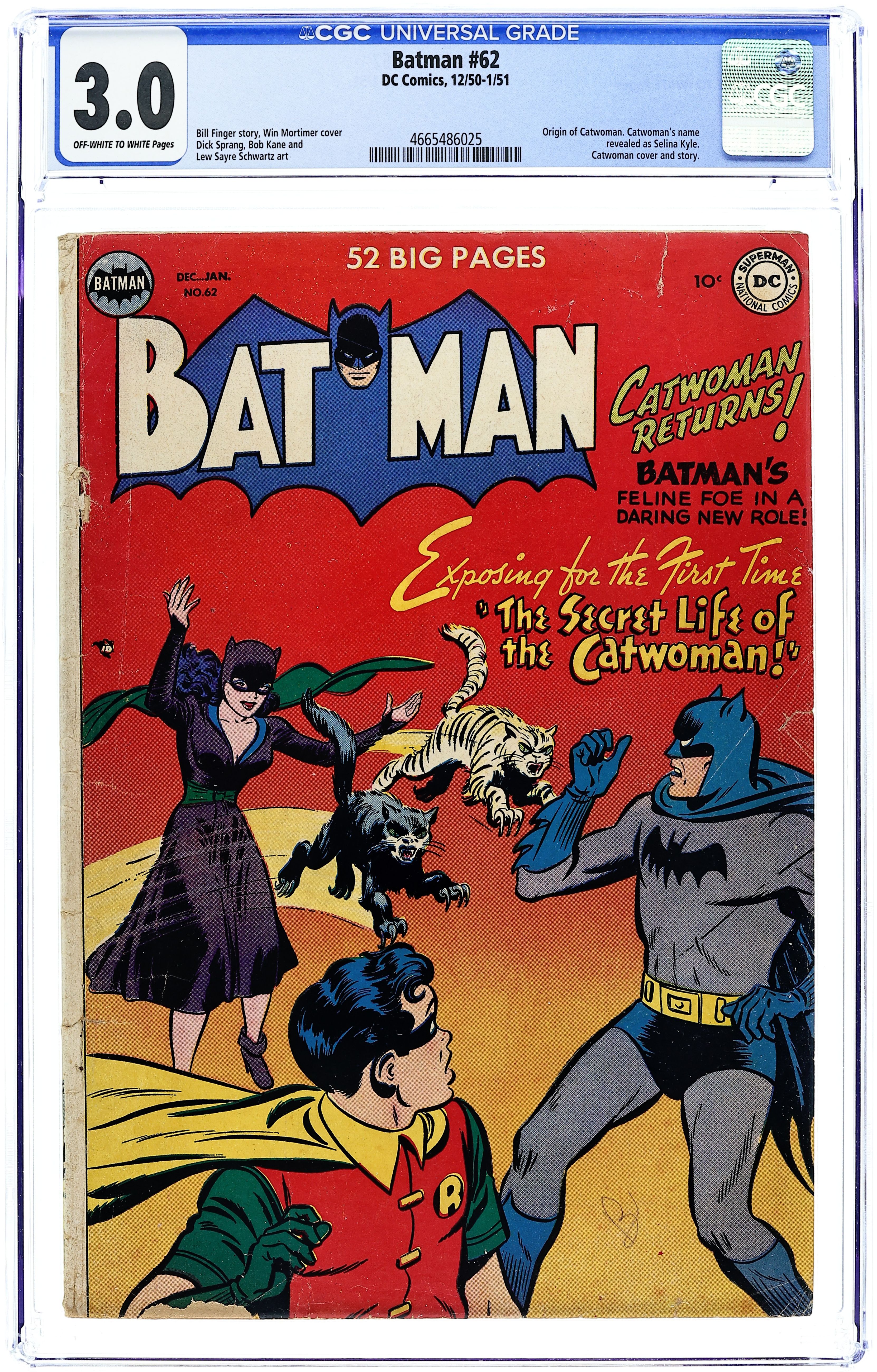 Cover pencils by Bob Kane, inks by Charles Paris. In this key issue, Batman's origin is explored in detail for the first time in "The Origin of Batman!" in which Batman tracks down the killers of his mother and father. In this same story, the Bat Signal also used for the first time; script by Bill Finger, pencils by Bob Kane, inks by Charles Paris. "Fashions in Crime!", script by Bill Finger, pencils by Bob Kane (Batman and Robin figures only) and Lew Sayre Schwartz, inks by Charles Paris; Catwoman breaks out of jail in a spectacular way and as soon as she is free again, she realizes that she could use the fashion trends as her new crime theme; Posing as the manager of an important fashion magazine, Catwoman is granted access to the houses of many wealthy people and later she steals from them; Batman and Robin intervene. "The Chain Gang Crimes!", script by Bill Finger, pencils by Bob Kane (Batman and Robin figures only) and Lew Sayre Schwartz, inks by Charles Paris; In pursuit of bank robbers, Batman and Robin chase them to a side street where they suddenly disappear. "The Adventures of Popsicle Pete and Bob Feller" ad. "Winged Justice" text story by Ted Rosen, art by Raymond Perry. One-page Daffy & Doodle story by Lit-Win. One-page Little Pete story by Henry Boltinoff. 52 Pages, Full Color. Cover price $0.10.