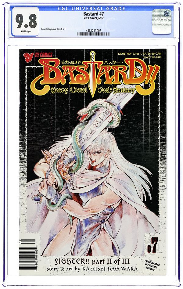 Fighter!! Part 2 of 3 - Story and Art by Kazushi Hagiwara. After a night of passion with his mysterious new lady friend, Dark Schneider awakens to find himself again under attack! The local peasants have been turned to stone, their love nest is surrounded by hordes of orcs, and at the head of their ranks is Kai Harn, a fearsome swordfighter/wizard seeking the bounty on Schneider's head! 64 pages, B&W. Mature Readers. Cover price $3.95.