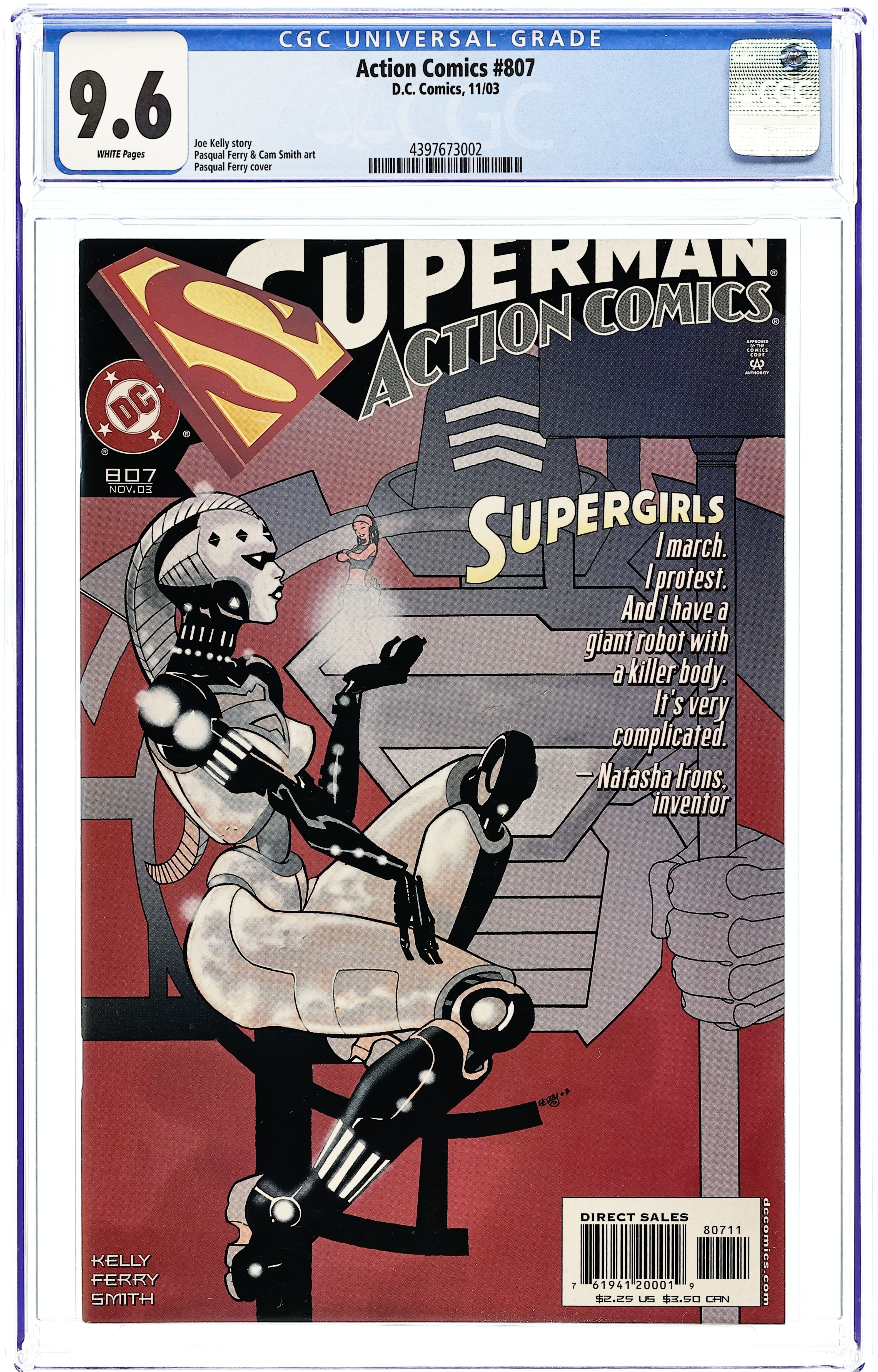 Cover by Jim Lee and Scott Williams. Written by Dan Jurgens, Peter J. Tomasi, Marv Wolfman, Geoff Johns, Richard Donner, Scott Snyder, Tom King, Louise Simonson, Paul Dini, Brad Meltzer and Brian Michael Bendis. Art by Dan Jurgens, Norm Rapmund, Patrick Gleason, Curt Swan, Butch Guice, Kurt Schaffenberger, Olivier Coipel, Rafael Albuquerque, Clay Mann, Jerry Ordway, JosĂ© Luis GarcĂa-LĂłpez, Kevin Nowlan, John Cassaday, Jim Lee and Scott Williams. Celebrate 1000 issues of Action Comics with an all-star lineup of top talent as they pay tribute to the comic that started it all! From today's explosive action to a previously unpublished tale illustrated by the legendary Curt Swan to the Man of Tomorrow's future, this very special, oversized issue presents the best of the best in Superman stories! Featuring: "From the City That Has Everything" by Dan Jurgens and Norm Rapmund; "Never-Ending Battle" by Peter J. Tomasi and Patrick Gleason; "An Enemy Within" by Marv Wolfman, Curt Swan, Butch Guice and Kurt Schaffenberger (note: original story by Cindy Goff, Swan and Guice, with the final page courtesy of Superman The Secret Years (1985) #2 by Bob Rozakis, Swan and Schaffenberger); "The Car" by Geoff Johns, Richard Donner and Olivier Coipel; "The Fifth Season" by Scott Snyder and Rafael Albuquerque; "Of Tomorrow" by Tom King and Clay Mann; "Five Minutes" by Louise Simonson and Jerry Ordway; "Actionland!" by Paul Dini, JosĂ© Luis GarcĂa-LĂłpez and Kevin Nowlan; "Faster Than a Speeding Bullet" by Brad Meltzer and John Cassaday; and "The Truth" by Brian Michael Bendis, Jim Lee and Scott Williams. Plus: Pin-ups by John Romita, Jr. and Danny Miki, Walter Simonson, and Jorge Jimenez. Softcover, 80 pages, full color. Rated T Cover price $7.99.