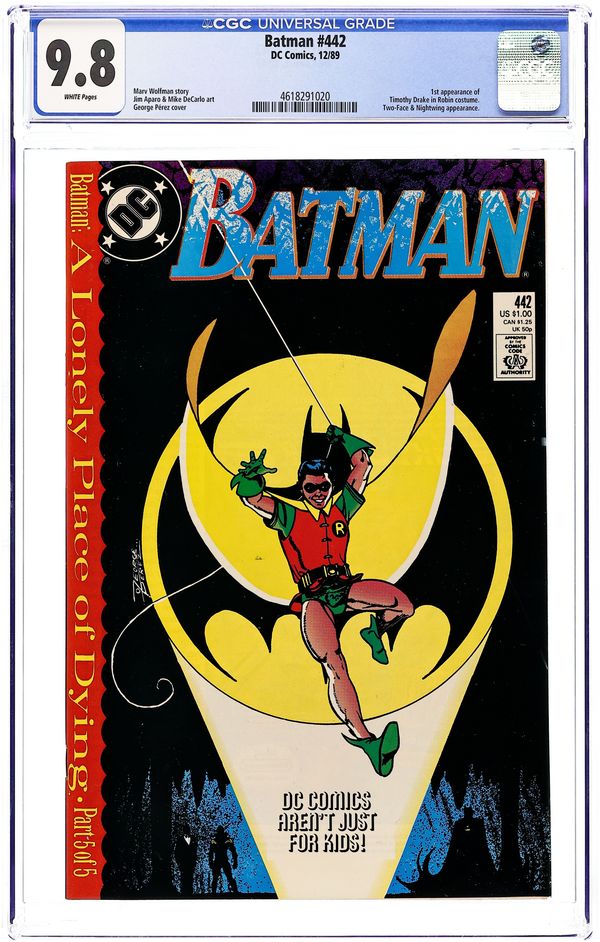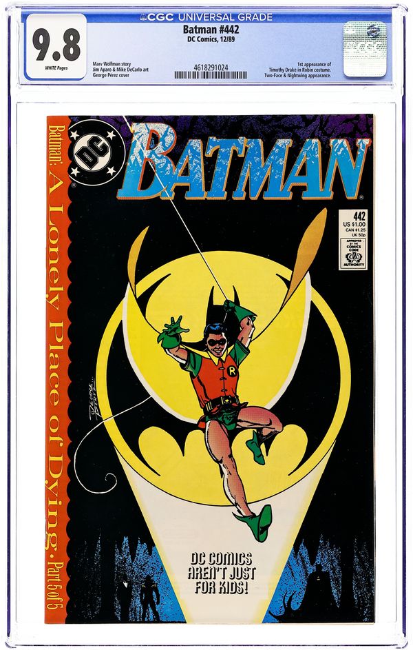 Direct Edition. Cover by George Perez. "A Lonely Place of Dying Chapter Five: Rebirth," script by George Perez (Co-Plot) and Marv Wolfman, pencils by Jim Aparo, inks by Mike DeCarlo; With Batman and Nightwing trapped by Two-Face, there's only one person left to save the day; Prepare for the debut of the newest Robin, Tim Drake! Columns on "Bat Questions Answered," "Continuity Corner," and "From the Den," the latter by Denny O'Neil. 36 Pages, Full Color. Cover price $1.00.