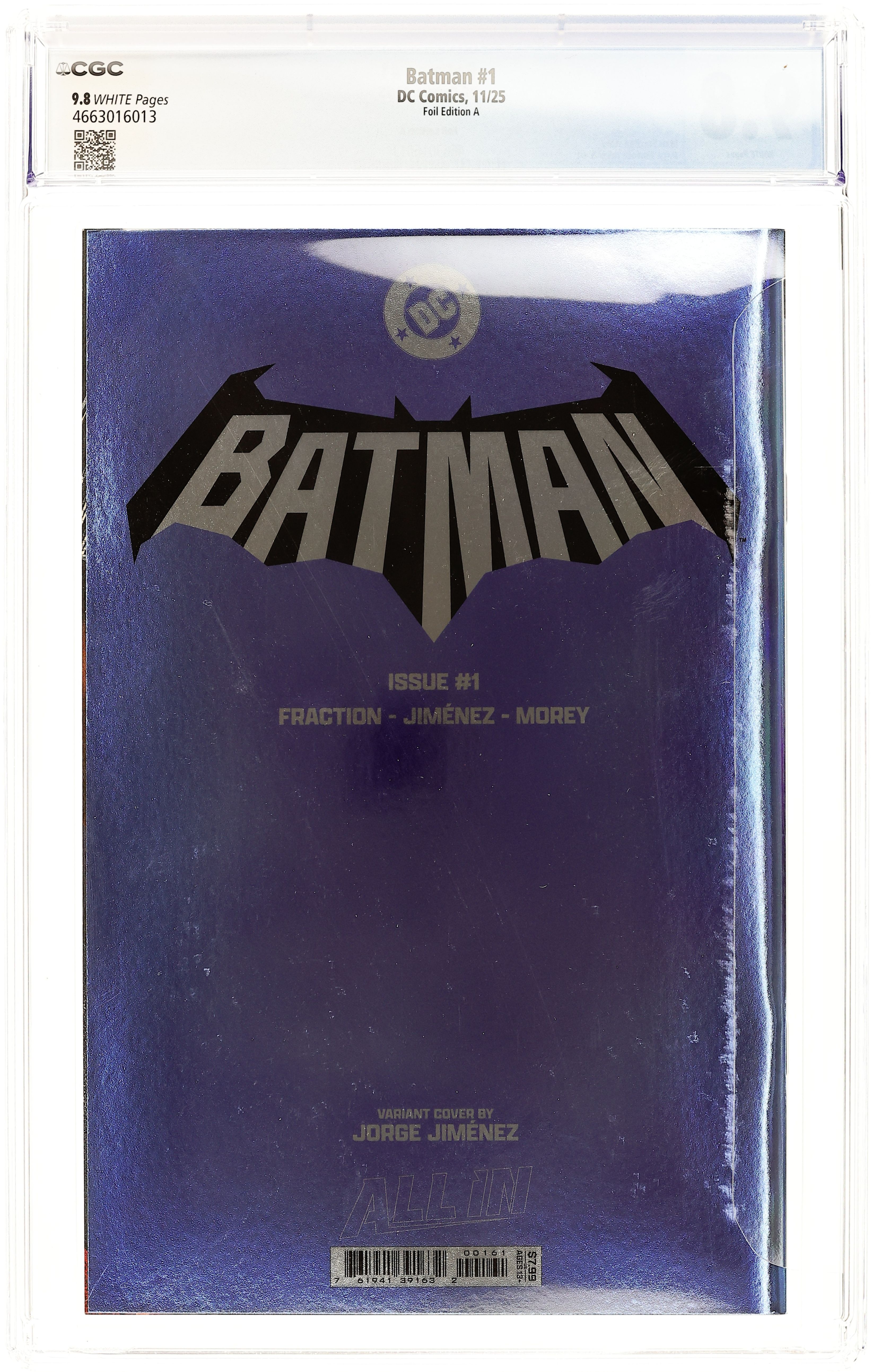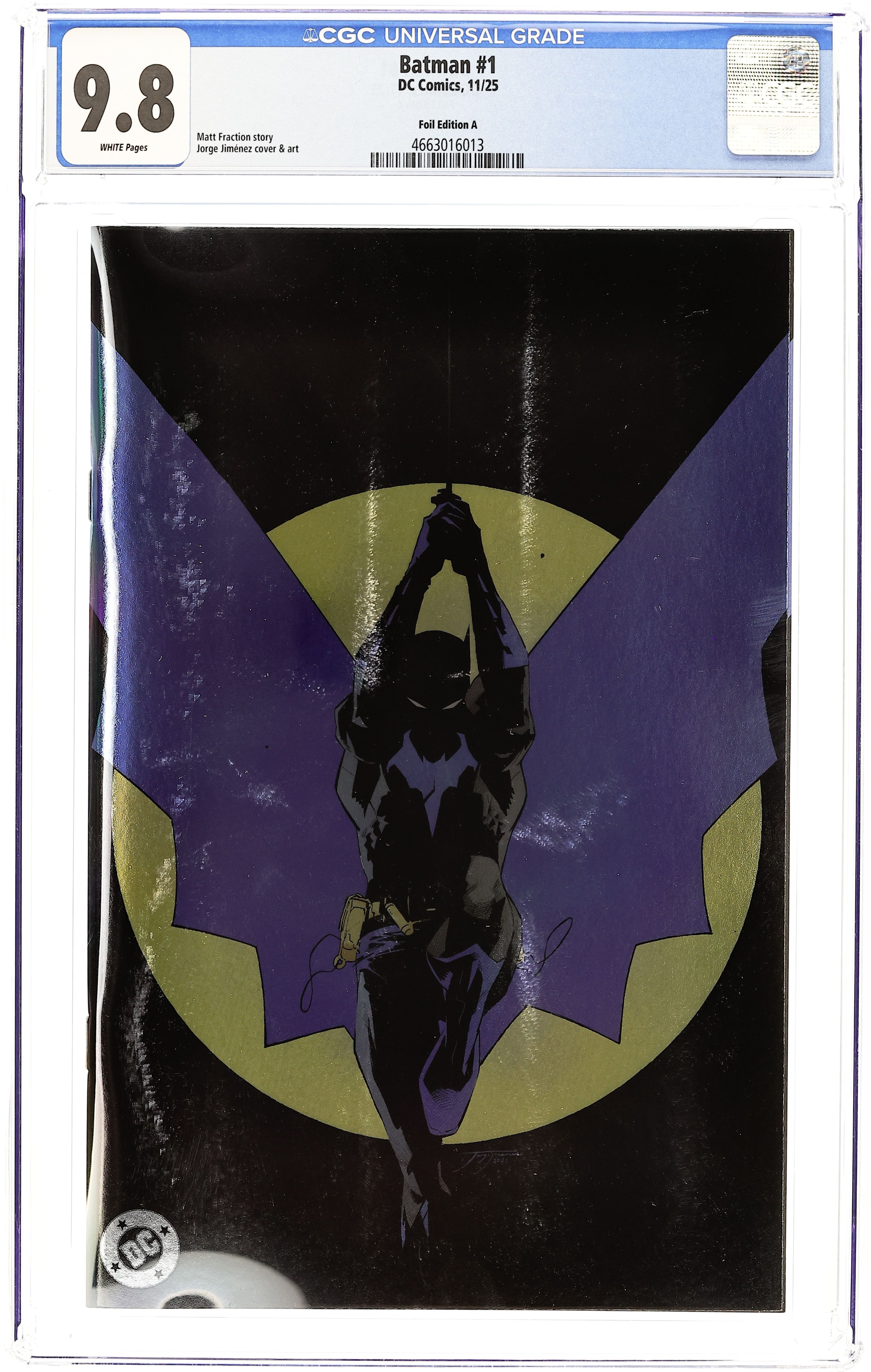 Blind bag foil variant. Written by Matt Fraction. Art by Jorge Jimenez. Cover by Jorge Jimenez. A BOLD NEW ERA OF BATMAN STARTS HERE! A new day dawns for the Dark Knight Detective as Eisner Award-winning writer Matt Fraction (Hawkeye, Superman's Pal Jimmy Olsen) joins forces with superstar artist Jorge Jimenez (Batman, Summer of Superman Special) for an unforgettable new era of Batman! The best superhero in comics gets a brand-new first issue to kick off this new era that will test Batman and Bruce Wayne like never before! 40 pages, full color. Rated T+ Cover price $4.99.