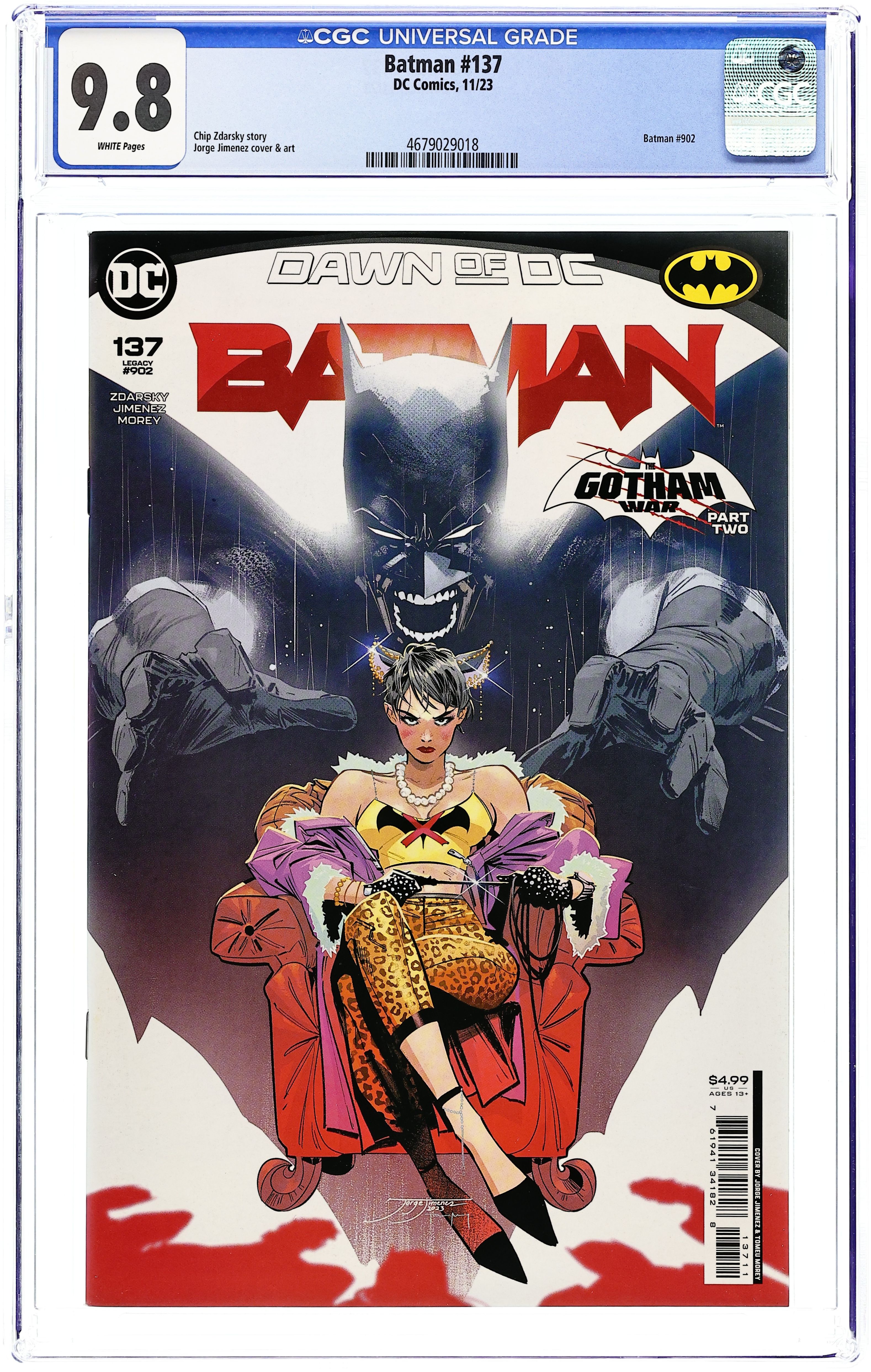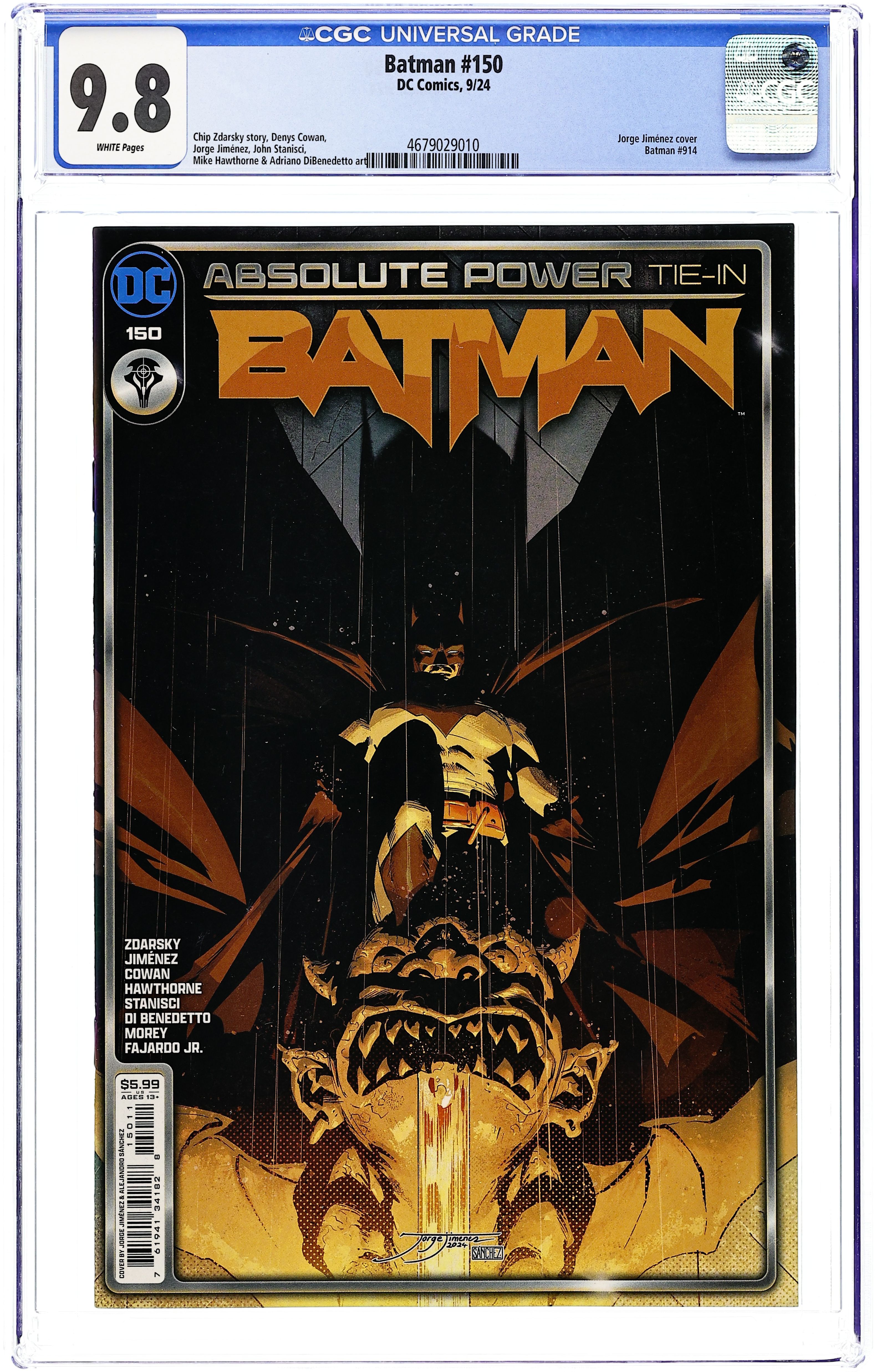 Written by Chip Zdarsky. Art by Jorge Jimenez, Denys Cowan, Mike Hawthorne. Cover by Jorge Jimenez. A milestone issue featuring art by the legendary DENYS COWAN (The Question) and series regular JORGE JIMENEZ! When a two-bit crook uncovers Batman's true identity, he becomes the most dangerous man in Gotham City! Can Batman stop him before it's too late? Does he even want to? Plus, an Absolute Power backup story by Chip Zdarsky and Mike Hawthorne teaming Batman and Catwoman on the heist of their lives against Amanda Waller! 44 pages, full color. Rated T+ Cover price $5.99.