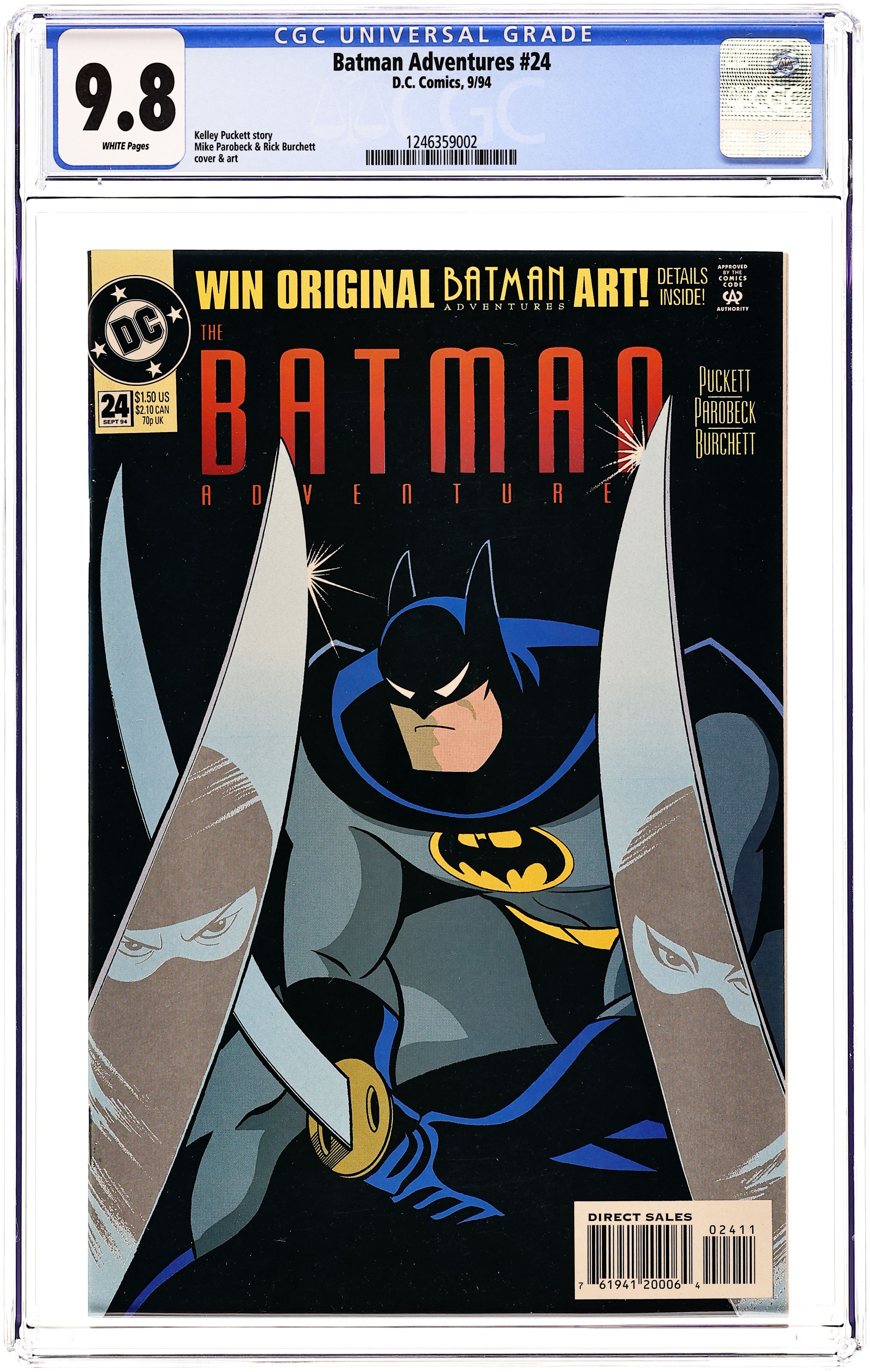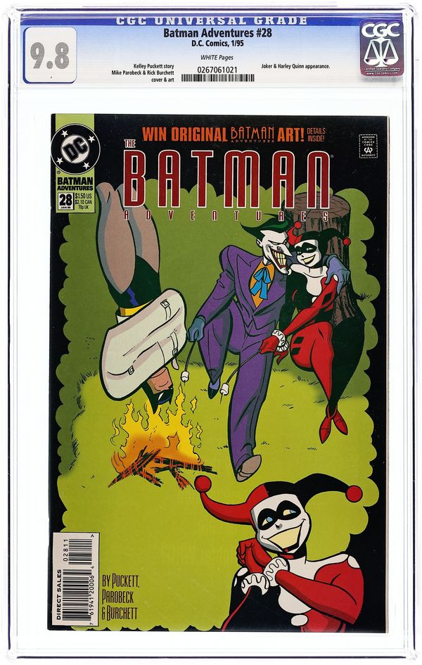Direct Edition. 1st appearance of Harley Quinn in a comic book. "Batgirl: Day One." Barbara Gordon attends a costume party dressed as Batgirl. Unfortunately, Poison Ivy and Harley Quinn also decide to show up. Based on Batman The Animated Series. Script by Kelley Puckett, pencils by Mike Parobeck, inks by Rick Burchett. Cover by Parobeck. Cover price $1.25.