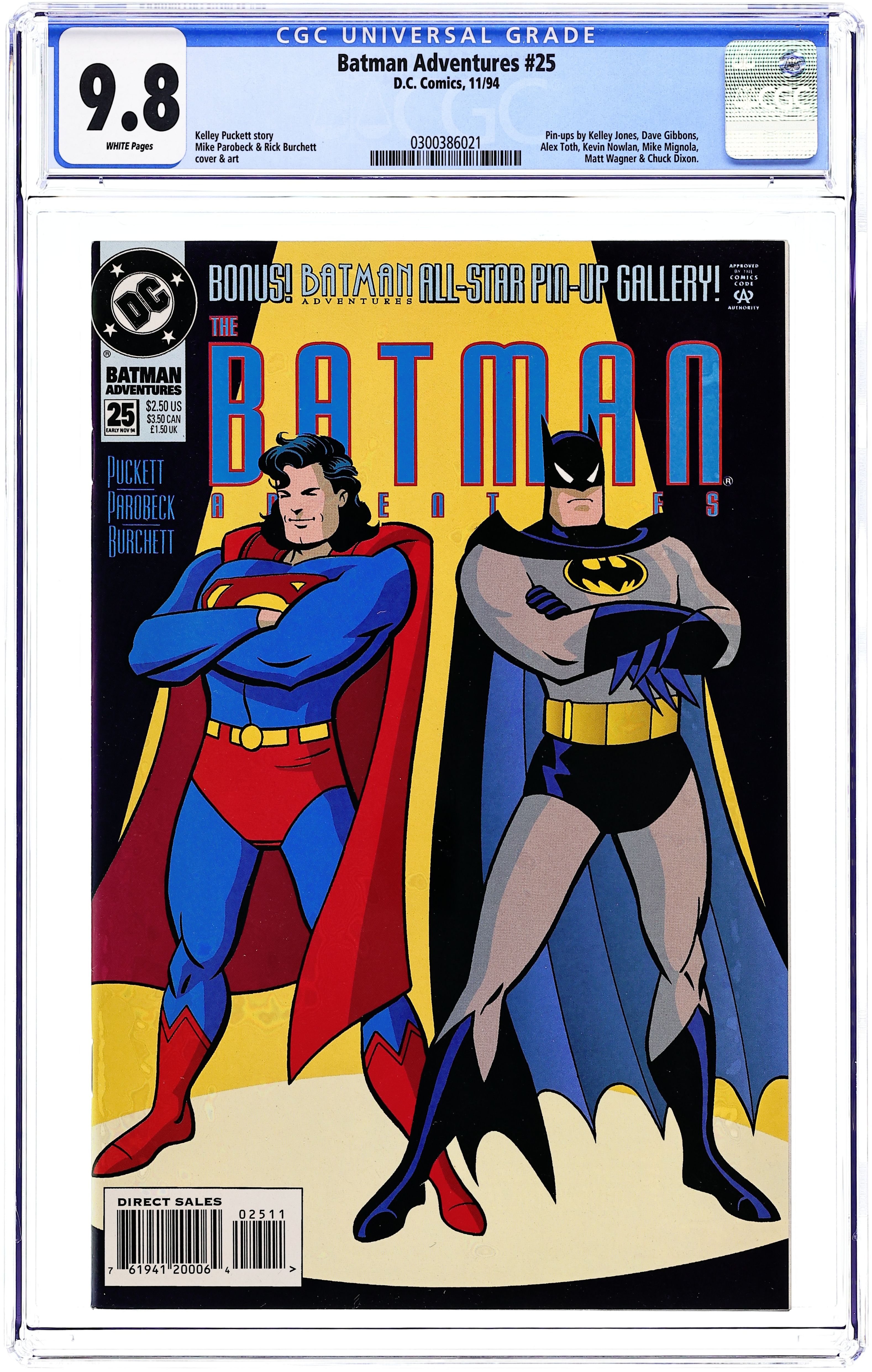 Direct Edition. Meet Roxy Rocket, a new villain facing Batman that forces him to recall times when some of his greatest foes including Harley Quinn, the Scarecrow and the Ventriloquist almost went straight. Written by Paul Dini, with art by Mike Parobeck, Bruce Timm, John Byrne, Klaus Janson, Dan DeCarlo, Matt Wagner and Rick Burchett. Cover by Timm. Cover price $2.95.