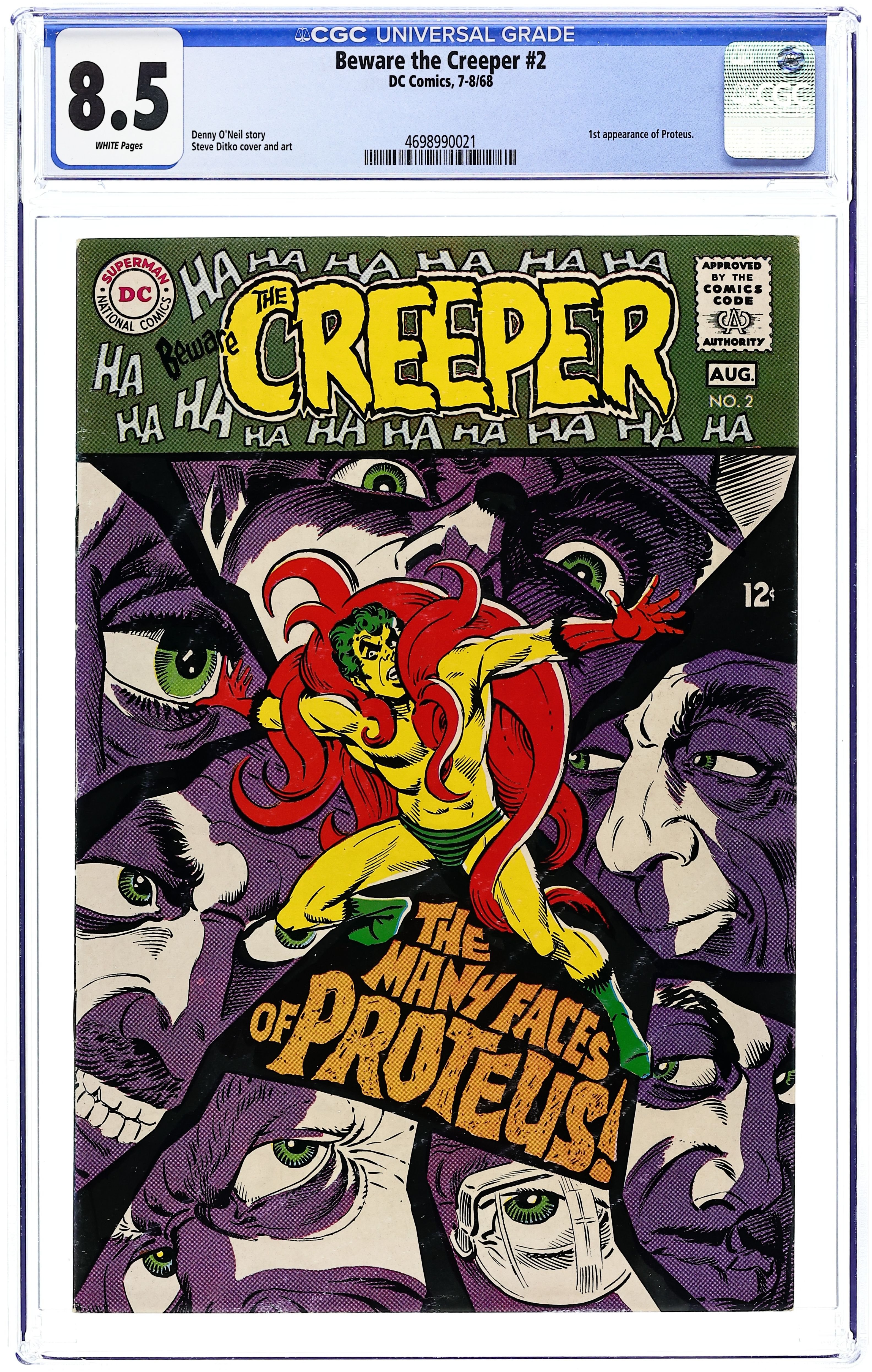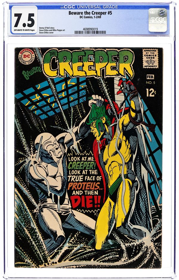 "The Many Faces of Proteus." The Creeper seeks the identity of and battles Proteus, who can change his appearance at any time. Proteus changed himself to look like The Creeper and committed a murder on television, forcing Creeper to try and clear his name. Script by Denny O'Neil (as Sergius O'Shaugnessy), art and cover by Steve Ditko. Cover price $0.12.