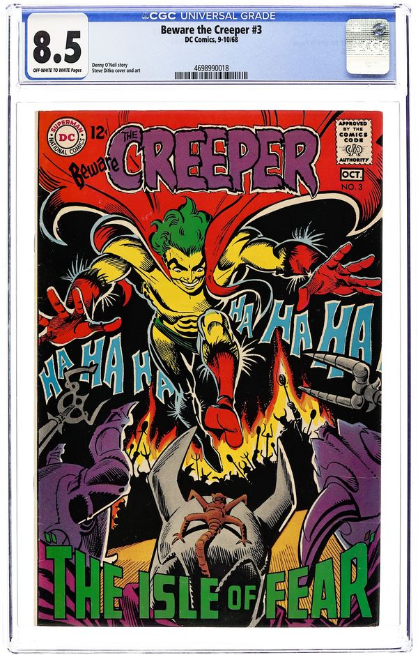 "The Isle of Fear." Weather girl Vera Sweet disappears while on a story, prompting The Creeper to rescue her. This leads to a remote island, where villains have enslaved the locals. Script by Denny O'Neil, art and cover by Steve Ditko. Cover price $0.12.