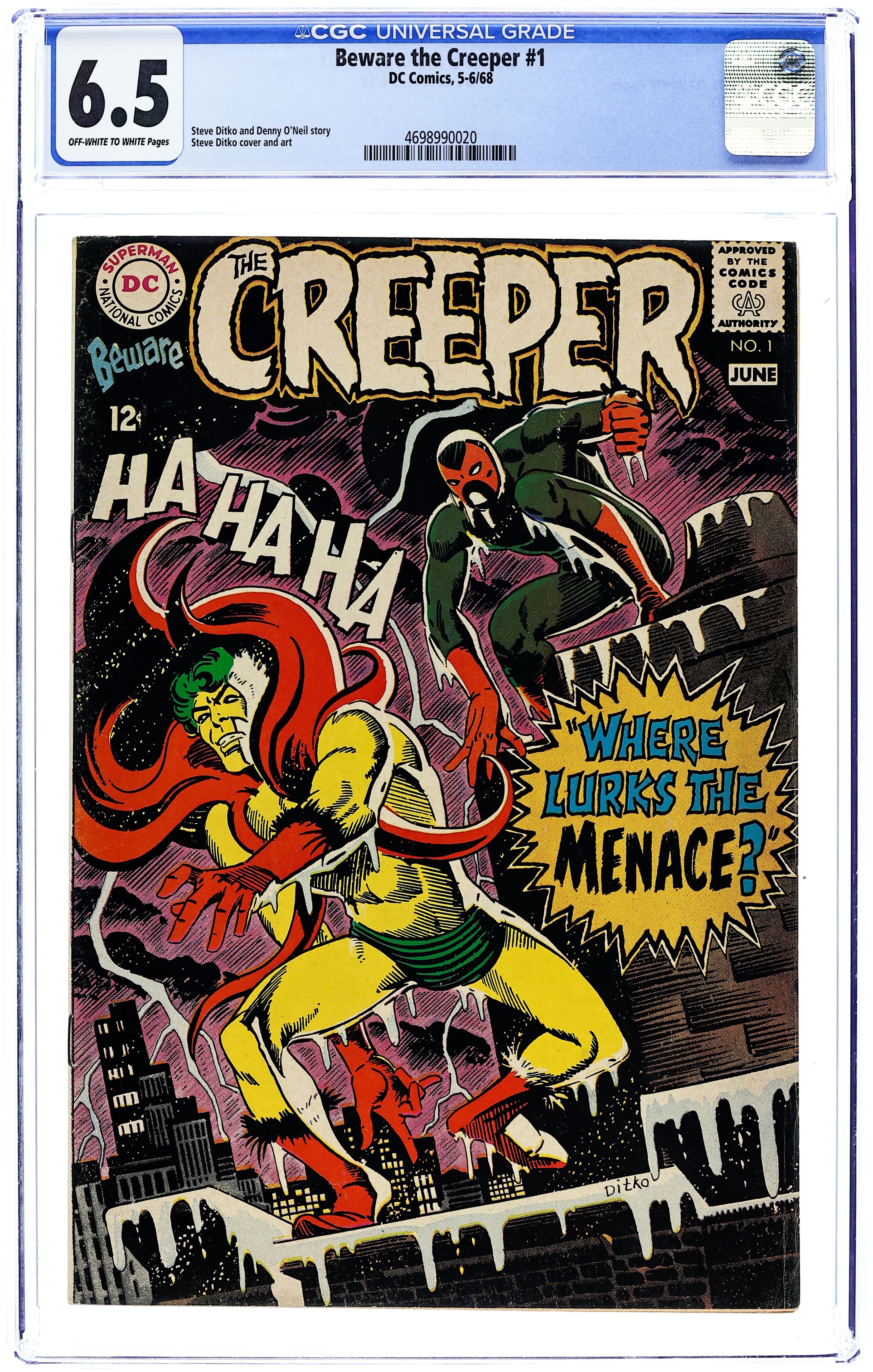 "Where Lurks the Menace?" The Creeper battles The Terror, who has been shaking down local mob bosses and using insider information to gain protection money. The Creeper wins the fight, of course, unmasking The Terror in the process. (The Creeper's first appearance was in Showcase 73). Script by Denny O'Neil (as Sergius O'Shaugnessy), plot, art, and cover by Steve Ditko. Cover price $0.12.