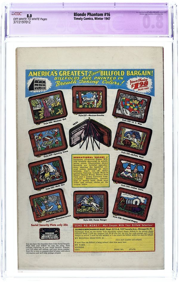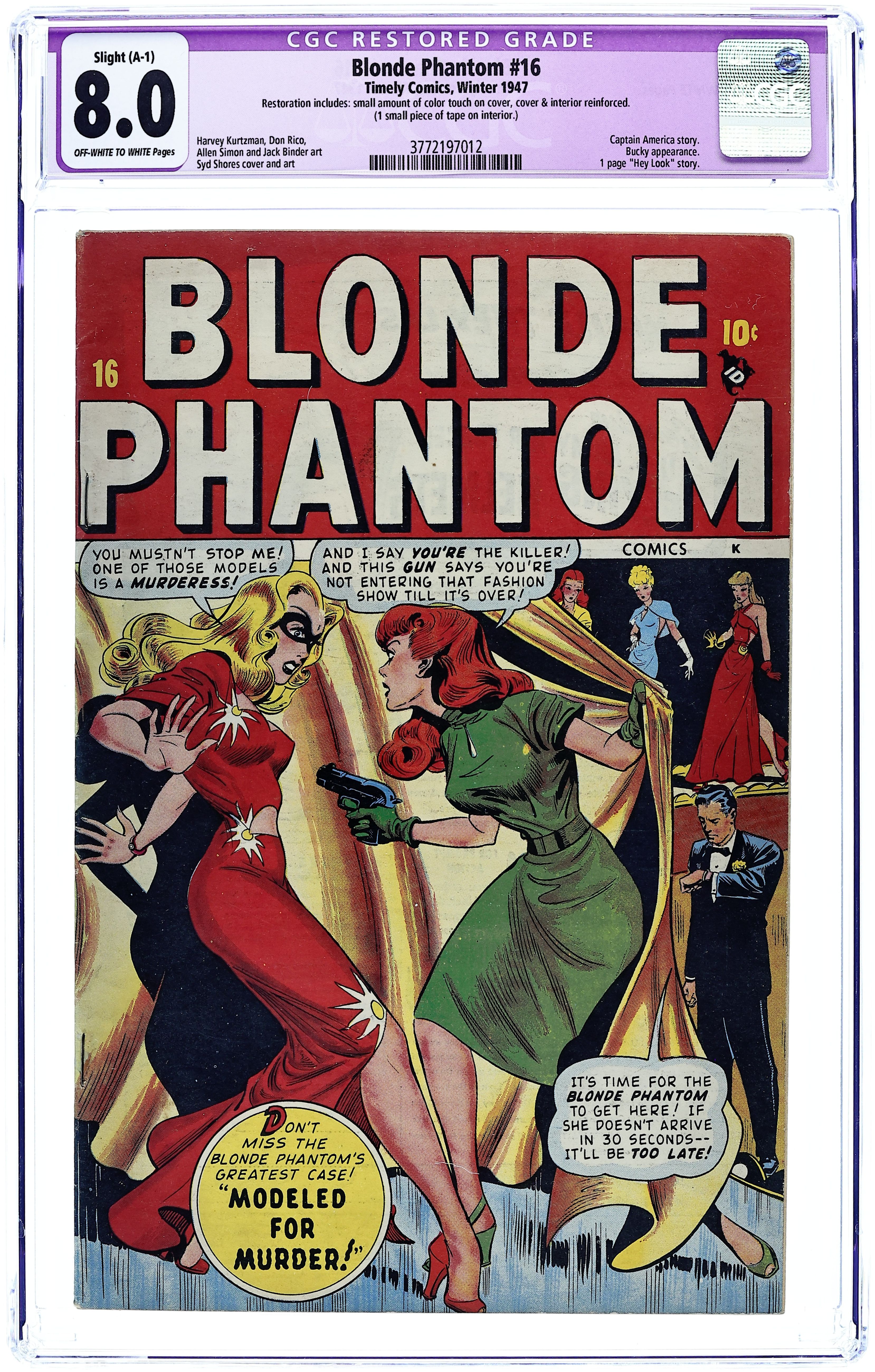 Cover pencils by Syd Shores. Stories by Bill Woolfolk, Harvey Kurtzman (Hey Look! 1-pager) and unknown. Art by Syd Shores, Harvey Kurtzman (Hey Look! 1-pager), Vince Alascia and unknown. The Blonde Phantom stars in "Modelled for Murder!" with splash page pencils by Syd Shores, and "The Sultan Strikes!" with story by Bill Woolfolk and splash page art by Syd Shores and Vince Alascia. Also in this issue: Captain America in "The Murder at the Mardi Gras!" with story by Bill Woolfolk (and pencils by Rico?); untitled Hey Look! 1-pager by Harvey Kurtzman; "The White Vision" text story; and untitled stamp collecting article. Characters in this issue: Blonde Phantom; Stillface (first appearance; villain); Captain America [Steve Rogers]; Bucky [Bucky Barnes]. 32 pages, full color. Cover price $0.10.