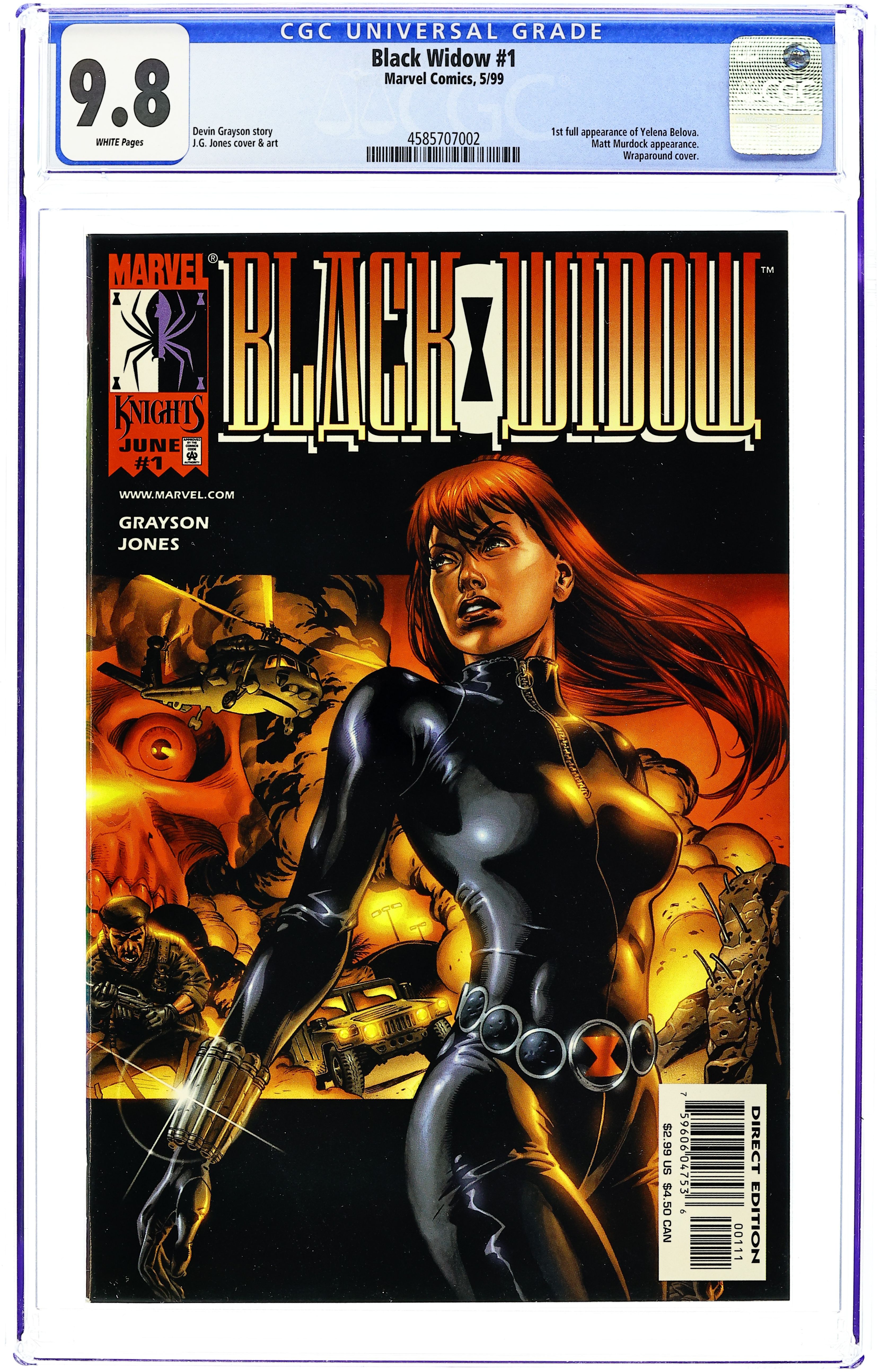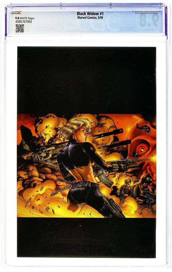 THE WARNING: The following analysis is for your eyes only and discusses the proposed elimination and replacement of Natasha Romanova, a.k.a. the Black Widow! THE TRANSMISSION: Data retrievement has uncovered the manufacture of an unstable variation of the "Super Soldier Serum" once used to empower Captain America. Satellite photographs locate chemical production facilities somewhere in the desert of Rhapistan. THE PENTAGON ASSESSMENT: Definite involvement of hard-line KGB agents targeting acquisition of Serum. Request immediate reactivation of Natasha Romanova, former Avenger and one-time spy. THE RISK FACTOR: New Black Widow Operative activated with priority one orders: terminate and replace Natasha Romanova. Written by Devin Grayson. Art and wraparound covers by J.G. Jones. Cover price $2.99.