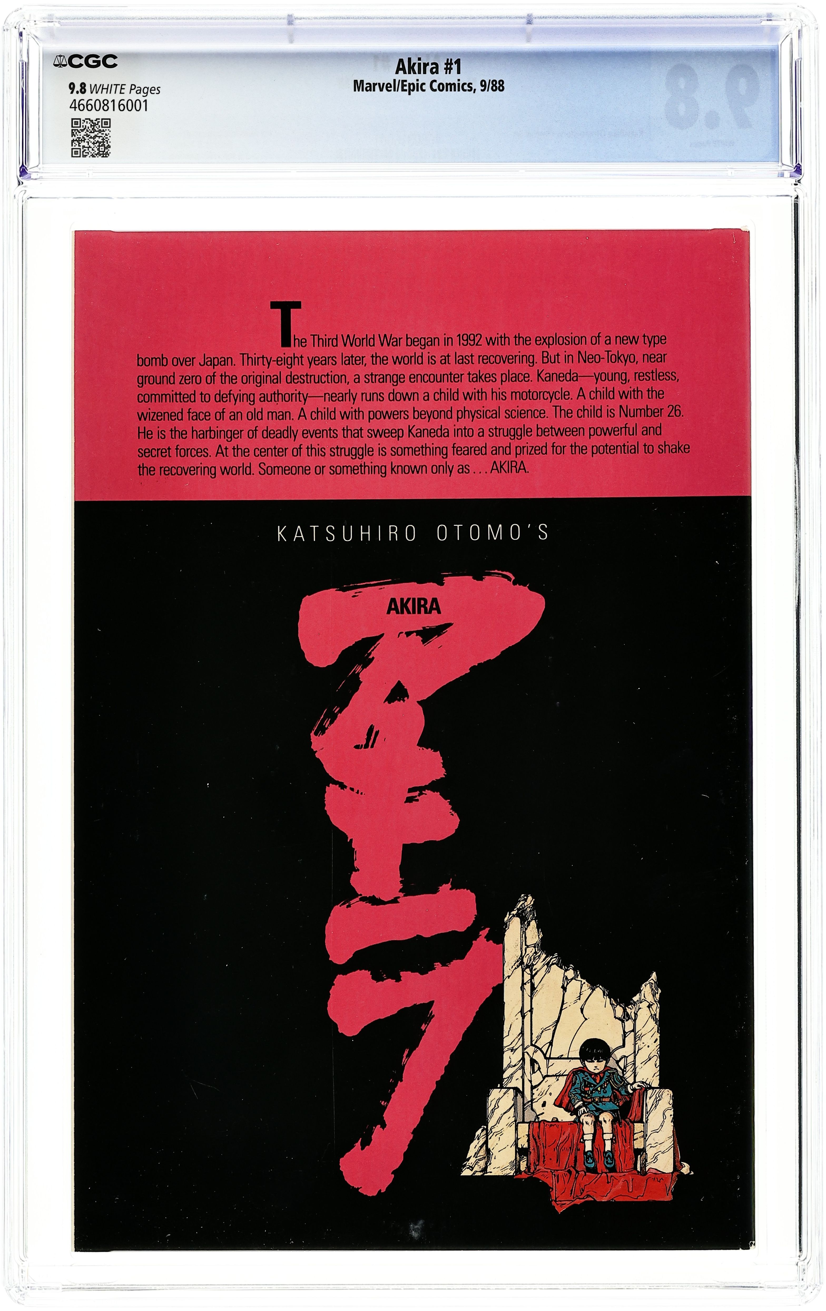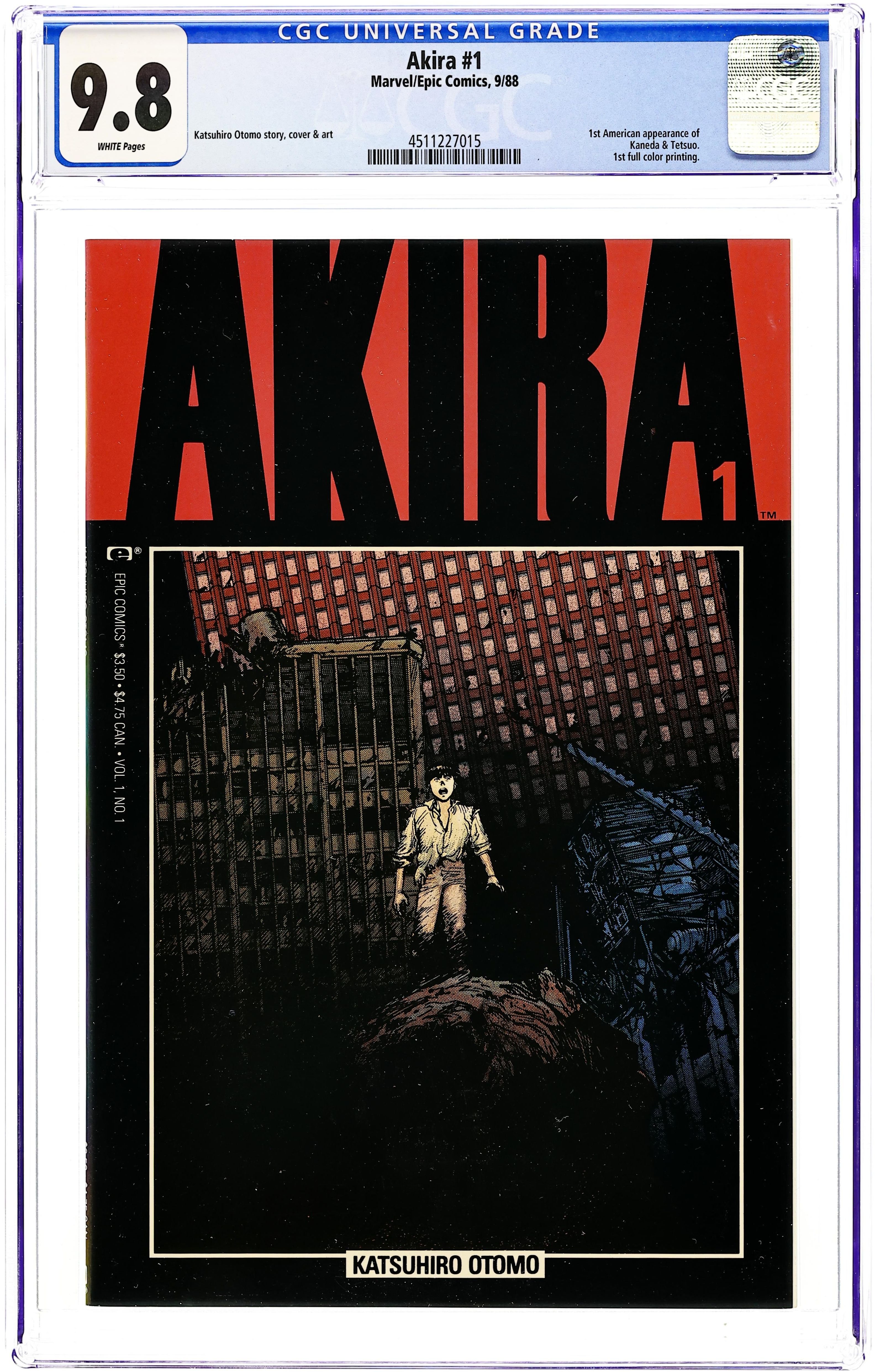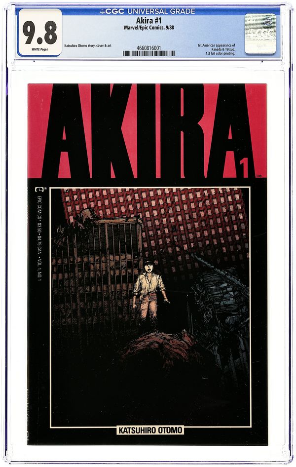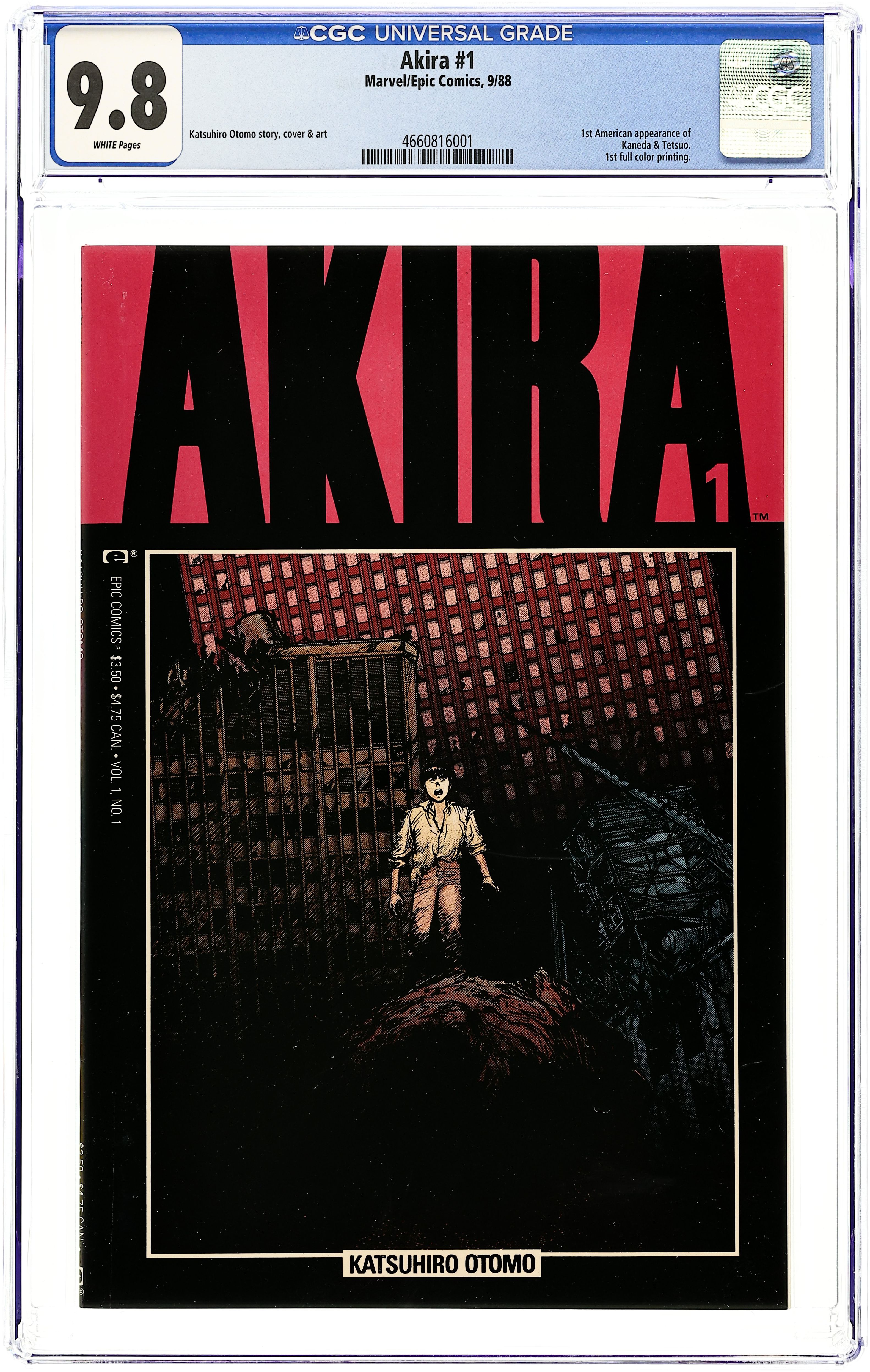 1st printing. Here it is – the first English translation of Katsuhiro Otomo's influential manga series, paving the way for the manga and anime craze to blossom in the English-speaking world. Decades after a mysterious explosion destroys Tokyo, teen bikers Tetsuo and Kaneda encounter a child with the face of an old man; his strange powers hold the key to the mystery. Story, art and cover by Otomo. Color by Steve Oliff, who pioneered the use of computer coloring with this series. Also includes an introductory article by Archie Goodwin. Mature readers. Cover price $3.50.