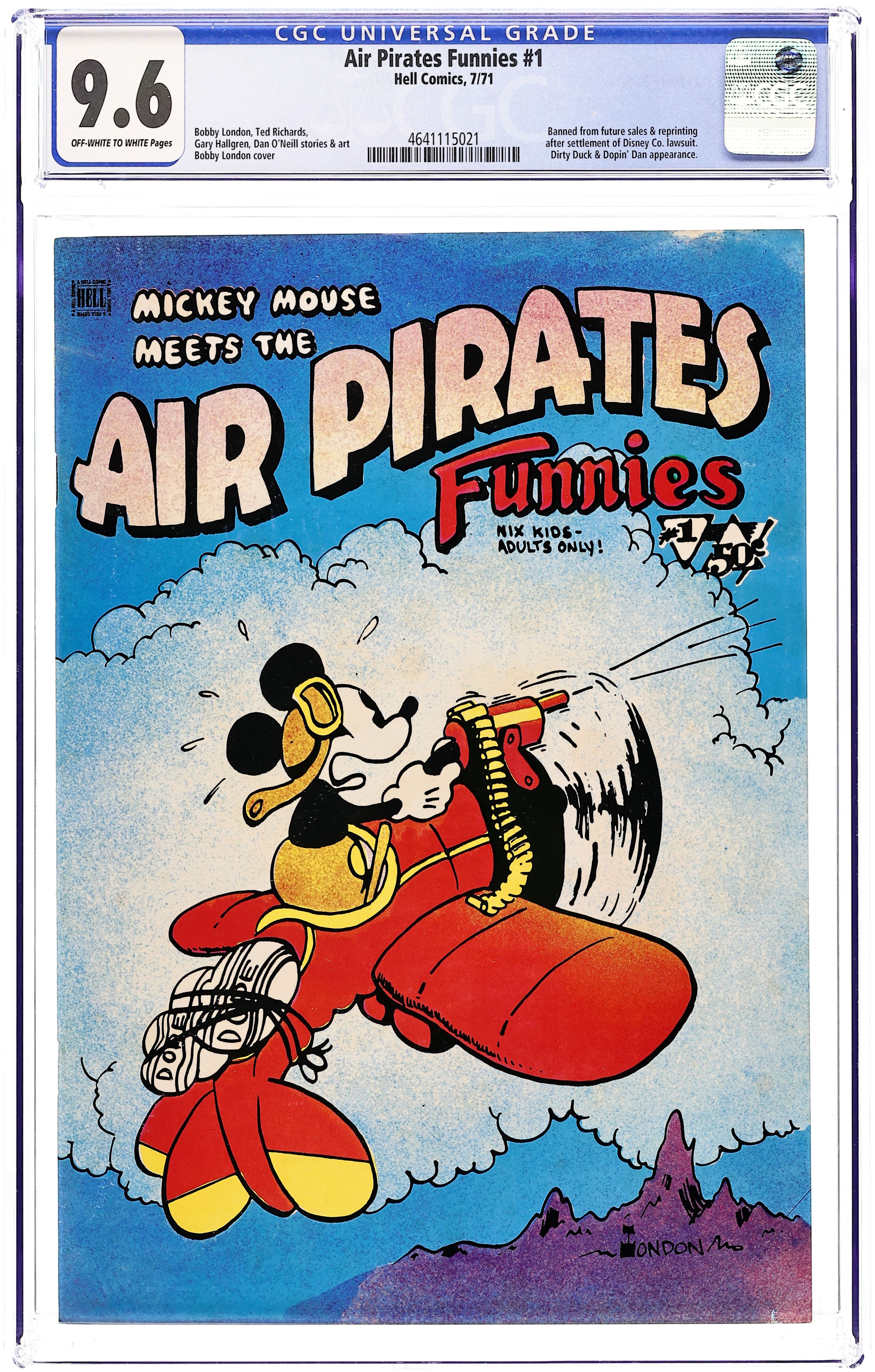 Controversial parody discontinued due to Disney lawsuit. The Air Pirates were a group of cartoonists who created two issues of an underground comic called Air Pirates Funnies in 1971, leading to a famous lawsuit by The Walt Disney Company. Founded by Dan O'Neill, the group also included Shary Flenniken, Bobby London, Gary Hallgren, and Ted Richards. The collective shared a common interest in the styles of past masters of the comic strip: Flenniken emulated George McManus's Bringing Up Father in her Trots and Bonnie comics, London's strip Dirty Duck paid homage to the styles of E.C. Segar's Thimble Theater and George Herriman's Krazy Kat, and Richards' Dopin' Dan was similar to Mort Walker's Beetle Bailey. The original Air Pirates were a gang of Mickey Mouse antagonists of the 1930s; O'Neill regarded Mickey Mouse as a symbol of conformist hypocrisy in American culture, and therefore a ripe target for satire. The first issue of Air Pirates Funnies was dated July 1971, and the second issue dated August. Both were published under the Hell Comics imprint, and were distributed through Ron Turner's Last Gasp publishing company. The lead stories in both issues, created by O'Neill and Hallgren, focused on Walt Disney characters, most notably from Floyd Gottfredson's Mickey Mouse newspaper strip, with the Disney characters engaging in adult behaviors such as sex and drug consumption. O'Neill insisted it would dilute the parody to change the names of the characters, so his adventurous mouse character was called "Mickey" Cover price $0.50.