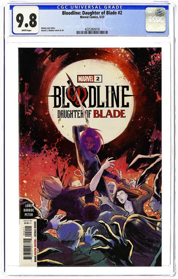 Limited 1 for 25 Retailer Incentive Variant Cover. NOTE: Issue will be unbagged for grading. Written by Jed MacKay. Art by Pepe Larraz. Cover by Betsy Cola. But will this light be drowned in the blood of this special no-holds-barred unexpurgated RED BAND edition? Please note: The digital codes in these BLOOD HUNT Red Band Editions will unlock the regular versions of the BLOOD HUNT series digitally. 32 pages, full color. Rated T+ Cover price $5.99.