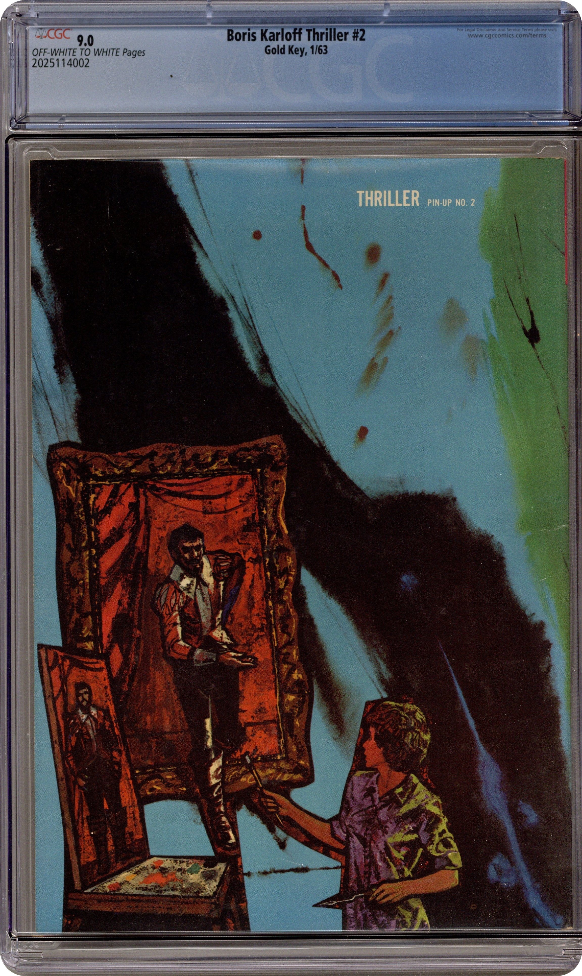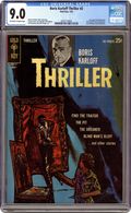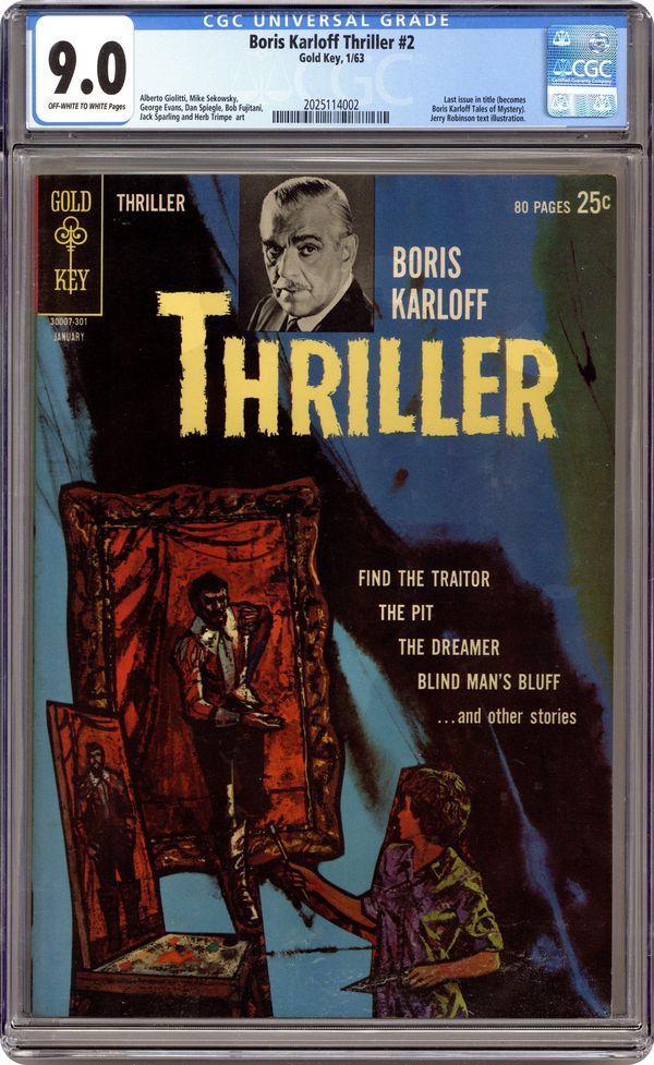 Featuring: 7 page Boris Karloff Thriller story "Blind Man's Bluff" drawn by George Evans; 10 page Boris Karloff Thriller story "The Dreamer" drawn by Mike Sekowsky and Mike Peppe; 8 page Boris Karloff Thriller story "The Smiling Cavalier" drawn by Tom Gill and Herb Trimpe; 1 page text story "The Man from Nowhere" drawn by Jerry Robinson; 13 page Boris Karloff Thriller story "The Island" drawn by Dan Spiegle; 2 page text story "The Phantom Plane"; 8 page Boris Karloff Thriller story "The Devil's Armchair" drawn by Mike Sekowsky and Mike Peppe; 10 page story "Find the Traitor" drawn by Bob Fujitani; 10 page Boris Karloff Thriller story "The Black Pit" drawn by Jack Sparling; 11 page Boris Karloff Thriller story "A Very Strange Burial" drawn by Alberto Giolitti; 1 page story "The Amazing Peter Hurkos" drawn by Tom Gill (on inside back cover); Thriller Pin-Up No. 2 (pin-up of the front cover without photograph, logo or lettering). NOTE: #30007-301 on cover Cover price $0.25.