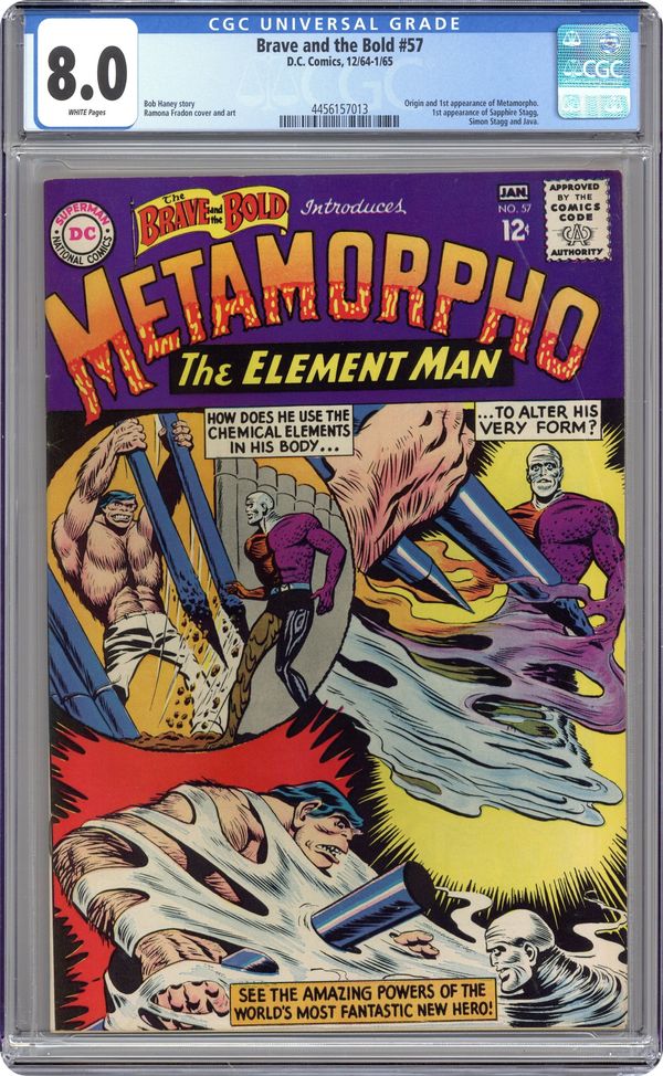 Cover pencils by Ramona Fradon, inks by Charles Paris. 1st appearance of Metamorpho in "The Origin of Metamorpho," script by Bob Haney, pencils by Ramona Fradon, inks by Charles Paris; Rex Mason agrees to do one last trip for Simon Stagg which will net him enough money to marry Sapphire; Simon send Java with Rex with orders to strand him in Egypt; Java accidentally traps Rex in a pyramid where Rex is given strange powers over the chemical elements. 36 Pages, Full Color. Cover price $0.12.