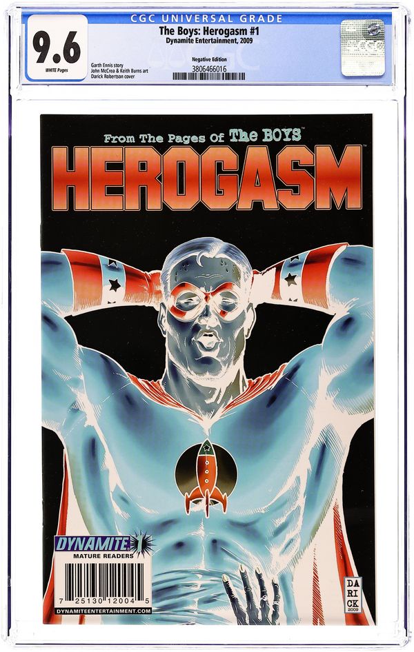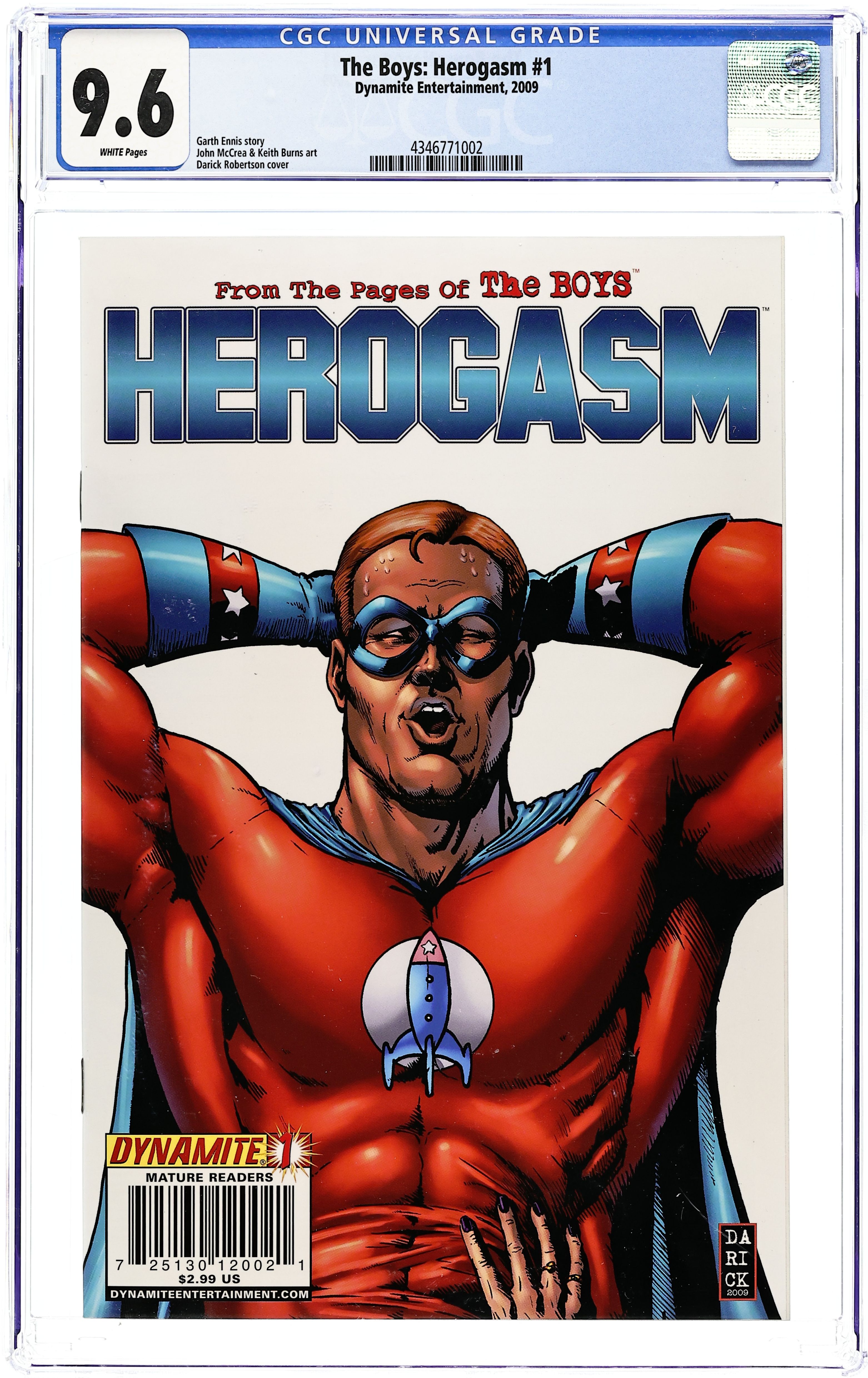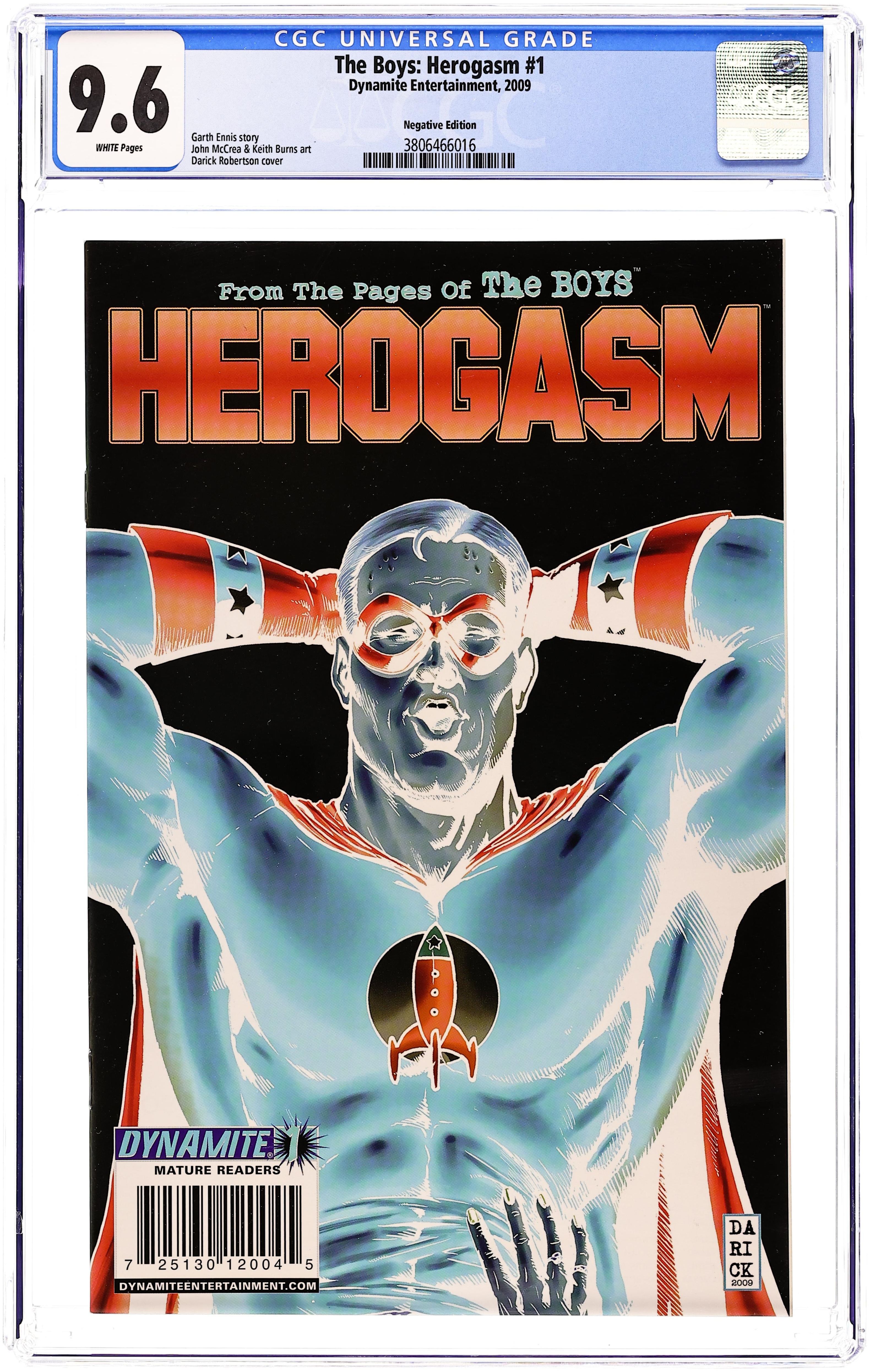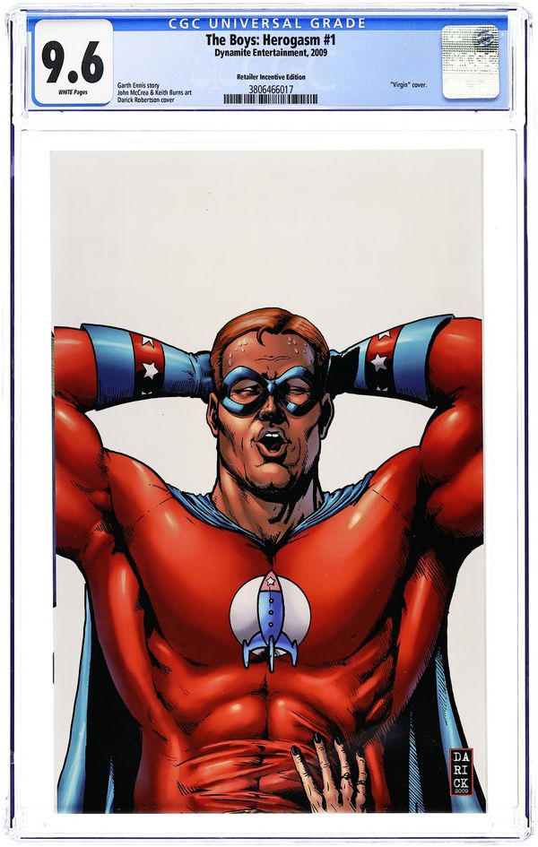 Limited Edition (1 for 15) Variant Cover. Written by Garth Ennis. Art by John McCrea. An evil so profound it threatens all mankind... the mightiest heroes on the planet uniting to defend us all... a secret crisis of such utter finality that a countdown to civil or infinite war seems unavoidable... but have you ever wondered what really happens during Crossovers? The Seven, Payback, Teenage Kix, Fantastico and every other supe on Earth team up for an annual event like no other... and where the supes go, can a certain 'five complications and a dog' be far behind? Vought-American prepare to make their move, in a story that will change the world of the Boys forever: Herogasm #1. The first-ever Boys spin-off mini-series features the pairing of Ennis with Hitman artist John McCrea! Cover price $2.99.