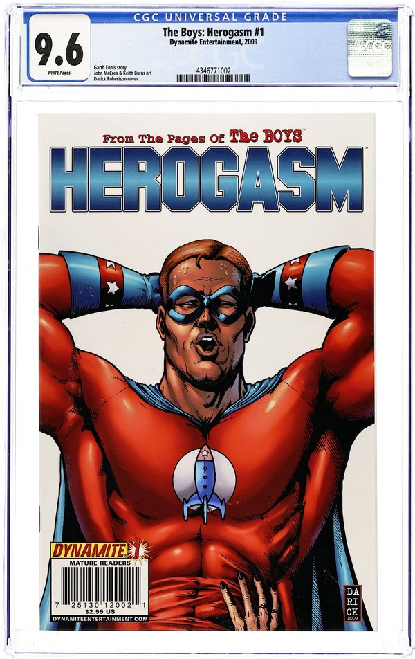 Limited Edition (1 for 25) Variant Cover. Written by Garth Ennis. Art by John McCrea. An evil so profound it threatens all mankind... the mightiest heroes on the planet uniting to defend us all... a secret crisis of such utter finality that a countdown to civil or infinite war seems unavoidable... but have you ever wondered what really happens during Crossovers? The Seven, Payback, Teenage Kix, Fantastico and every other supe on Earth team up for an annual event like no other... and where the supes go, can a certain 'five complications and a dog' be far behind? Vought-American prepare to make their move, in a story that will change the world of the Boys forever: Herogasm #1. The first-ever Boys spin-off mini-series features the pairing of Ennis with Hitman artist John McCrea! Cover price $2.99.
