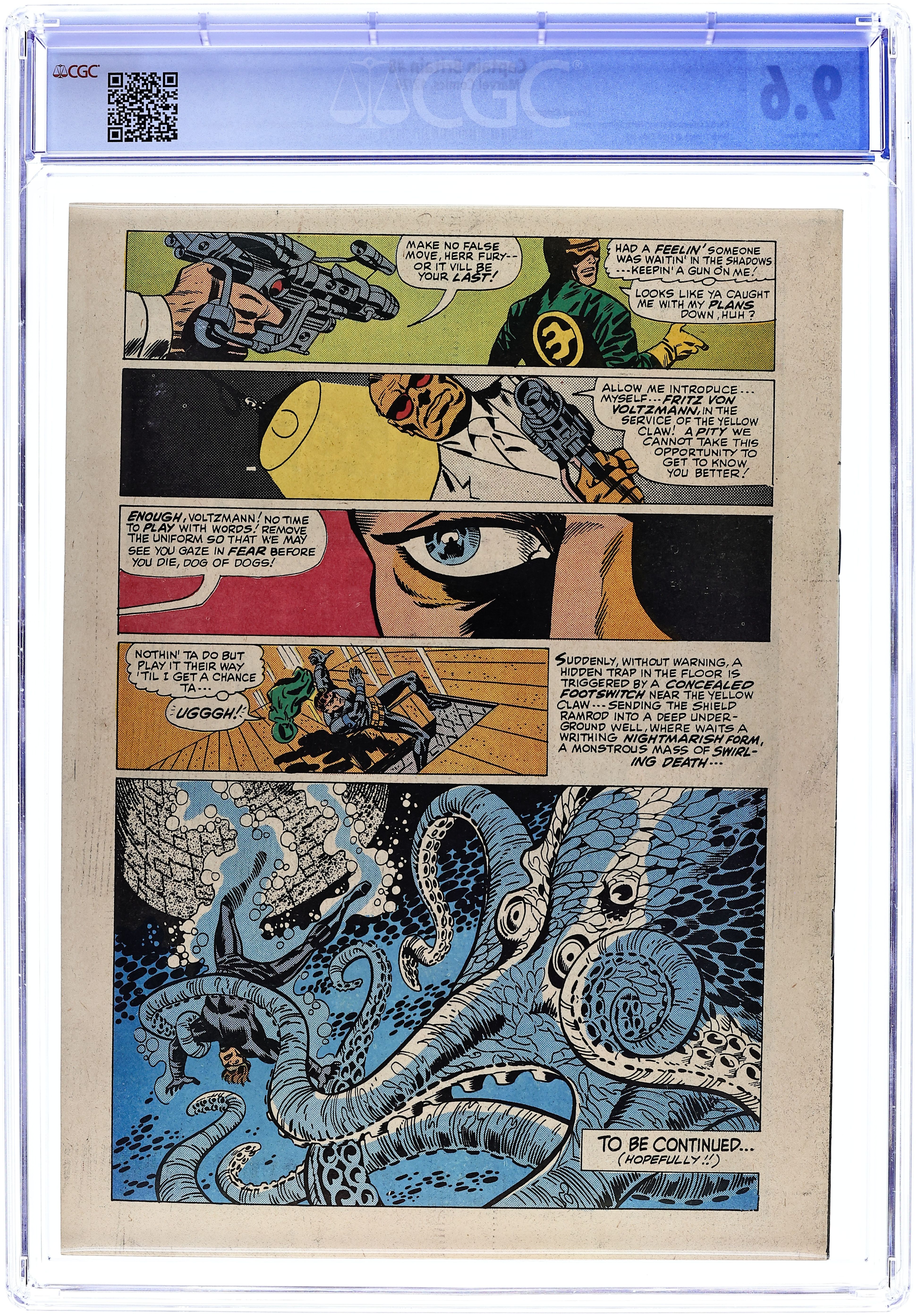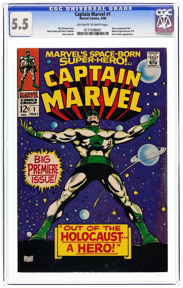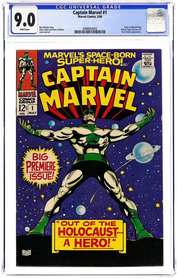 Cover pencils by Gene Colan, inks by Vince Colletta. "From The Void Of Space Comes," script by Roy Thomas, pencils by Gene Colan, inks by Vince Colletta; Skrull emperor Dorrek VII has become aware of recent activity on Earth involving the Skrull's age old enemies the Kree, most notably the recent activation of the Kree Sentry; Seeking to find out the truth of the Kree's involvement on Earth, Dorrek calls the Super-Skrull back to the Skrull home world from his exile after his last defeat at the hands of the Fantastic Four; The Super-Skrull is ordered to find out what their enemies are up to, and kill Mar-Vell; The reward for success would be anything the Super-Skrull desired; Wanting to be married to the emperors daughter Anelle, the Super-Skrull accepts the mission and returns to Earth; There, Mar-Vell has just returned from his battle against the Sentry to find that his carrying bag has been stolen from his room. Suspecting the owner of the hotel, and fearing that tampering may have activated the self-destruct mechanism on it, Mar-Vell rushes out to find the hotel owner; The owner himself is on his way to the Cape with to turn over to the military there. 36 pgs., full color. Cover price $0.12.