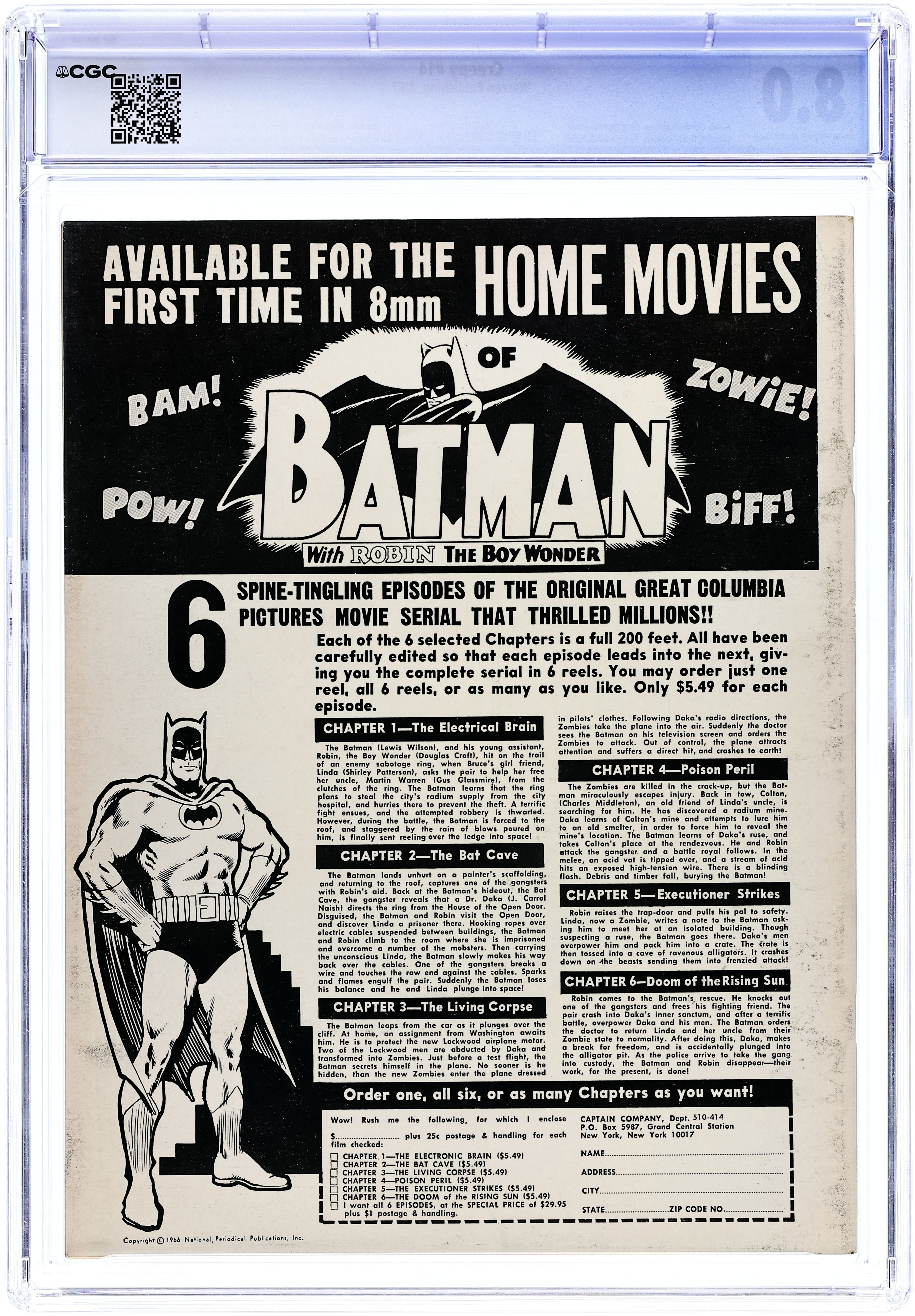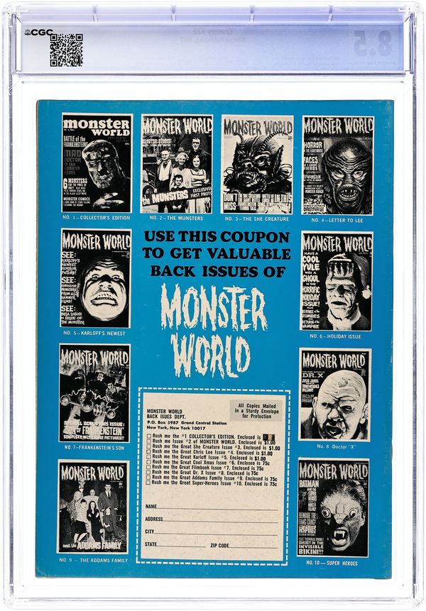 Cover by H.B. Harris. Edited by Bill Parente. Stories by Archie Goodwin, John Benson, Bhob Stewart, and Johnny Craig. Art by Frank Frazetta, Angelo Torres, Dan Adkins, Rocke Mastroserio, Wally Wood, Neal Adams, and Johnny Craig. Reprints from the early years of the influential horror comics magazine. A Frazetta werewolf one-pager; a monster rises from the grave. 8 1/2 in. x 11 in. 52 pages, B&W. Mature readers. Cover price $0.50.