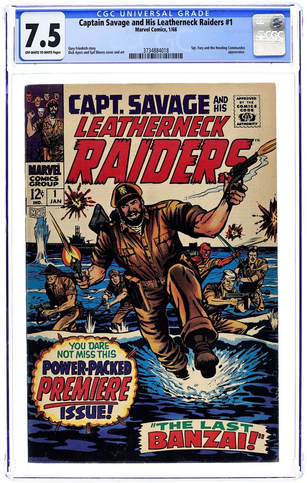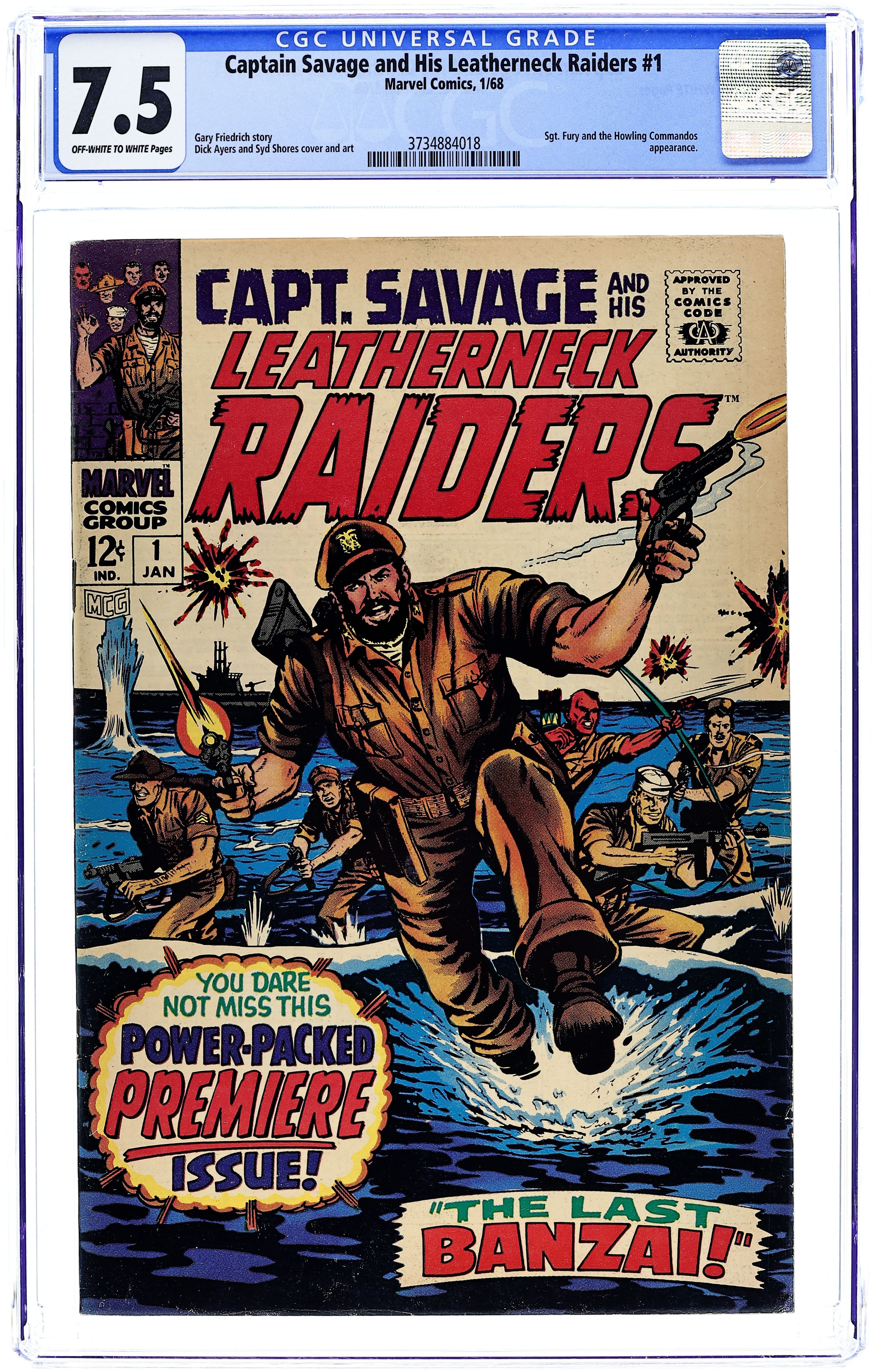 "The Last Banzai!" Fully titled Captain Savage and His Leatherneck Raiders (at least for the first eight issues), this 19-issue series takes place in the Pacific theater of World War II. This first issue finds Savage and his team invading Tarawa. Includes guest appearances by Sgt. Fury and Dum Dum Dugan. Script by Gary Friedrich, pencils by Dick Ayers, inks by Syd Shores. Cover by Ayers and Shores. Cover price $0.12.