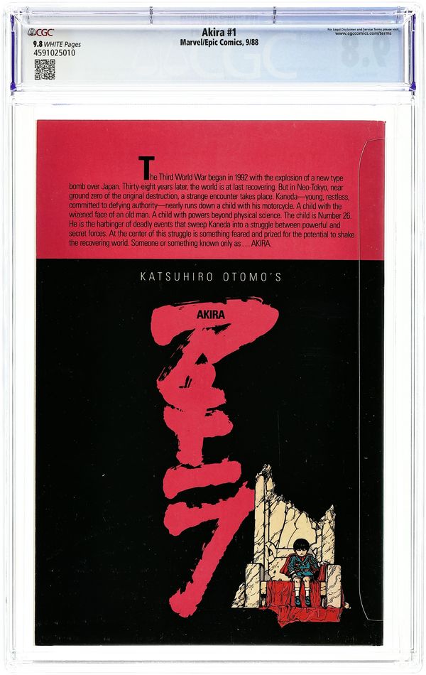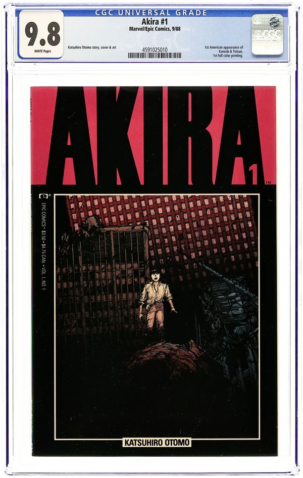 1st printing. Here it is – the first English translation of Katsuhiro Otomo's influential manga series, paving the way for the manga and anime craze to blossom in the English-speaking world. Decades after a mysterious explosion destroys Tokyo, teen bikers Tetsuo and Kaneda encounter a child with the face of an old man; his strange powers hold the key to the mystery. Story, art and cover by Otomo. Color by Steve Oliff, who pioneered the use of computer coloring with this series. Also includes an introductory article by Archie Goodwin. Mature readers. Cover price $3.50.