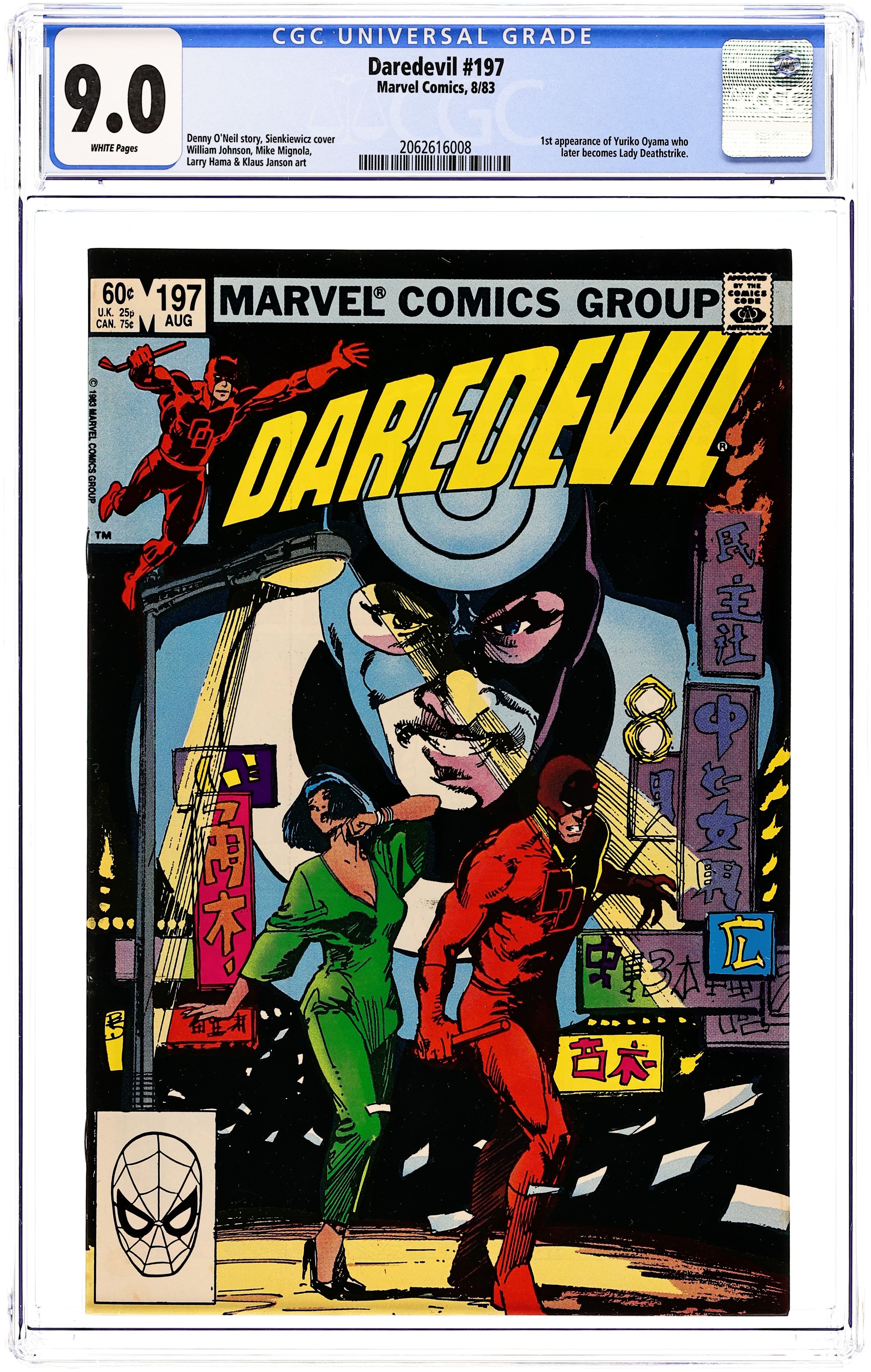 Cover art by David Mazzucchelli. Lies starring Daredevil, Foggy Nelson, Debbie Harris, Becky Blake, Glorianna O'Breen, Kingpin, Micah Synn, and Vikah, script by Denny O'Neil, pencils by David Mazzucchelli, inks by Danny Bulanadi and Pat Redding; Kingpin and DD begin their assault on Synn. 32 pgs. Cover price $0.60. Cover price $0.60.