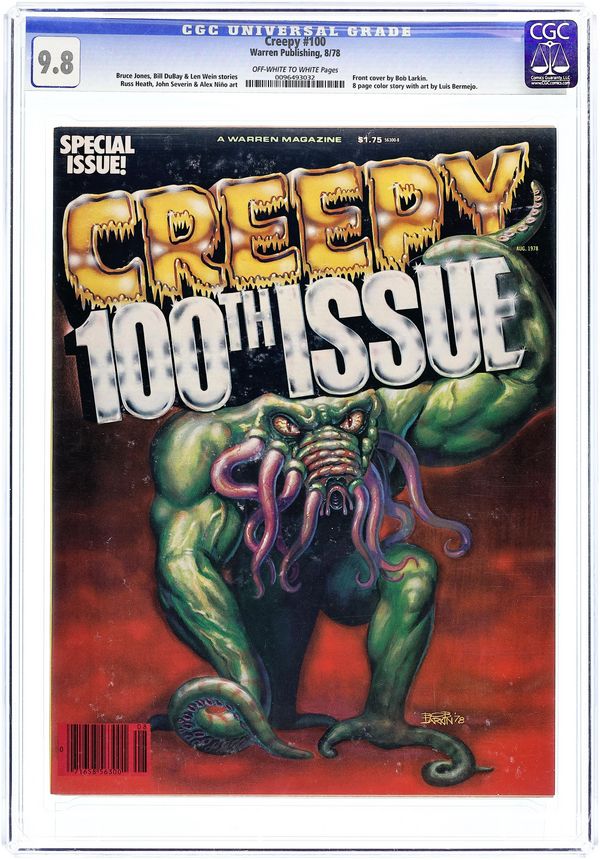 Stories in this last issue of Creepy magazine, which was published by Harris Publications, include: Sex Kitten by S.K. Pierce an Bill Wray; Creeps by Archie Goodwin, John Severin, and Wally Wood; Yellow Heat by Bruce Jones and Russ Heath; ...The Dump Man by Stephen Perry and Eric Shanower; Too Many Termarrows by Timothy Moriarty and Vic Catan; Dead Run by Jeff Jones; A Base and Nasel Hunger by Stephen Perry and Steve Bissette; Sacrifice by Roger McKenzie and Luis Bermejo; Grave Undertaking by Archie Goodwin and Alex Toth; To Kill a God! by Wally Wood; The Super-Abnormal Phenomena Survival Kit! by Jim Stenstrum and John Severin; Werewolf! by Larry Ivie and Frank Frazetta; Creepy's Loathsome Lore: Mummy's Curse! by Archie Goodwin and Roy G. Krenkel; The Machinations of Lust by S.K. Pierce, Mike Harris, and Greg Theakston; and No (Horse) Laughing Matter by Doug Moench and Rafael Auraleon. Cover art by Richard Corben. Cover price $2.95.