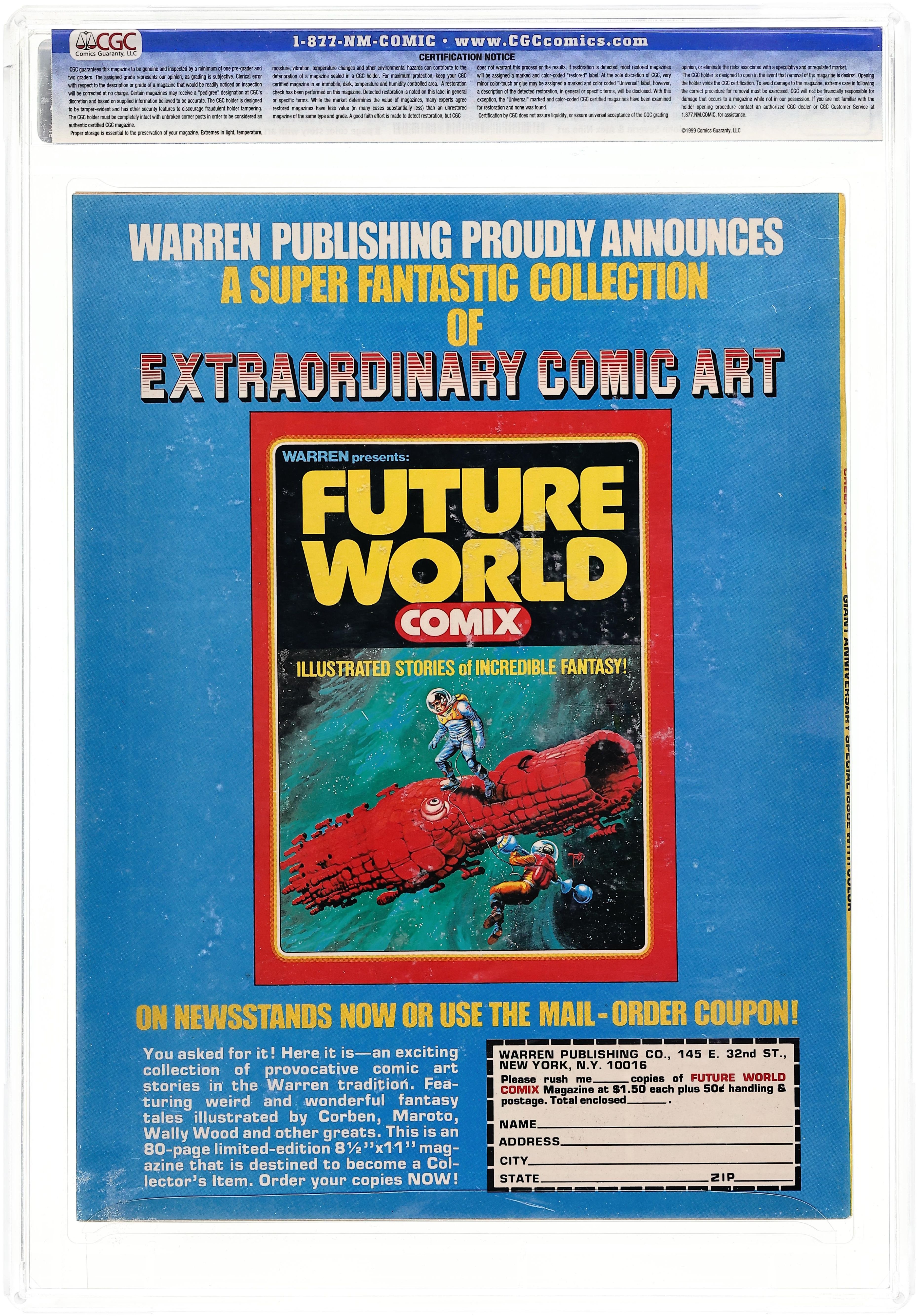 Cover by H.B. Harris. Edited by Bill Parente. Stories by Archie Goodwin, John Benson, Bhob Stewart, and Johnny Craig. Art by Frank Frazetta, Angelo Torres, Dan Adkins, Rocke Mastroserio, Wally Wood, Neal Adams, and Johnny Craig. Reprints from the early years of the influential horror comics magazine. A Frazetta werewolf one-pager; a monster rises from the grave. 8 1/2 in. x 11 in. 52 pages, B&W. Mature readers. Cover price $0.50.