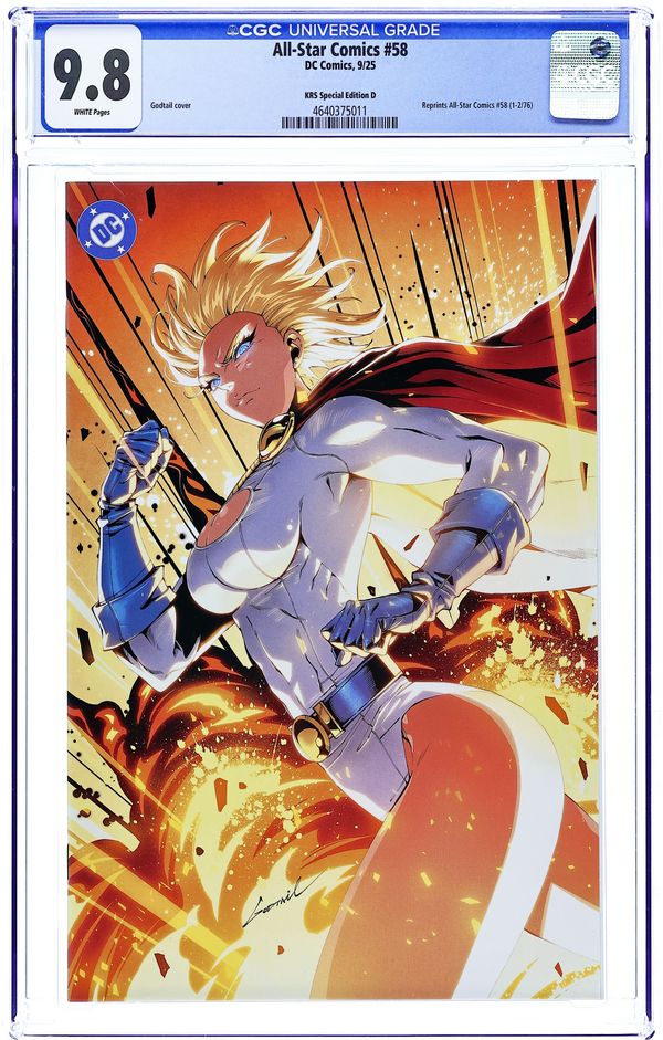 KRS Comics Exclusive "Power Girl" Foil Edition Virgin Cover by Will Jack - limited to 400 copies. Reprints All Star Comics (1940-1978) #58. Story by Gerry Conway. Art by Ric Estrada and Wally Wood. Originally distributed through blind bags.