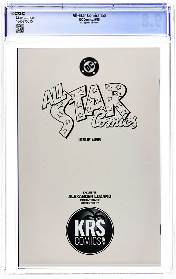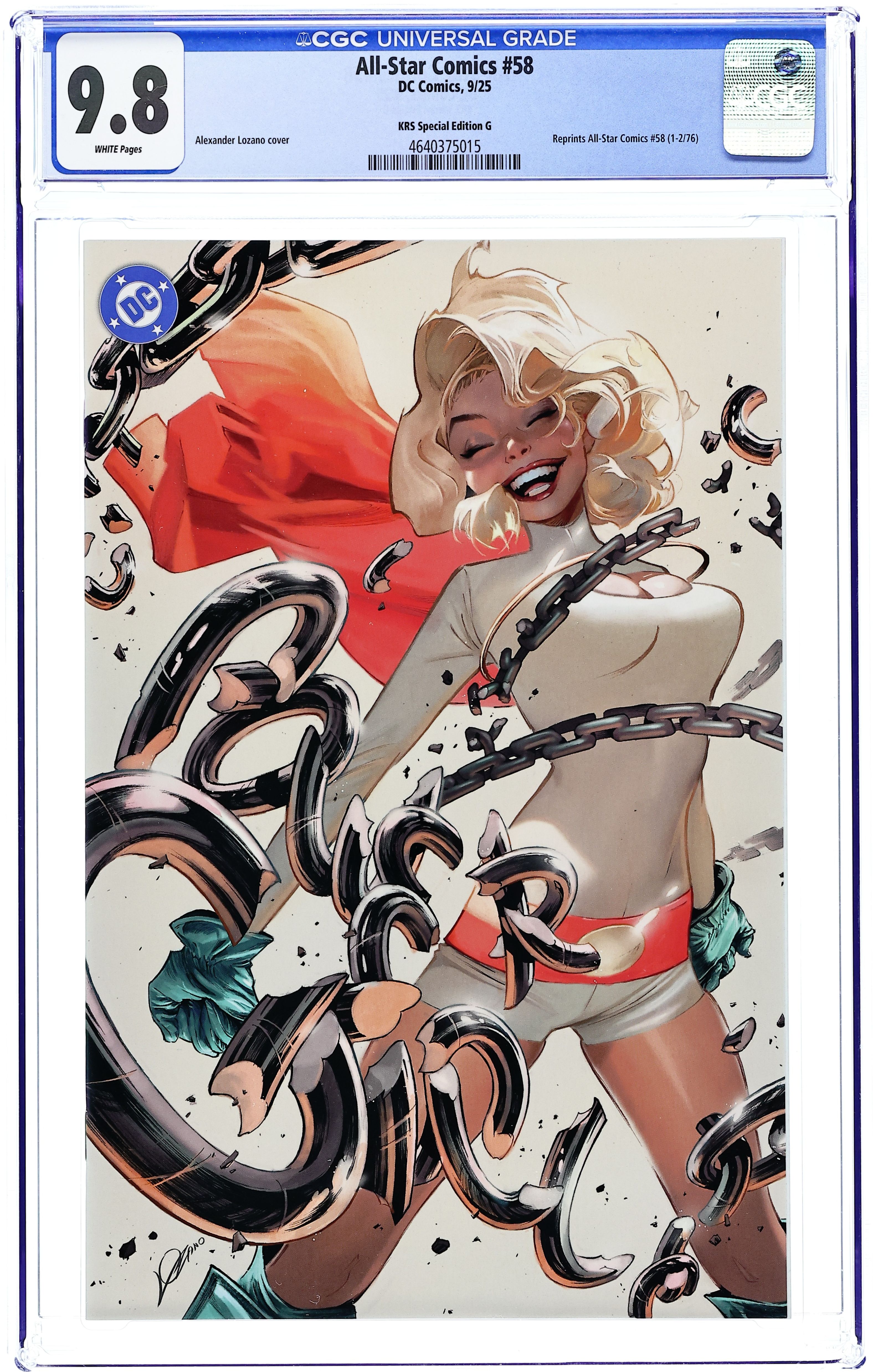 KRS Comics Exclusive Virgin Cover by Alexander Lozano - limited to 750 copies. Reprints All Star Comics (1940-1978) #58. Story by Gerry Conway. Art by Ric Estrada and Wally Wood. Originally distributed through blind bags.