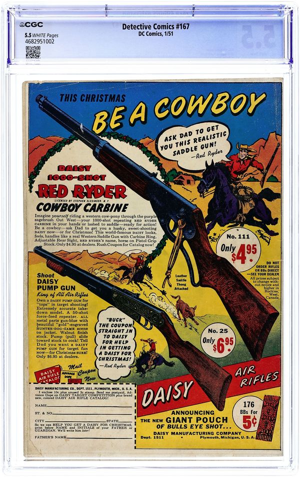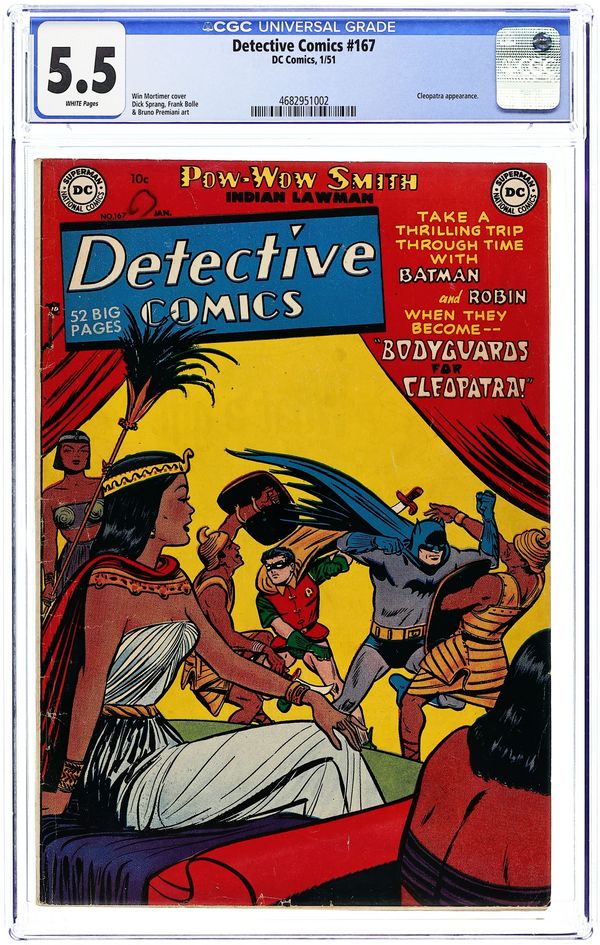 The new classic Batmobile gets introduced. Cover by Dick Sprang. Stories by Joe Samachson and unknown. Art by Dick Sprang, Charles Paris, Carmine Infantino, Dan Barry and unknown. After being injured in a wreck involving the Batmobile while chasing some crooks, Batman finds himself laid up, unable to fight crime...or so is thought by crookdom, who are soon introduced to the fearsome capabilities of the new Batmobile! Don't miss Batman and Robin in "The Batmobile of 1950!" by Joe Samachson, Dick Sprang and Charles Paris. Plus: Pow-Wow Smith, Indian Lawman in "The Great Gold Robbery!" with pencils by Carmine Infantino; Robotman in "To Arms!"; and Impossible -- But True! tale "The Beauty Who Talked with Beasts!" (featuring Roy Raymond) with art by Dan Barry. Also: Ton o' Fun 1-pager by Harry Lampert, reprinted from Green Lantern (1941-1949 Golden Age) #21; Varsity Vic 2-pager by Henry Boltinoff; 2-page text piece "TV Quiz"; and "The First!" 1-pager. And: 1-page public service announcement "Batman and Robin Stand Up for Sportsmanship!" by Jack Schiff and Win Mortimer. 52 pages, full color. Cover price $0.10.