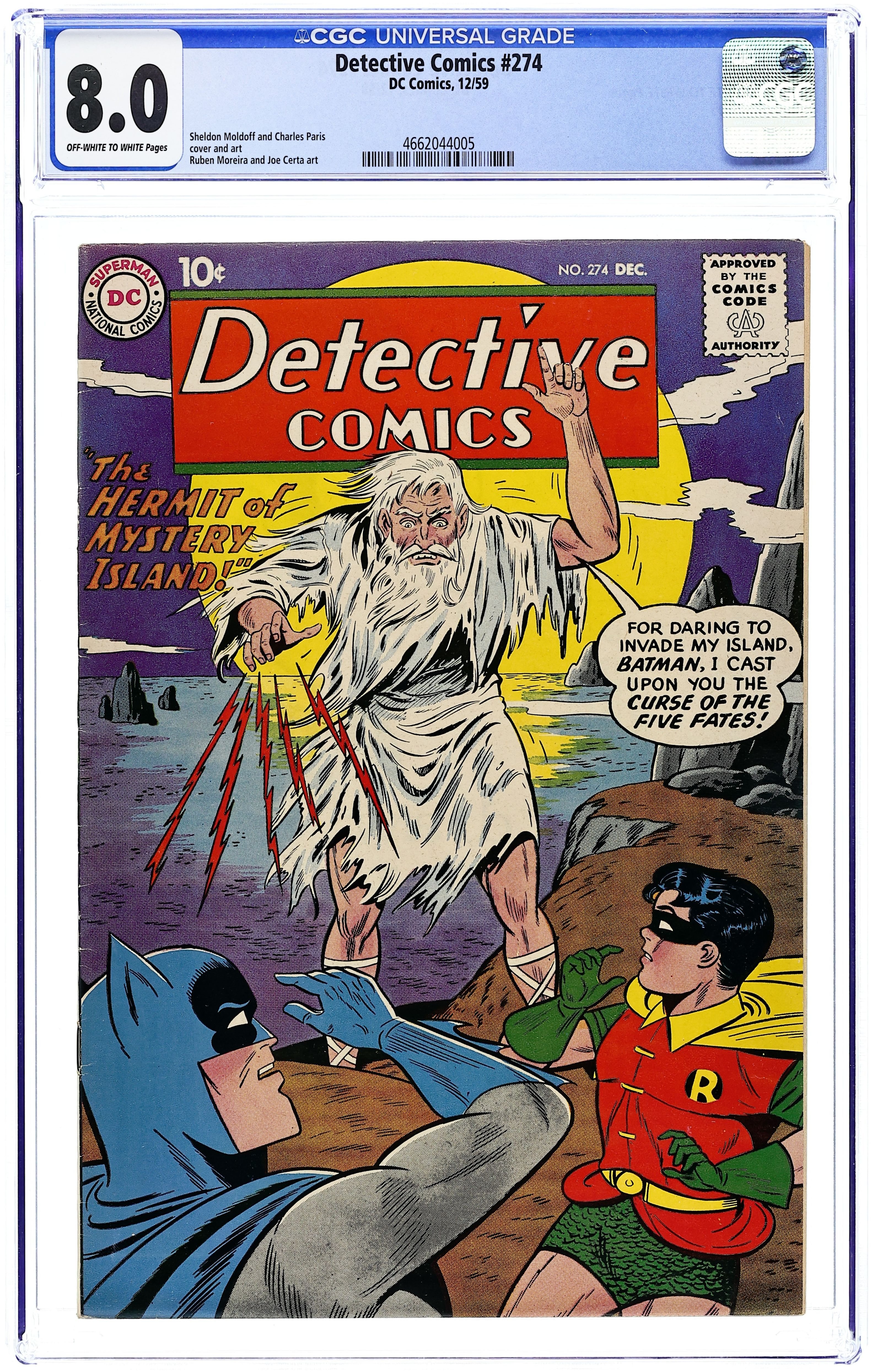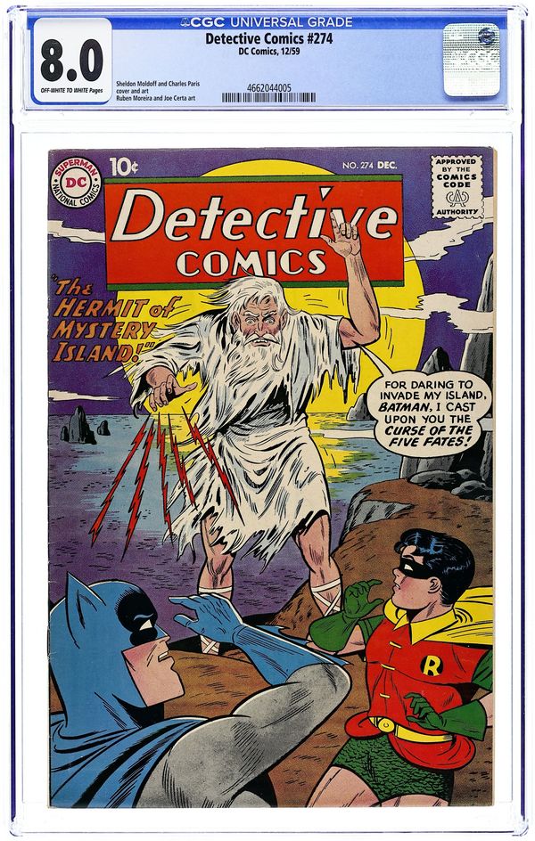 Cover art by Sheldon Moldoff and Charles Paris. "The Hermit of Mystery Island" starring Batman and Robin, pencils by Sheldon Moldoff, inks by Charles Paris; On a supposedly deserted island, Batman, Robin, and four gang-bosses encounter a strange hermit who predicts dire fates for all the crooks and Batman, which seem to come true; The criminals start dying one by one, and all of them almost meet their doom as the hermit predicted. The Atom Servant of Man public service announcement, script by Jack Schiff, art by Lou Cameron. Warden Willis humor page by Henry Boltinoff. "20th Century Genie" starring Roy Raymond TV Detective, art by Ruben Moreira; Roy vs. Jebel. Casey the Cop humor page by Henry Boltinoff. "The Human Flame" starring John Jones Manhunter from Mars, art by Joe Certa; The Human Flame is convinced fire is the Manhunter's weakness. 36 pgs., full color. Cover price $0.10.