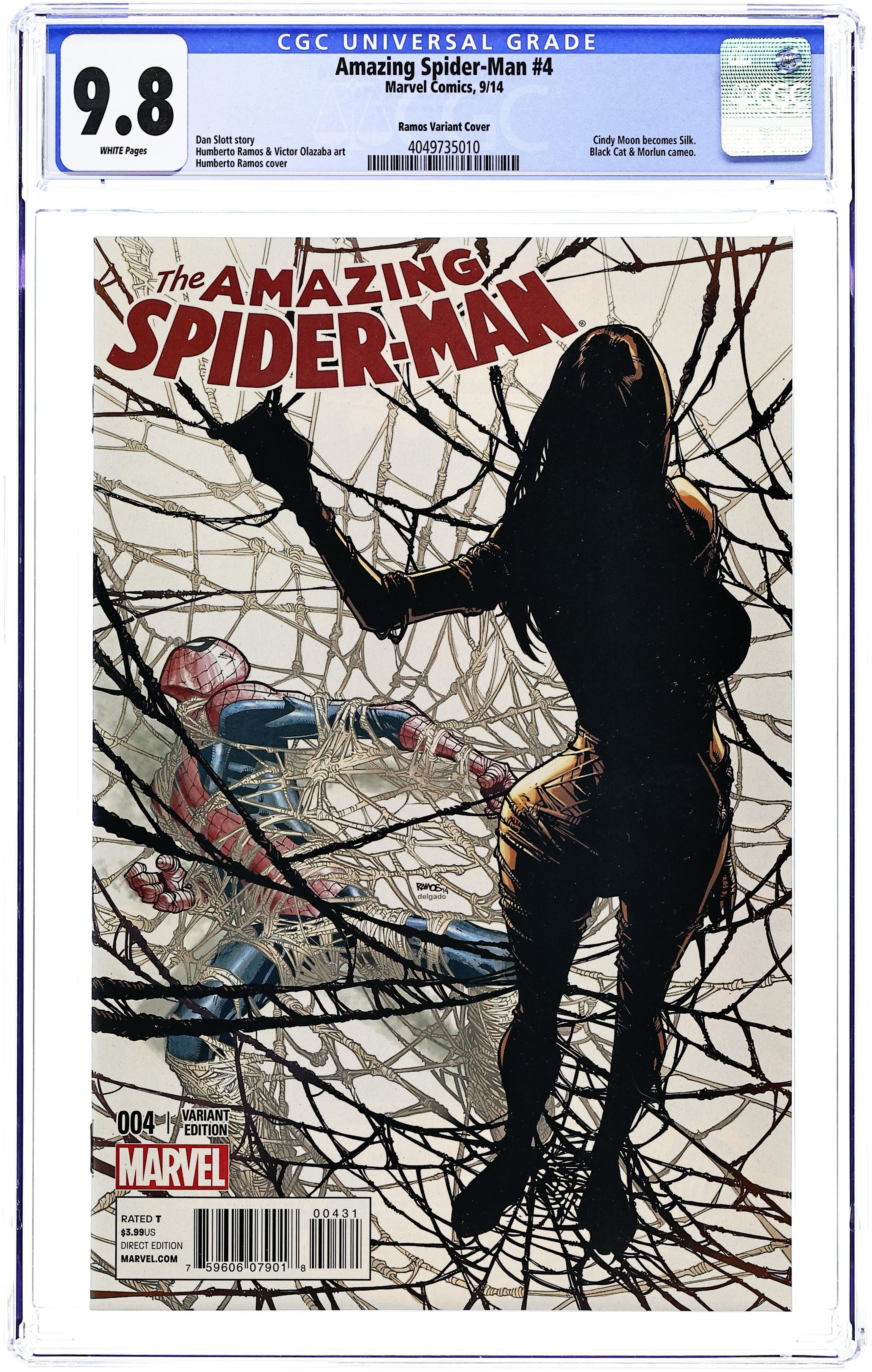 Limited 1 for 10 Retailer Incentive Variant Cover. Original Sin Tie-In (Spider-Verse Prelude) - Written by Dan Slott. Art and Cover by Humberto Ramos. ORIGINAL SIN tie-in! The radioactive spider that gave Peter Parker his powers bit someone else, too! Who is Silk and where has she been? Don't miss this incredible new character who will be a major Spider-player for the whole year! 28 pages, full color. Cover price $3.99.