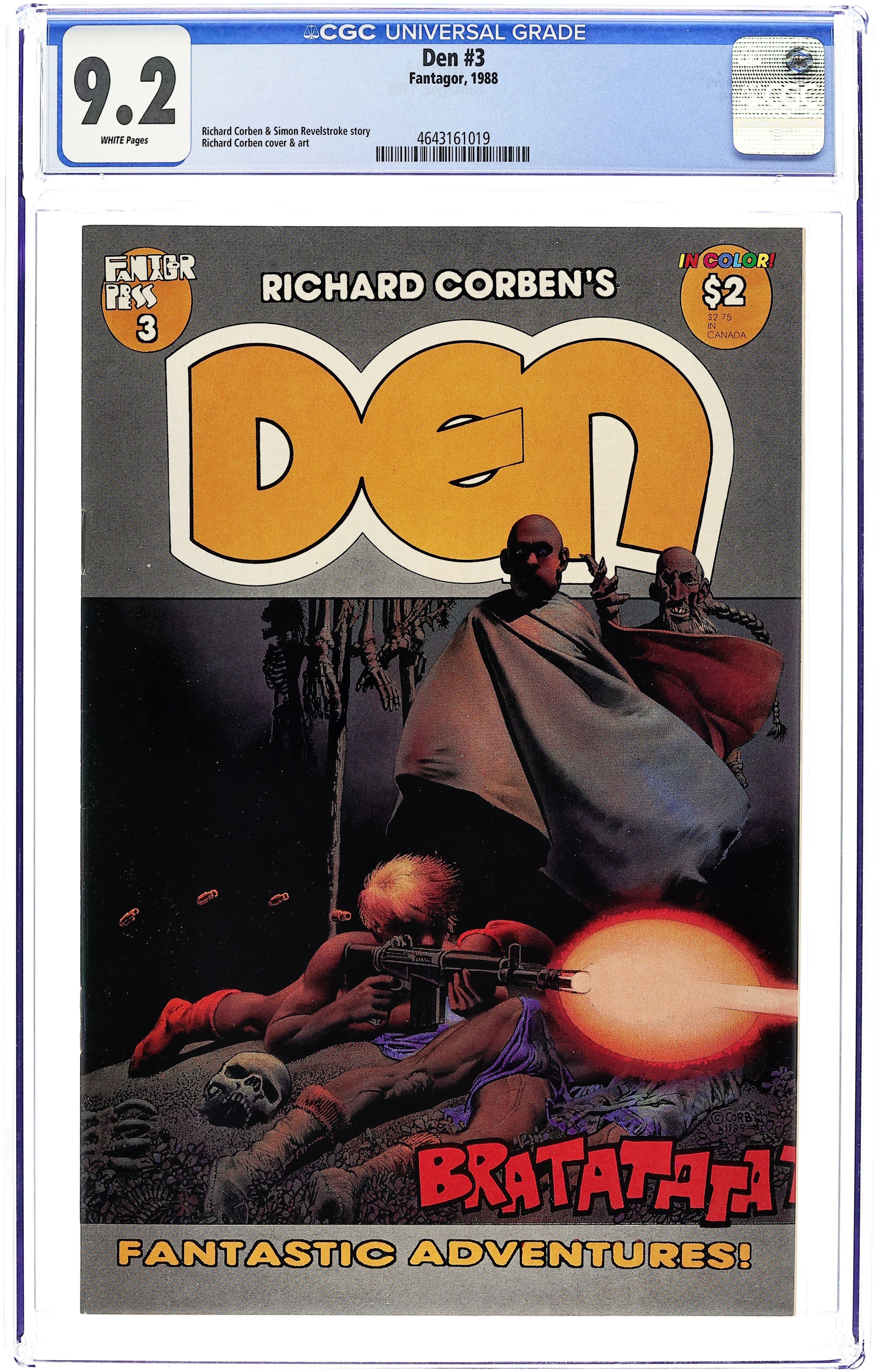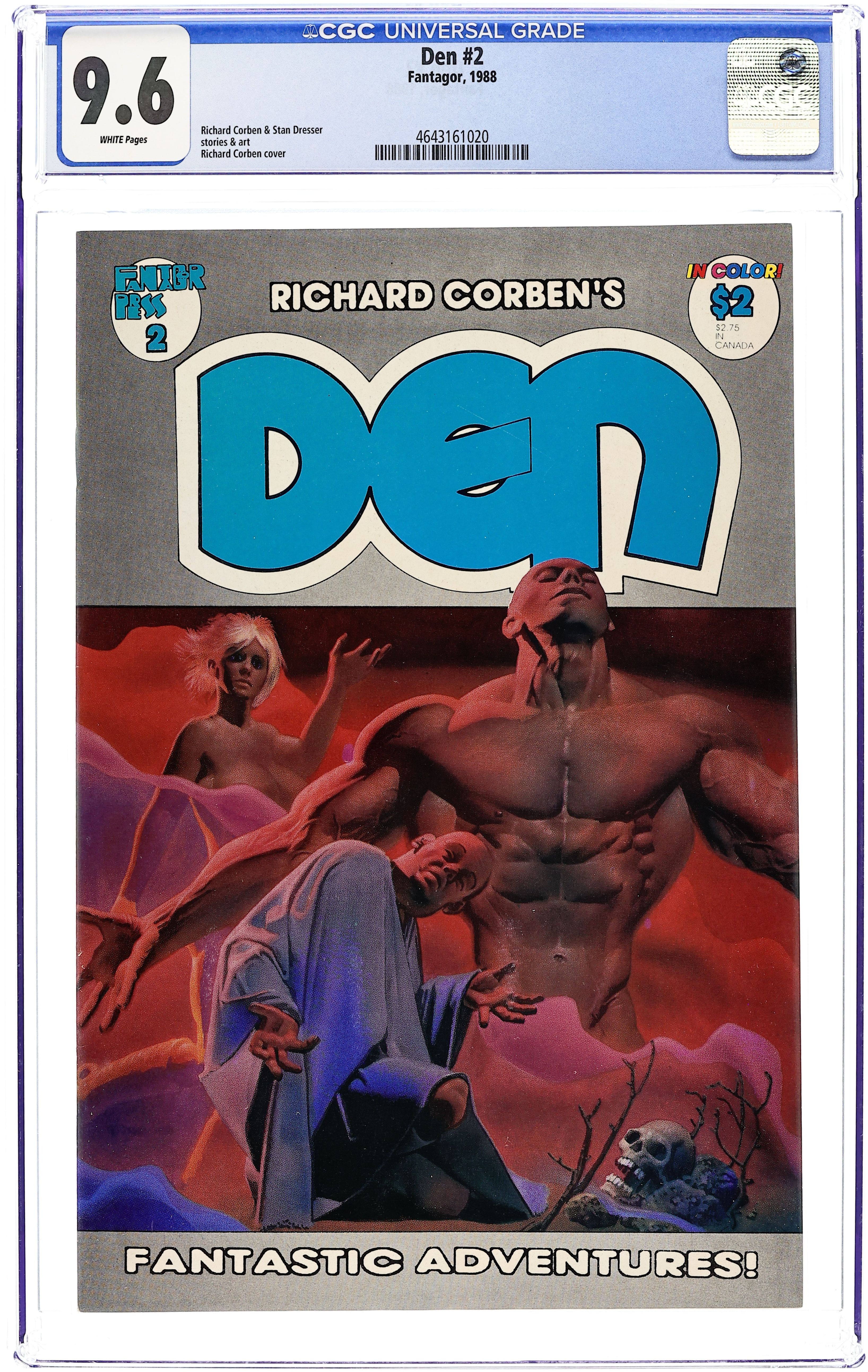 Den faces the Red Queen and The King of Air and Darkness, written by Simon Revelstroke. Also, "Encounter at War," written by Jan Strnad, revised and reprinted from Corbens earlier Fantagor comic, and a short Den story by Stan Dresser. Mature readers. Full color; 32 pages. Cover by Corben. Cover price $2.00.
