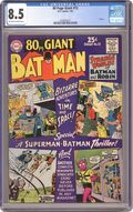 Batman 80 pg. Giant. Reprints. Cover art by Win Mortimer and Sheldon Moldoff. "The Captive Planet," script by Bill Finger, pencils by Sheldon Moldoff, inks by Charles Paris; Transported to the Planet Tora, The Dynamic Duo and their companions aid The Torans in their struggle against invaders. "The Caveman Batman," script by Edmond Hamilton, pencils by Dick Sprang, inks by Charles Paris; The Dynamic Duo travel back in time to clear Dr. Sayre's professional reputation, there they aid Tiger Man, an early "Batman" against the tyrant Borr. G. I. Joe toy ad. Binky Shows "How to Make New Friends!" public service announcement, script by Jack Schiff, art by Bob Oksner; Binky suggests Allergy make friends with a new kid, Bob, but Pete does instead and then gets Allergy and the rest of the gang interested. "King Batman the First," script by Bill Finger, pencils by Dick Sprang, inks by Sheldon Moldoff; Batman and Robin pursue the criminal Gurney into another dimension; there they get mixed up in a contest to find the new King of the alien world Plaxius. Cheerios ad featuring Rocky and Bullwinkle. "There Was a Crooked Man," script by Bill Finger, pencils by Jack Burnley, inks by Charles Paris; The Cowled Crimefighters stumble into a bizarre plot that seems to follow the story of the nursery rhyme "There Was a Crooked Man." "The Three Super-Sleepers," script by Edmond Hamilton, pencils by Dick Sprang, inks by Stan Kaye; The Titanic trio are kept in suspended animation for 1000 years; When they are revived, they must battle Lex Luthor's descendant whom they suspect has stolen the time machine that can restore them to their own time. "Batman's Roman Holiday," script by Edmond Hamilton, pencils by Dick Sprang, inks by Charles Paris; Batman and Robin go back to Roman times to rescue Dr. Nicholls who has not returned from his own trip. "The Interplanetary Batman," script by Bill Finger, art by Sheldon Moldoff; The Dynamic Duo is transported to the planet Ergon where they are jailed and must plan a breakout. "The Winged Bat-People," script by Bill Finger, pencils by Sheldon Moldoff, inks by Charles Paris; Batman and Robin find themselves in another dimension, there they are mistaken for two of the evil winged Bat People. Cap's Hobby Center by Henry Boltinoff. 84 pgs., full color. Cover price $0.25.