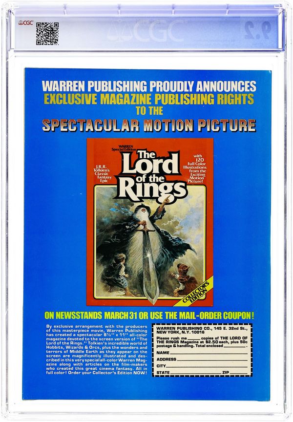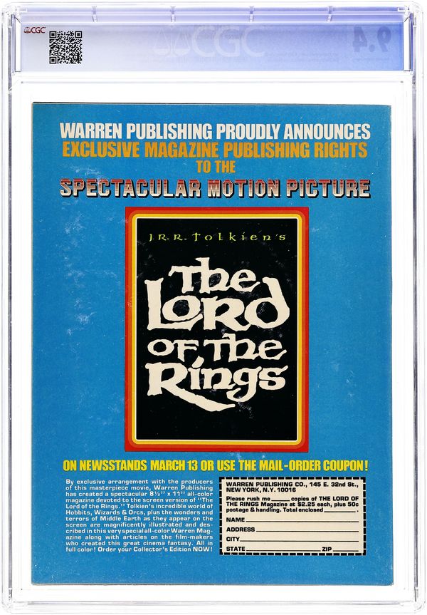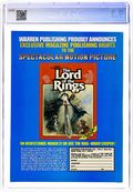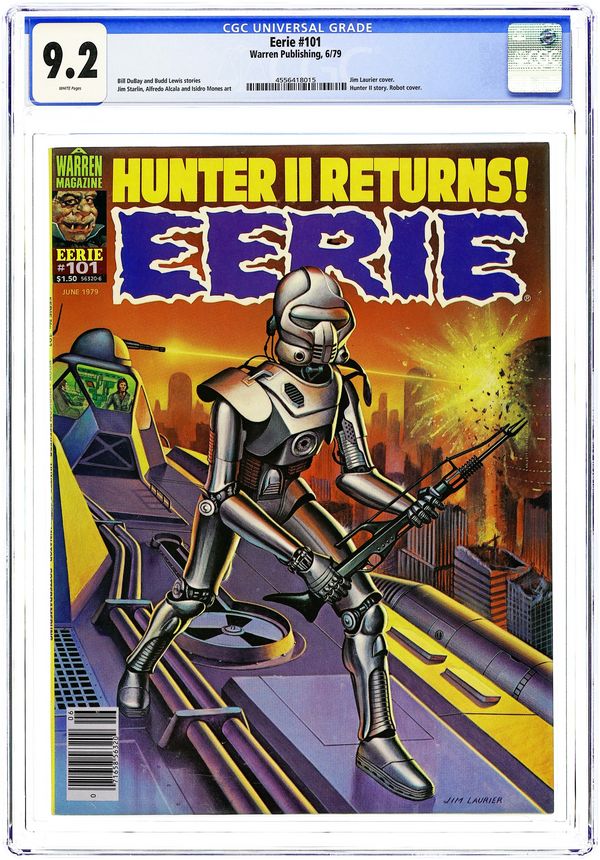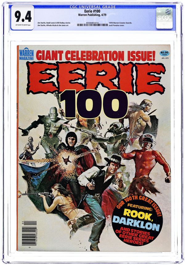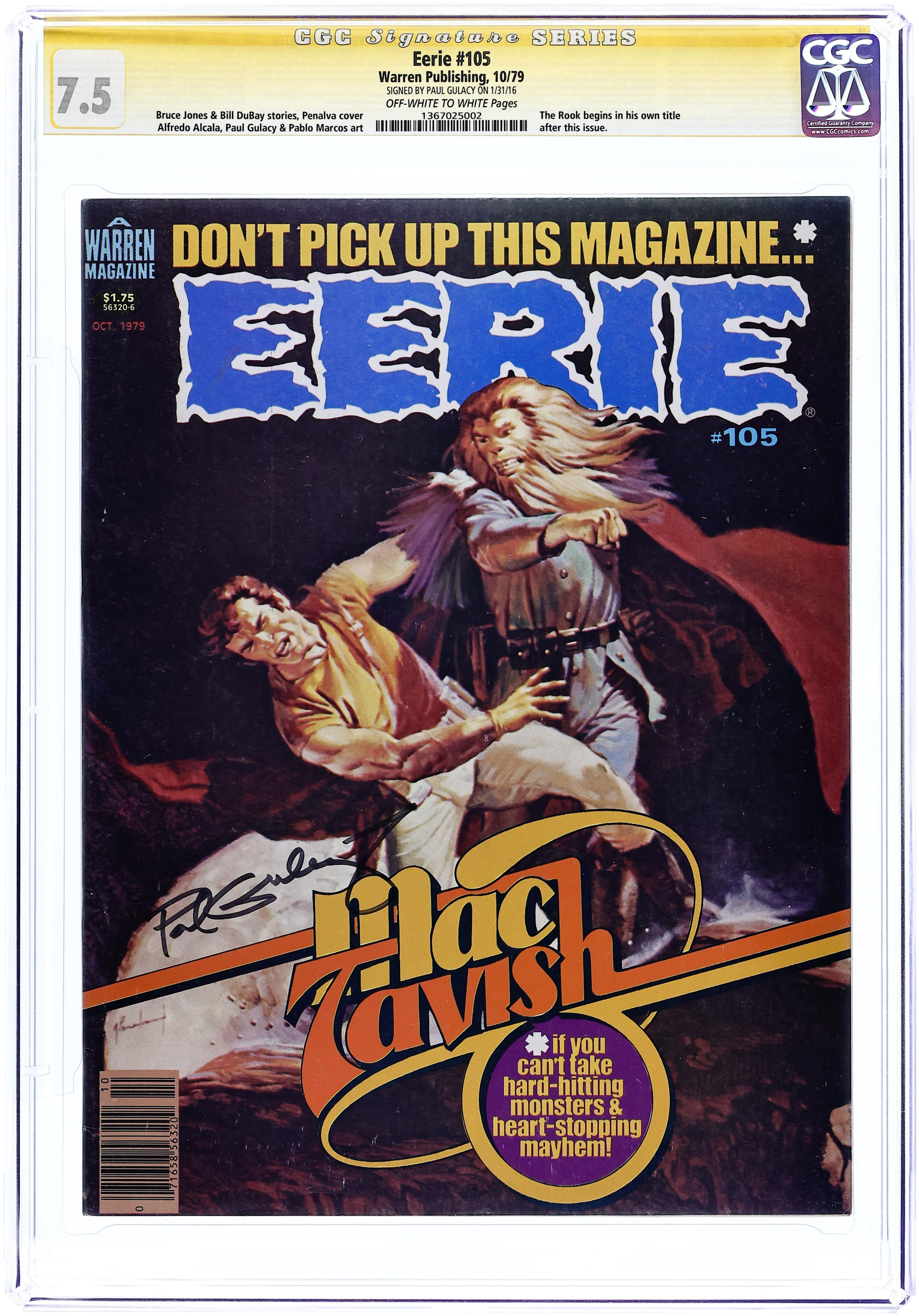 Cover by Kenneth Smith. Edited by Jim Warren. Stories by Archie Goodwin, Buddy Saunders, and Johnny Craig. Art by Gene Colan, Angelo Torres, Dan Adkins, Rocke Mastroserio, Gray Morrow, and Johnny Craig. Reprints from the horror comics magazine Eerie. A governess learns the horrifying truth about her new charge; a shipwrecked sailor tells a grisly story; a werewolf hunter will stop at nothing to catch his prey. 8 1/2 in. x 11 in. 68 pages, B&W. Mature readers. Cover price $0.60.