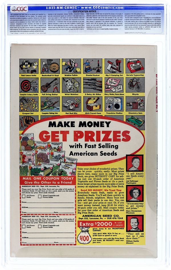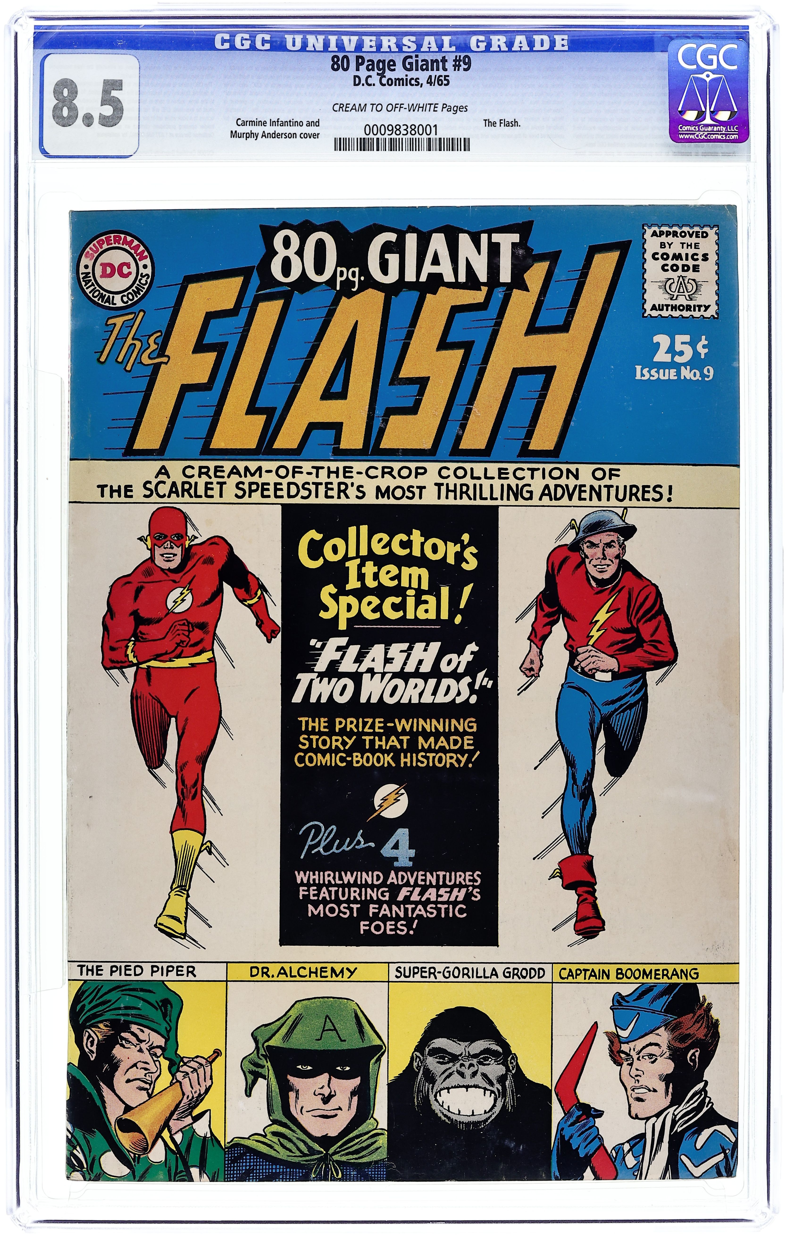 80-Page Giant. Flash reprints. Cover pencils by Carmine Infantino, inks by Murphy Anderson. "Flash of Two Worlds!", script by Gardner Fox, pencils by Carmine Infantino, inks by Joe Giella; The Flash disappears while giving an exhibition of his super speed; He finds that he has inadvertently vibrated into the Earth of another dimension which seems to be a near copy of his own world; Here he meets the Flash of that world, Jay Garrick. "Are You a Silent Witness?", script by Jack Schiff, art by Sheldon Moldoff; Kids learn that it pays to stick around and help the cops as a witness to a crime. Ad for Hasbro's G. I. Joe. Ads for Hawkman and The Atom. "The Pied Piper of Peril!", script by John Broome, pencils by Carmine Infantino, inks by Joe Giella; The Flash encounters a bizarre super villain who utilizes sound as a weapon of crime: The Pied Piper. Green Lantern ad. Amazing Speeds fact page. "The Man Who Changed the Earth!", script by John Broome, pencils by Carmine Infantino, inks by Frank Giacoia; As Mr. Element, Al Desmond nearly defeated the Scarlet Speedster with his mastery of elements; Newly armed with his "philosopher's stone," he re-emerges as Dr. Alchemy. "Here Comes Captain Boomerang!", script by John Broome, pencils by Carmine Infantino, inks by Murphy Anderson; Petty crook "Digger" Harkness becomes "Captain Boomerang" in order to publicize the Wiggins Game Company's new product; He does however, have his own plans—as a super criminal. "The Super-Gorilla's Secret Identity!", script by John Broome, pencils by Carmine Infantino, inks by Joe Giella; Grodd uses his evolution-accelerator to change into a human being—Drew Drowden, he then plots to rule the world! Detective Comics/Batman ad. The Flash ad. 84 pgs., full color. Cover price $0.25.