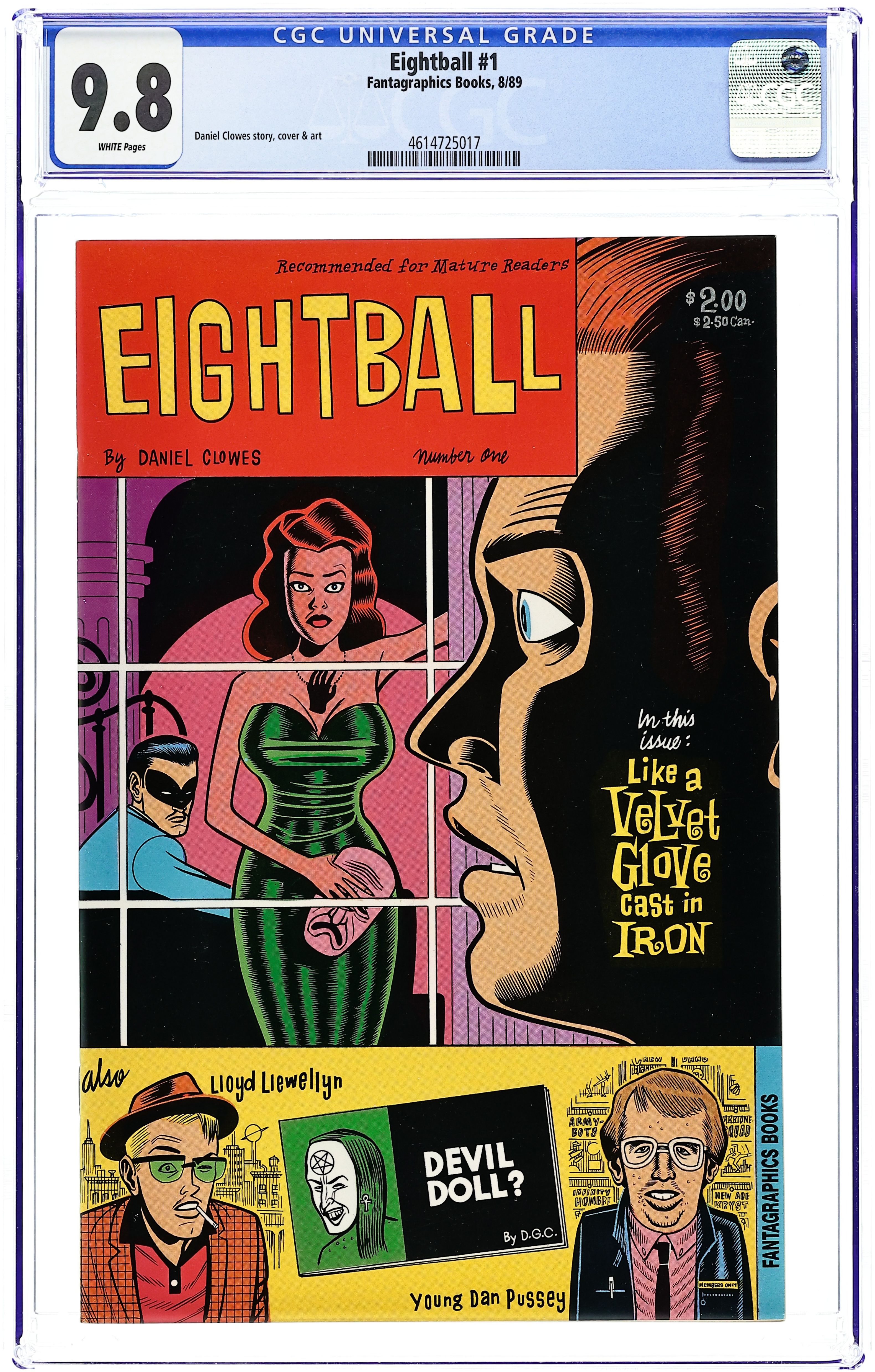Cover art by Daniel Clowes. Like a Velvet Glove Cast in Iron; Clay sees a strange and compelling film titled 'Like A Velvet Glove Cast In Iron' and attempts to discover more about it. The Laffin' Spittin' Man; Lloyd's philandering has unforseen consequences. Young Dan Pussey; Satire about monthly mass-produced super-hero comics. Scripts and art by Daniel Clowes. 36 pgs. $2.00. Cover price $2.00.